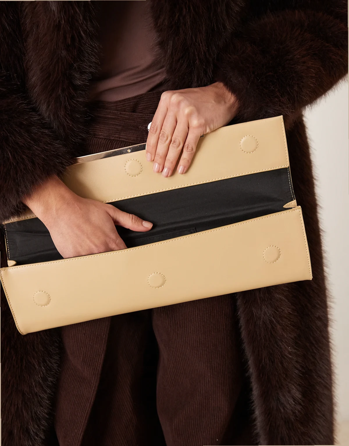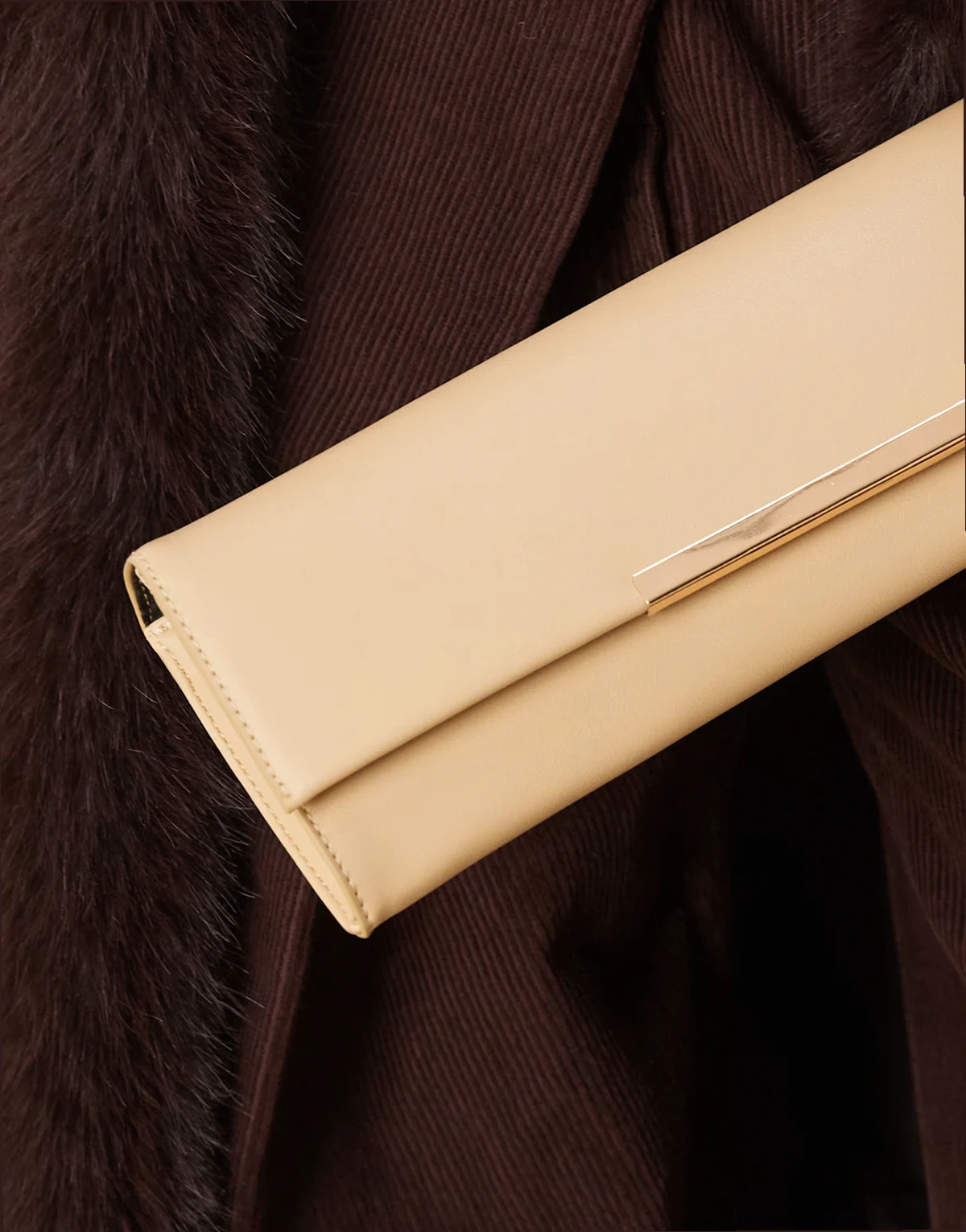 – Kremowa wąska wydłużona kopertówka z ozdobną sztabką