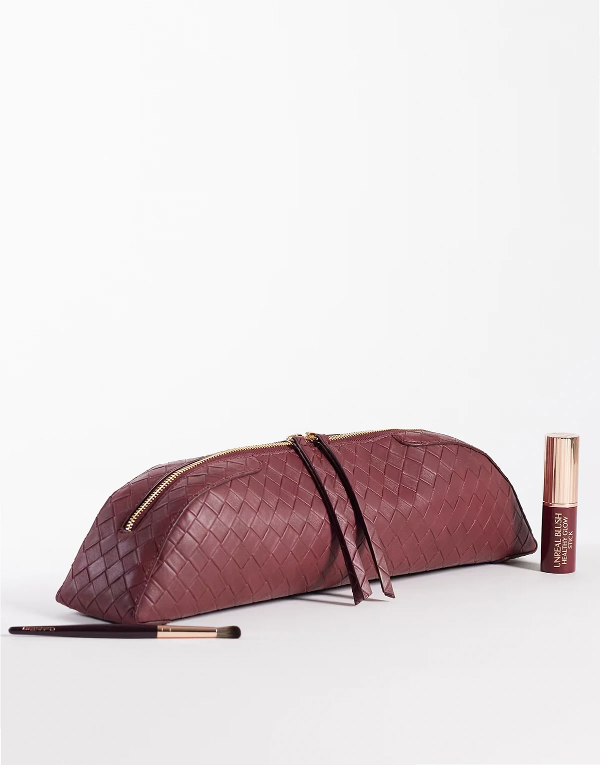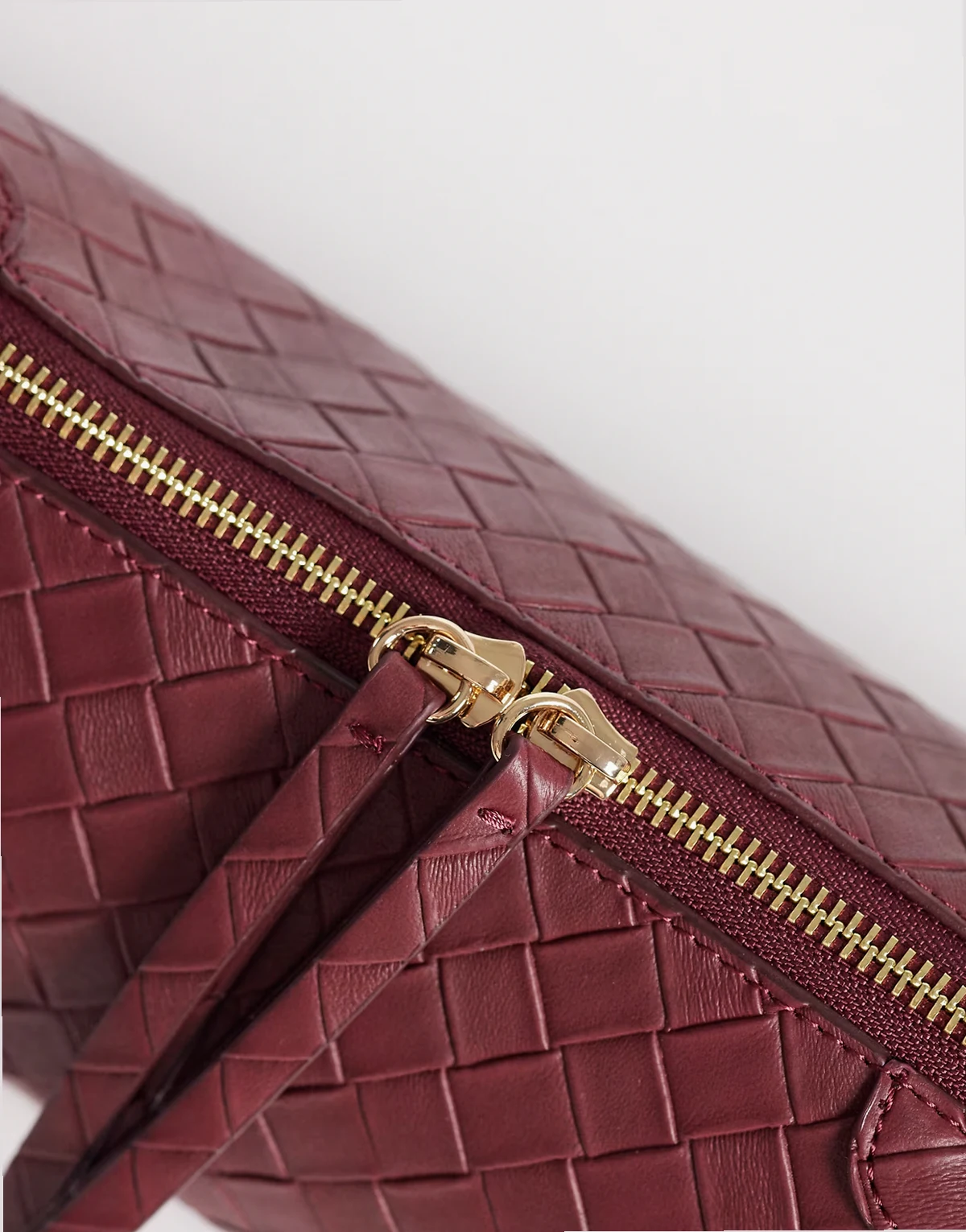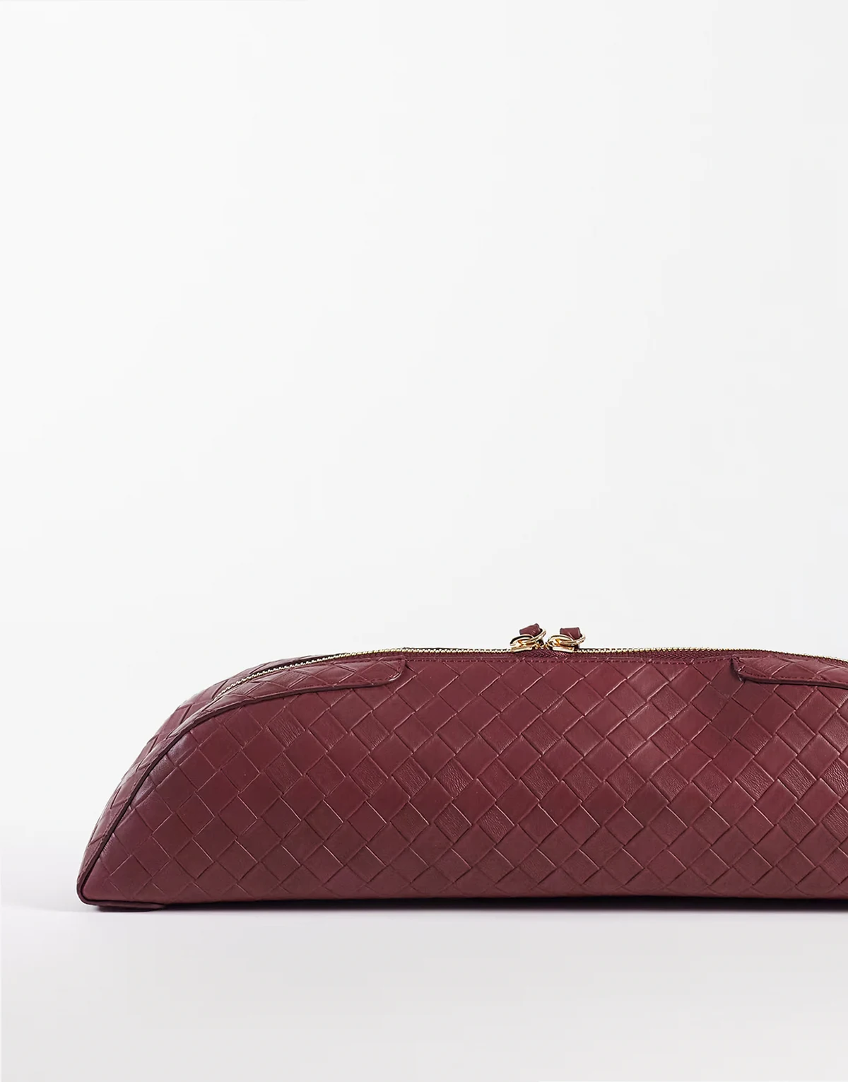 – Bordowa pleciona kopertówka o wydłużonym kształcie piórnika