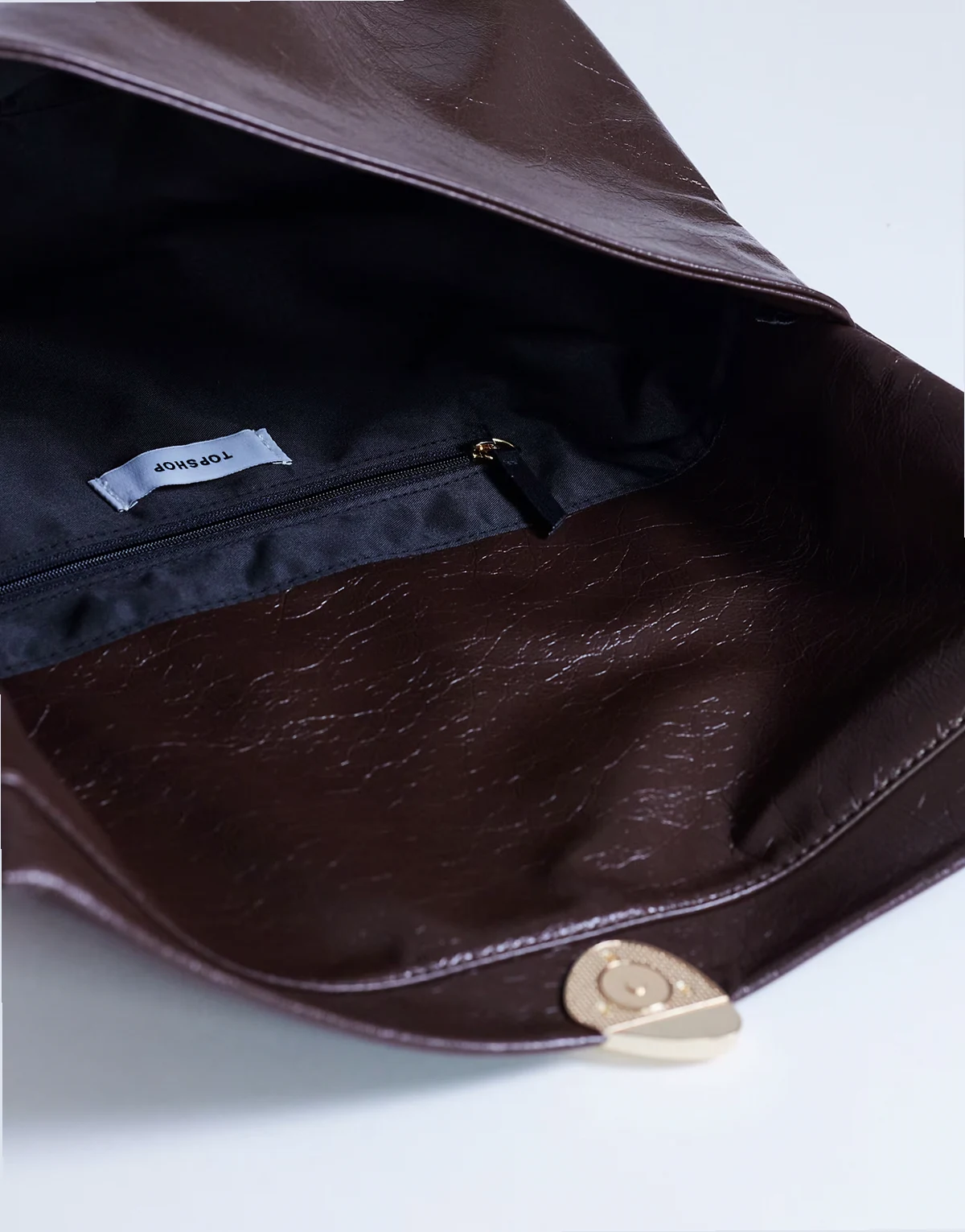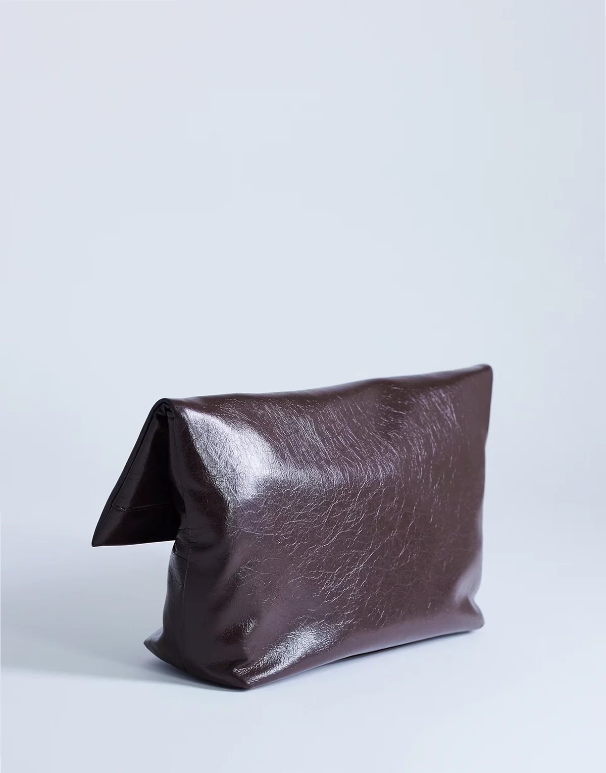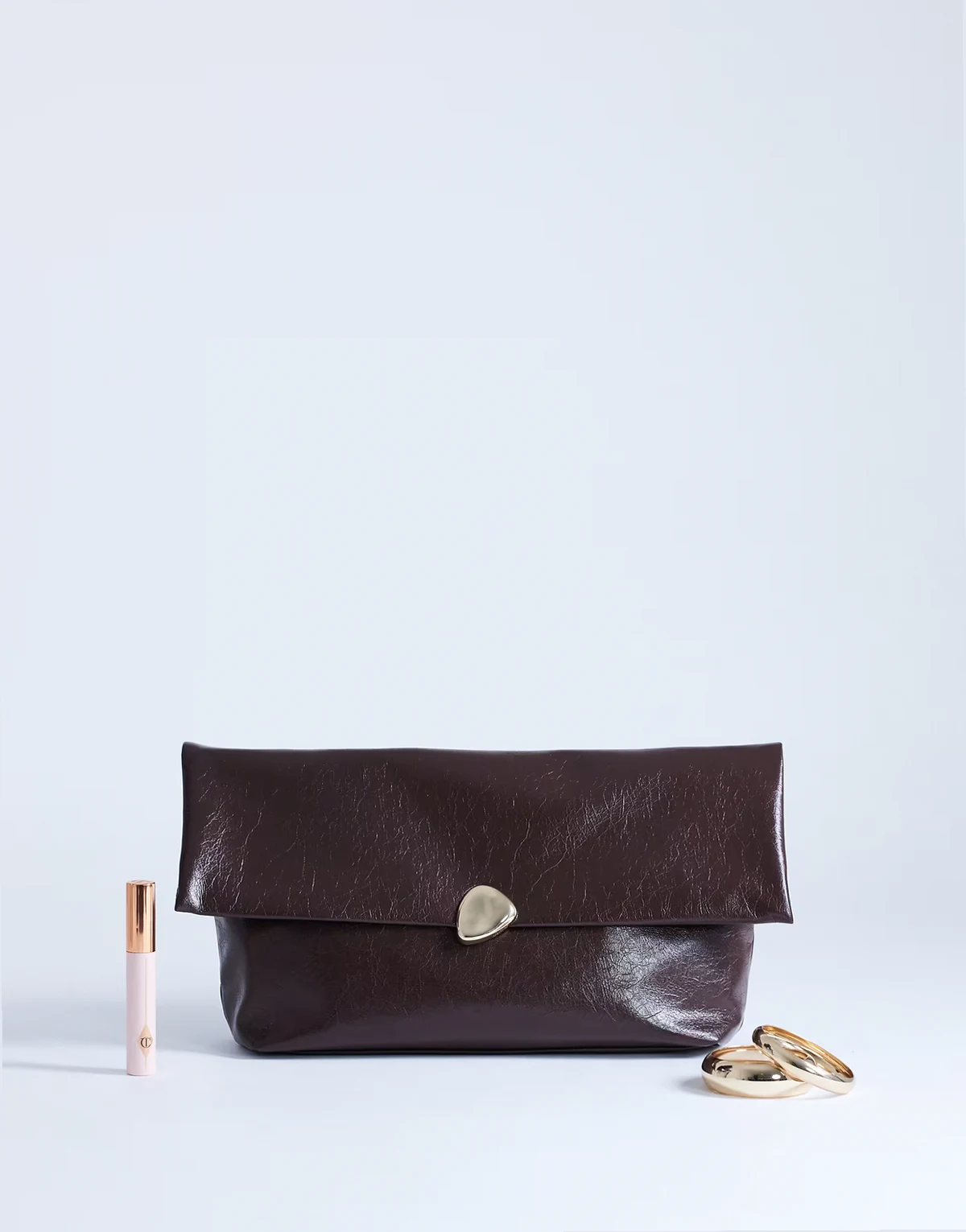 Kopertówka Gaia ma luźny fason, zwijaną górę i metalowy detal w kolorze złota. Jest zapinana na magnetyczne zapięcie i ma wewnętrzną kieszeń zapinaną na zamek. Ten produkt został zaprezentowany z innymi produktami. Każdy produkt jest sprzedawany oddzielnie.