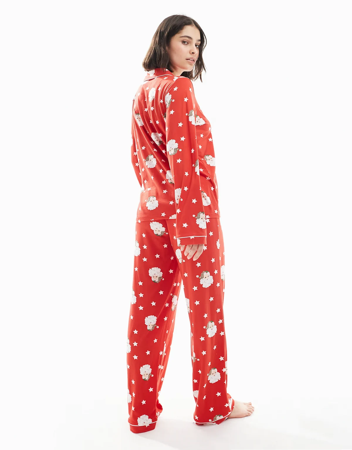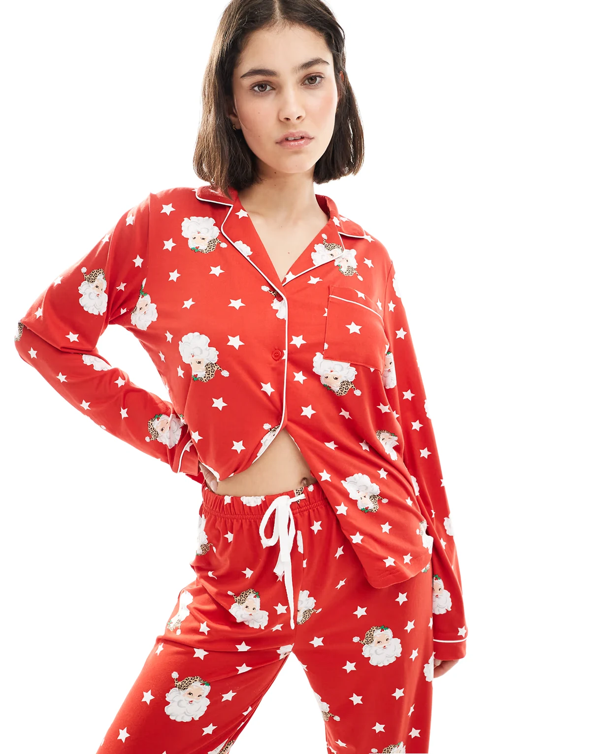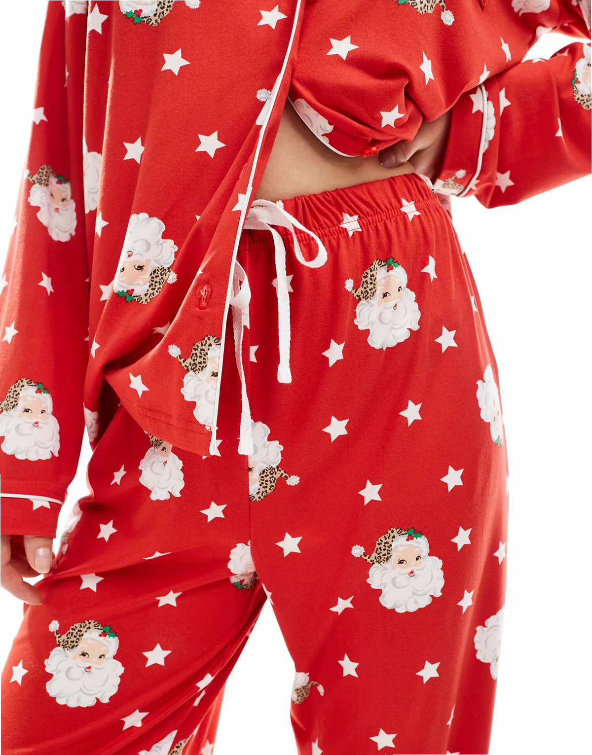 Christmas – Czerwona świąteczna piżama z bardzo miękkiego dżerseju we wzór z motywem świętego Mikołaja: top z kołnierzykiem kubańskim i spodnie z szerokimi nogawkami