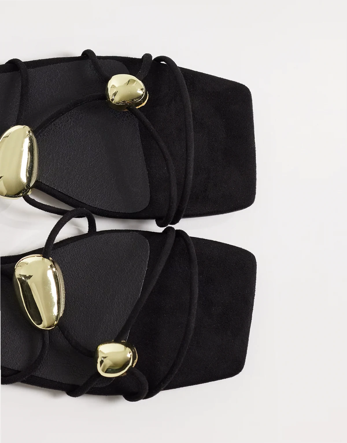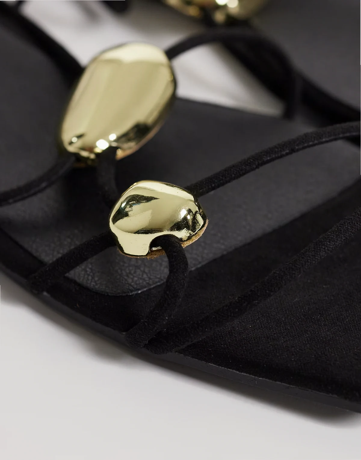 – Płaskie czarne sandały ze złotymi ozdobami