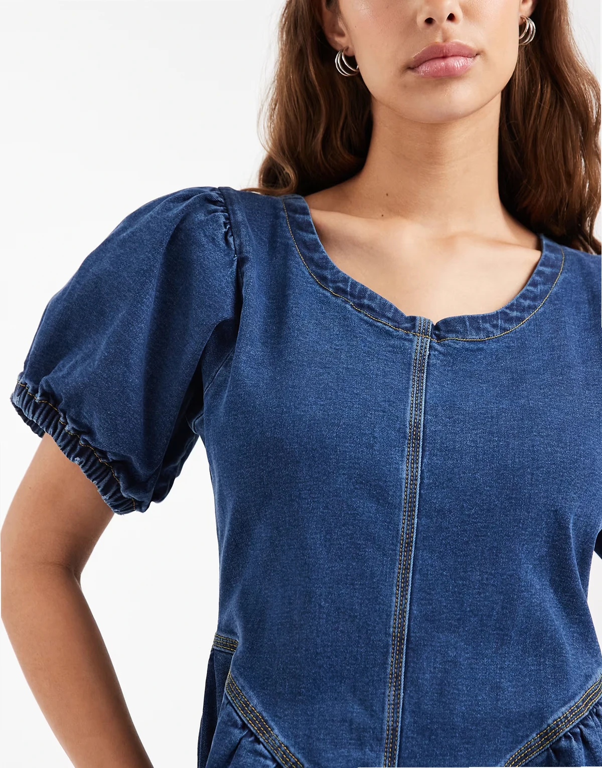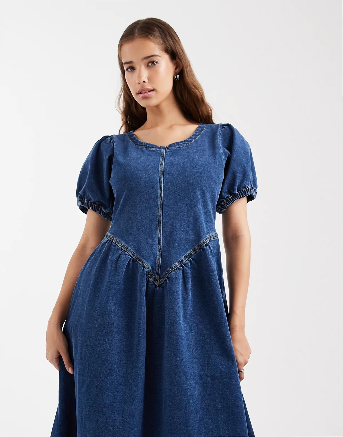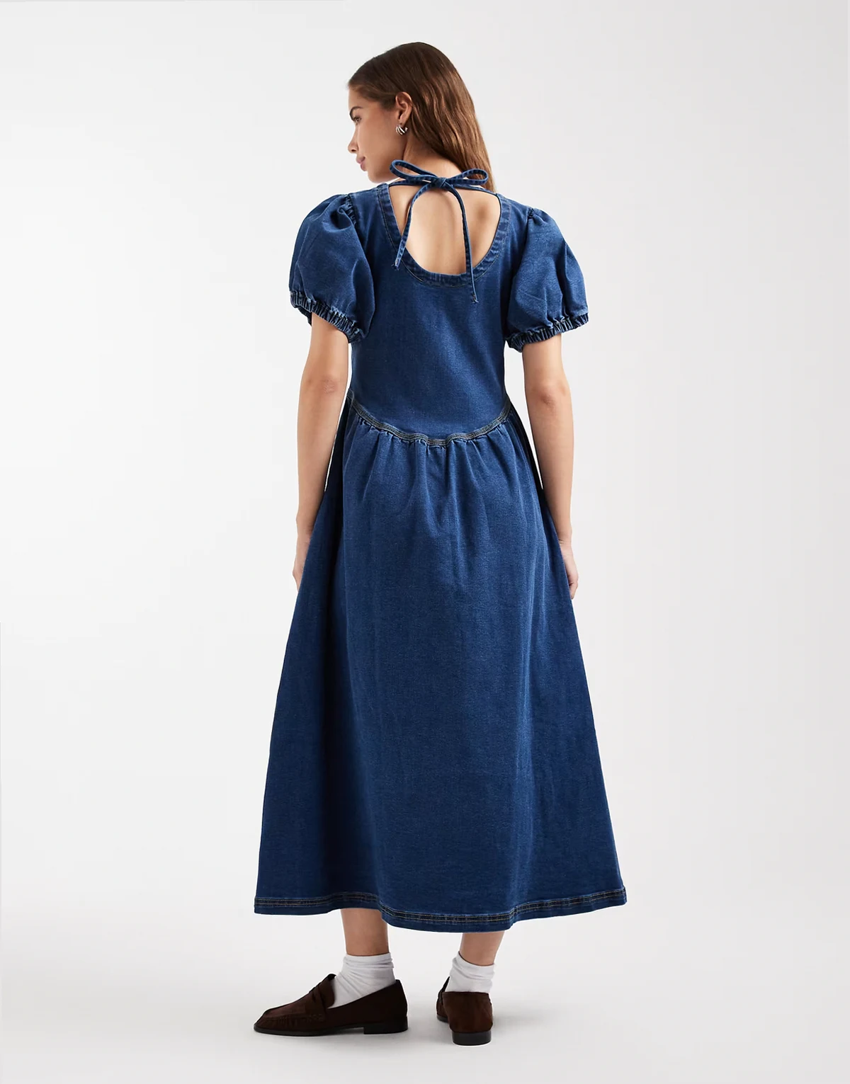 4. – Ciemnoniebieska sukienka maxi z bufkami i obniżonym stanem