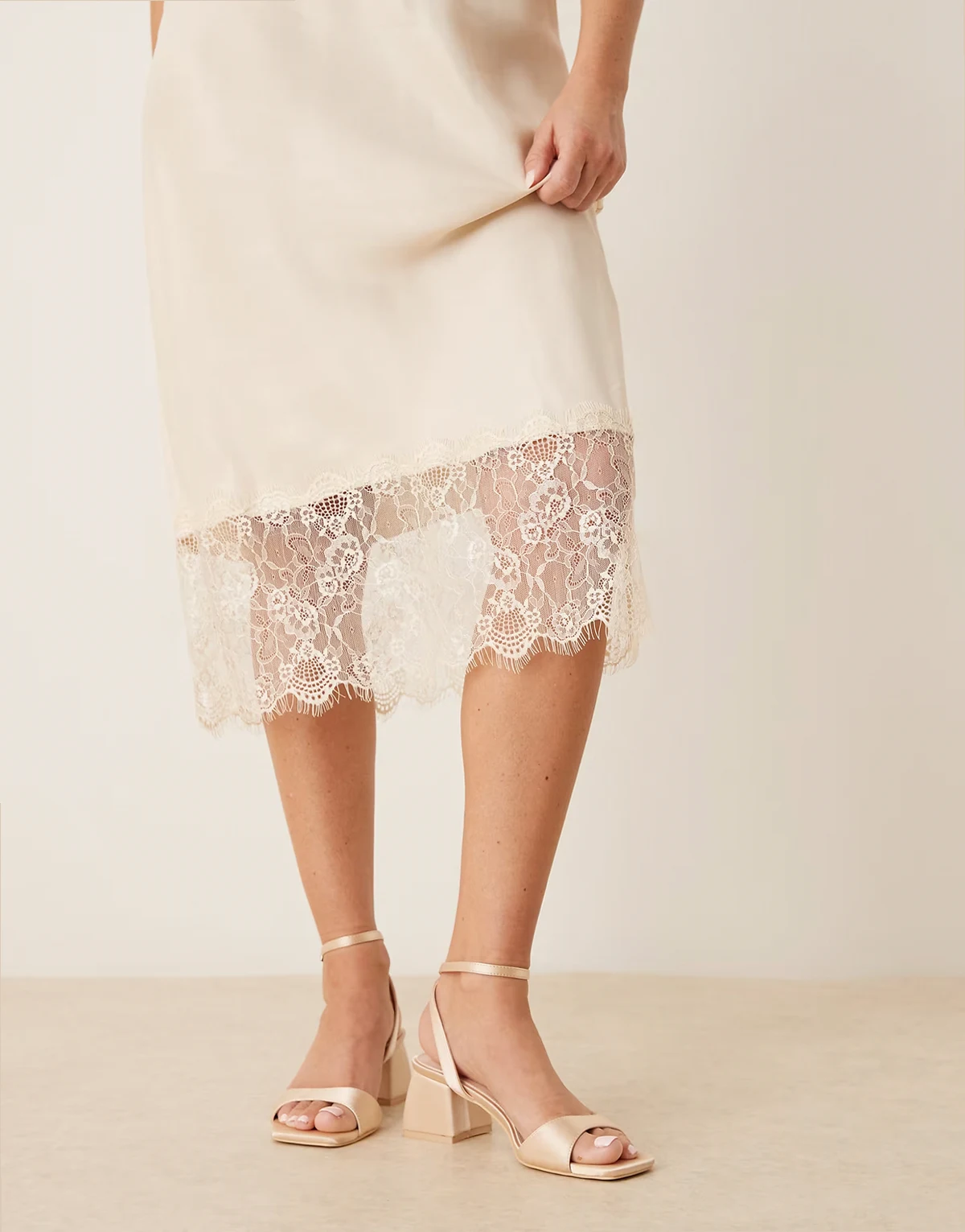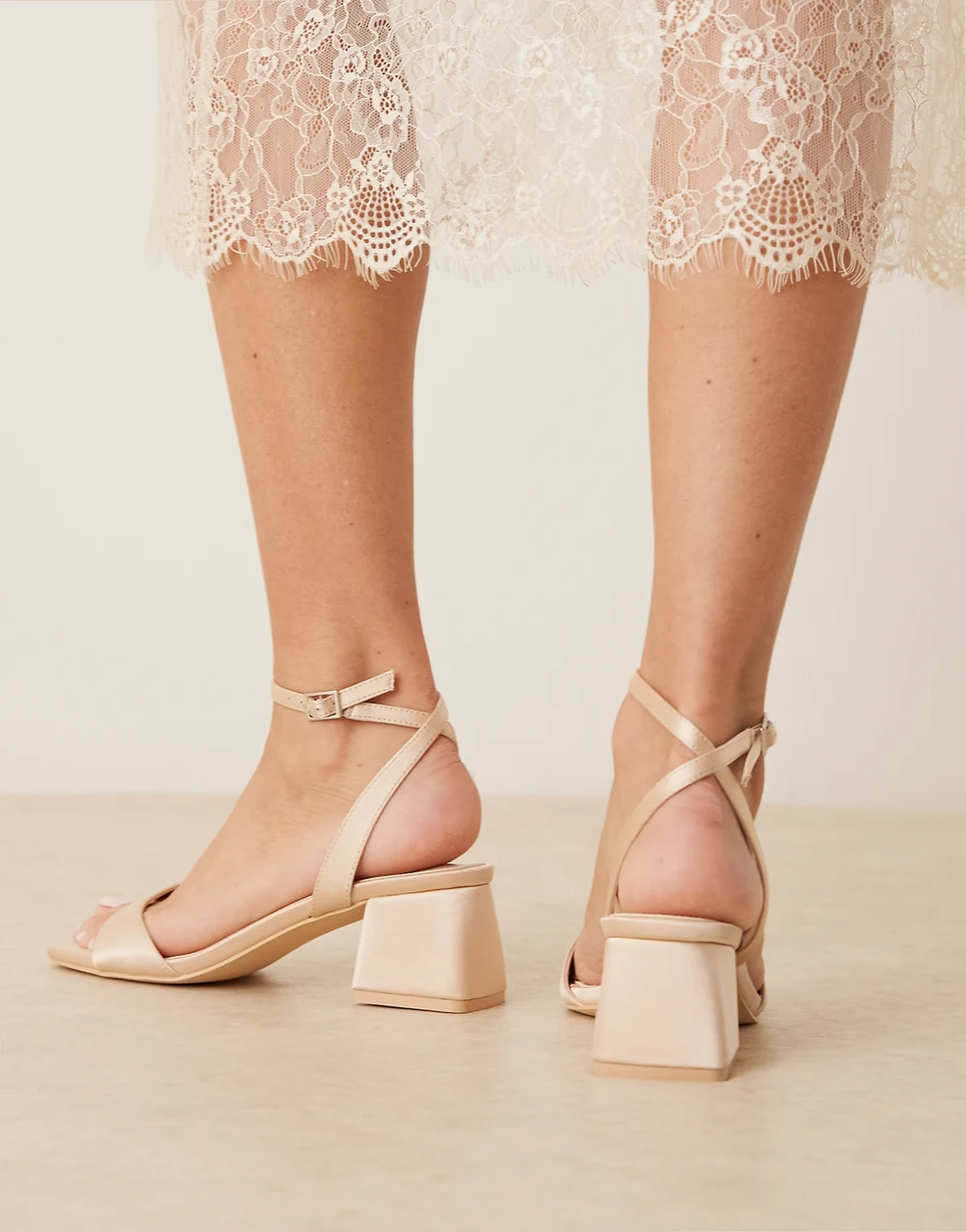 – Cora – Satynowe ślubne sandały na obcasie klockowym w kolorze kości słoniowej