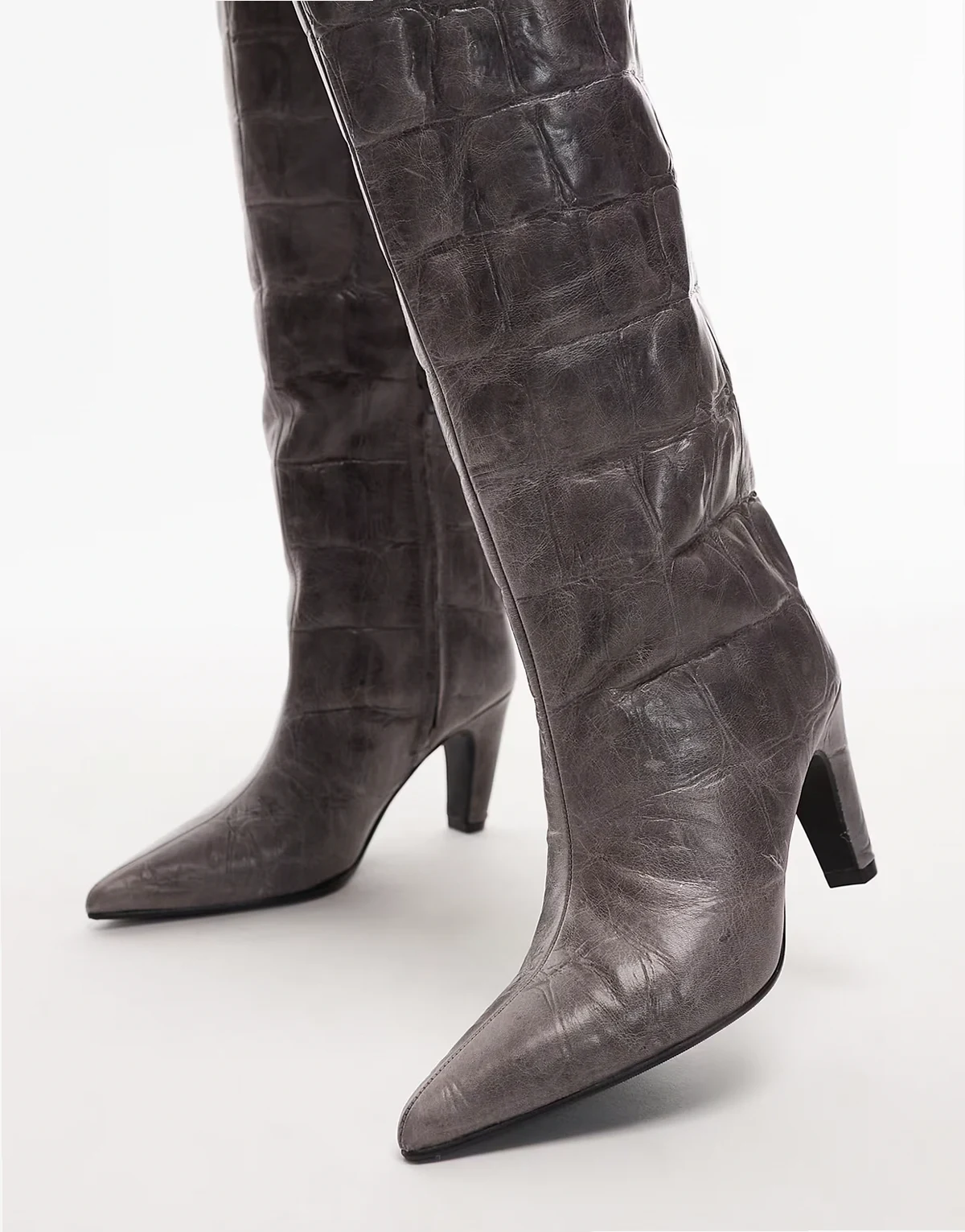– Low-Jadey – Grafitowe skórzane kozaki do kolan ze wzorem skóry krokodyla