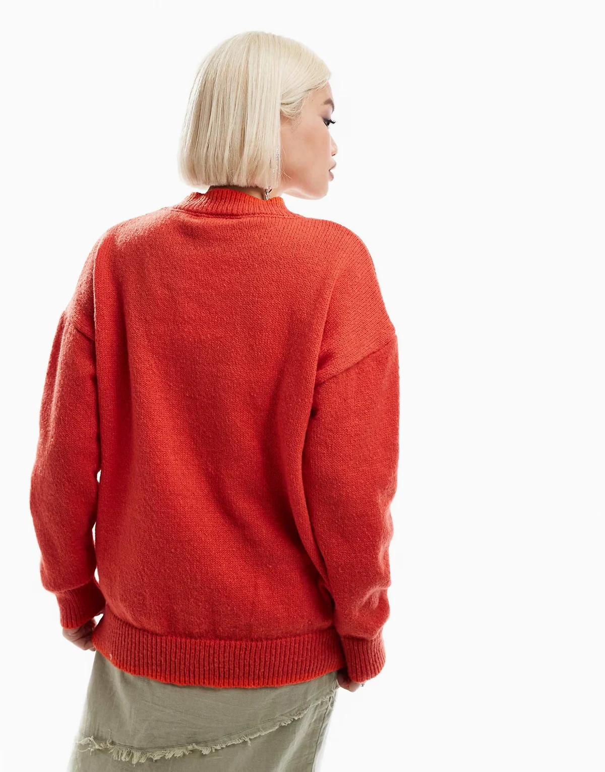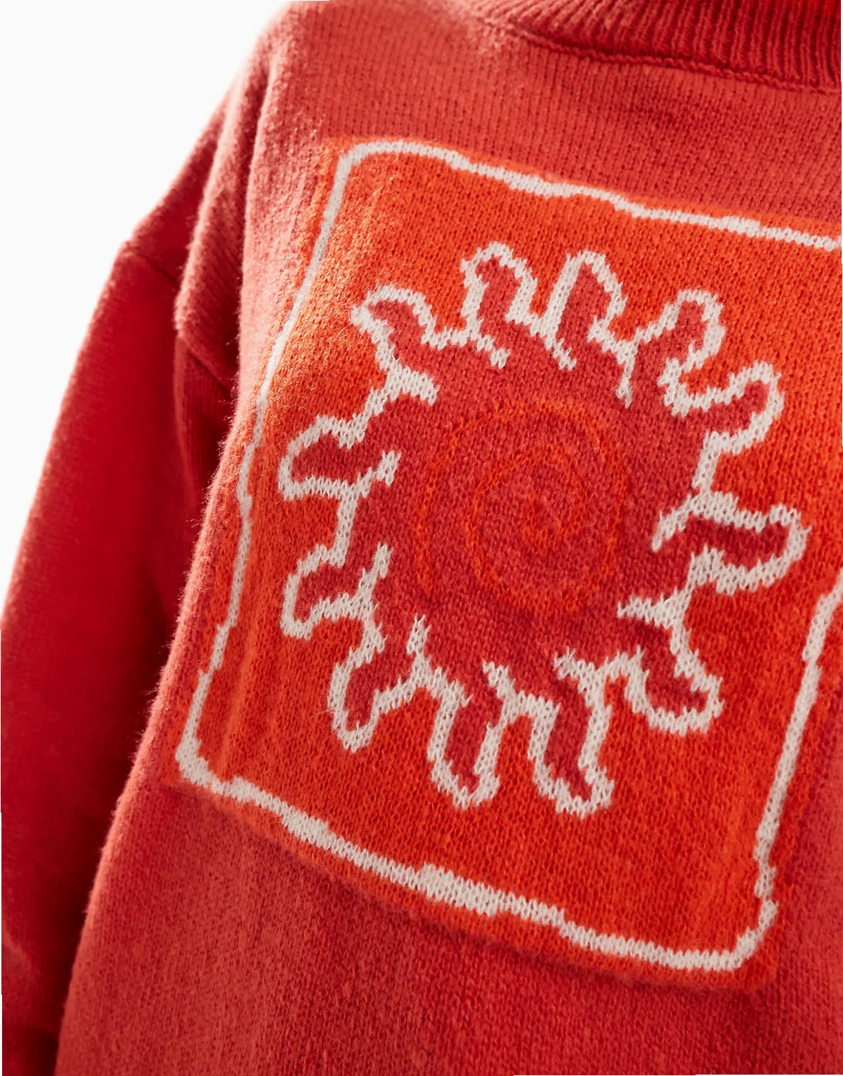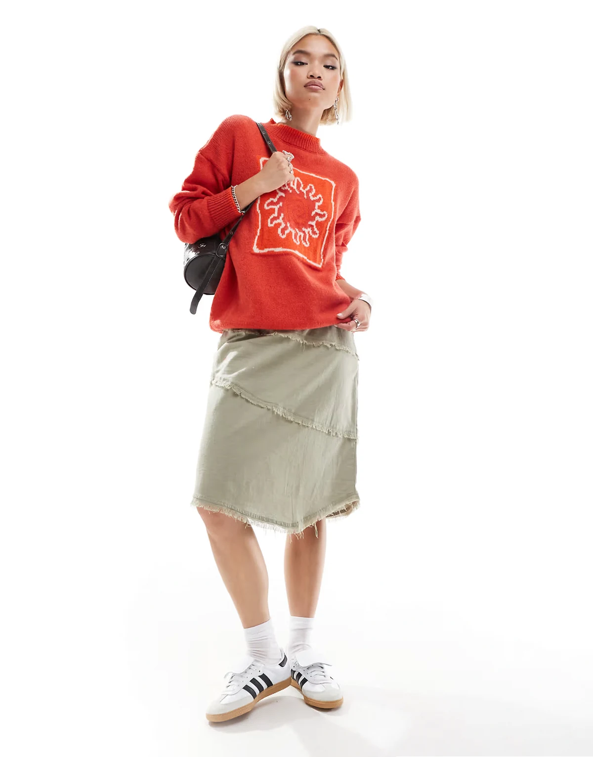 – Dzianinowy sweter ze wzorem słońca i lamówką
