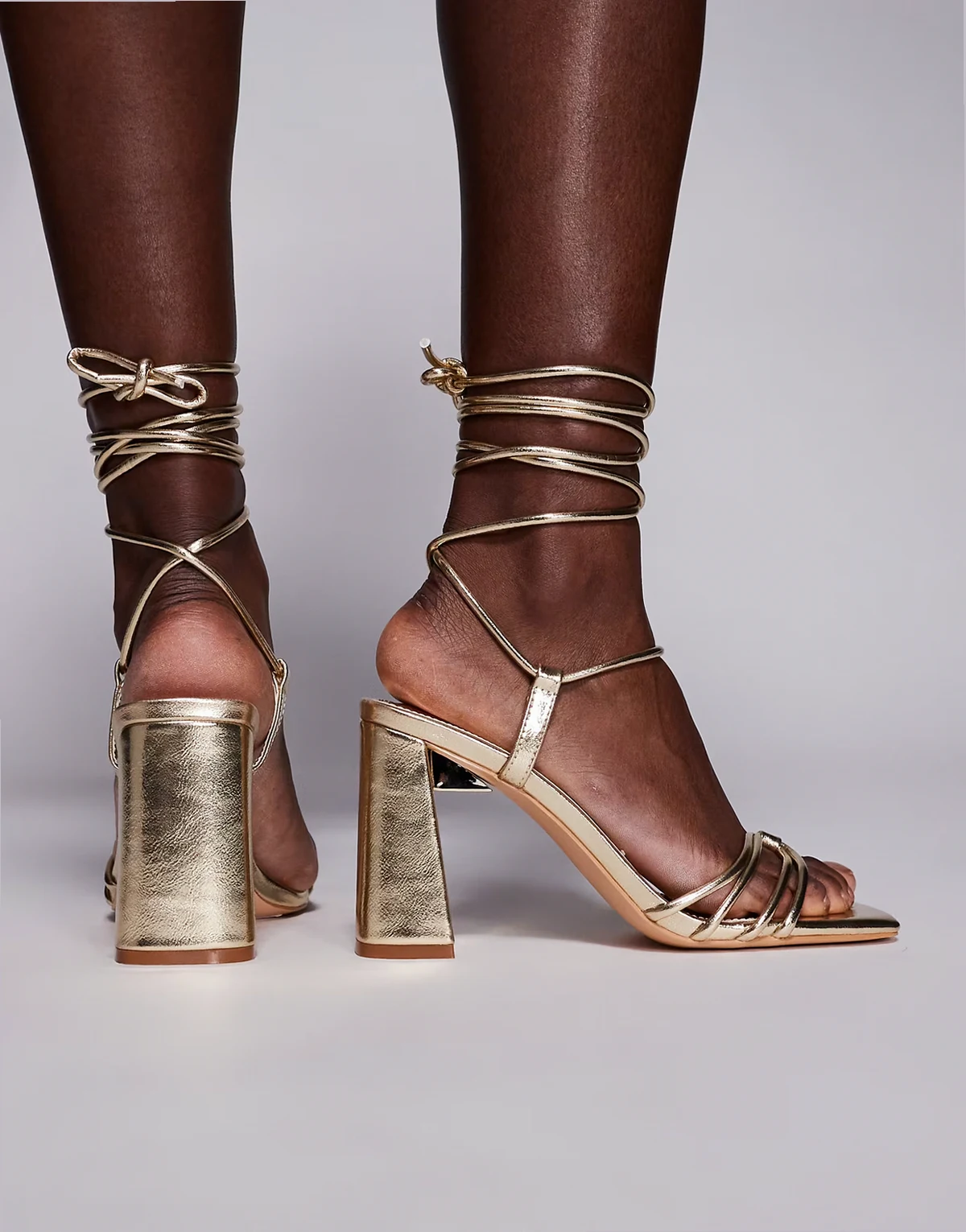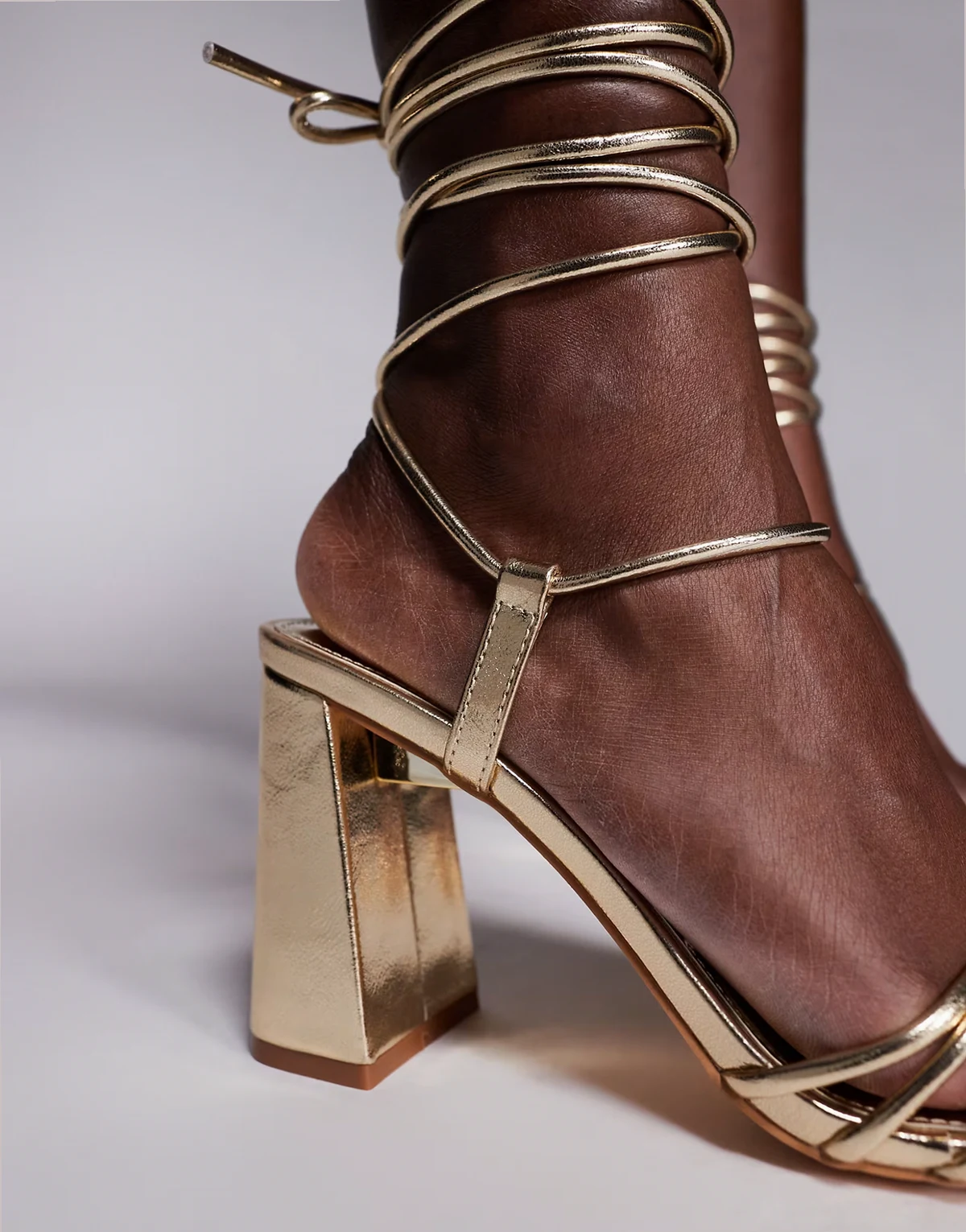 – Bergamot – Złote wiązane sandały na obcasie klockowym