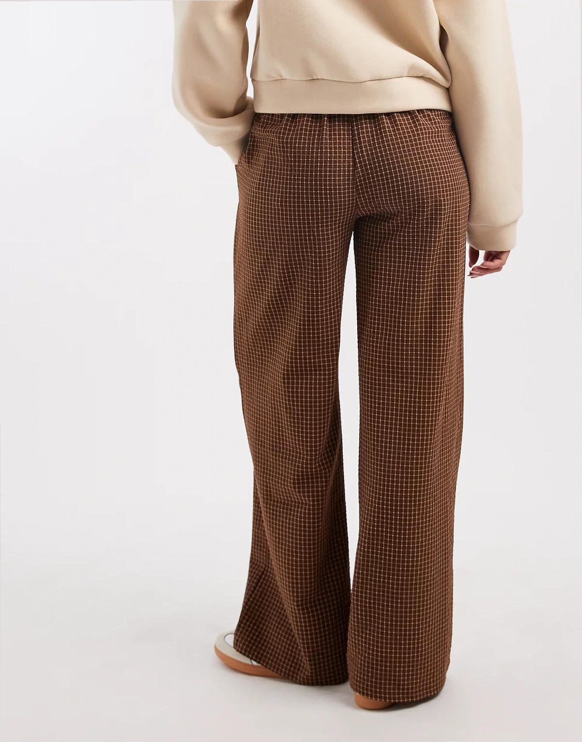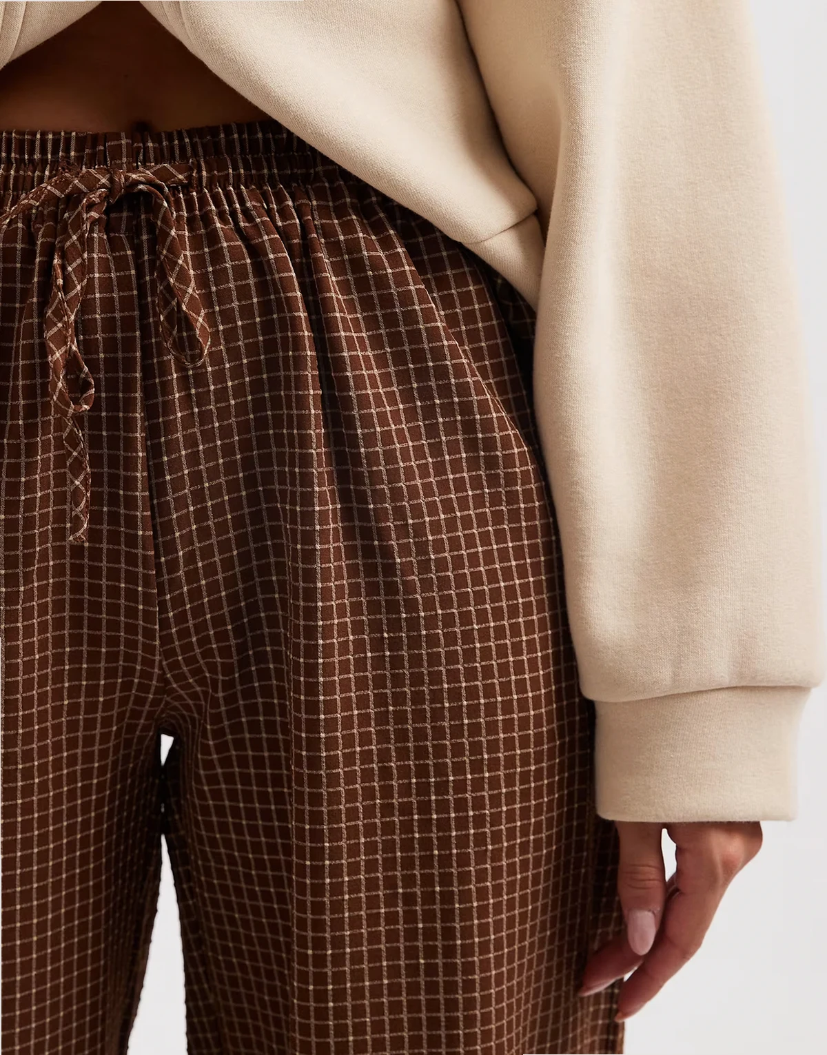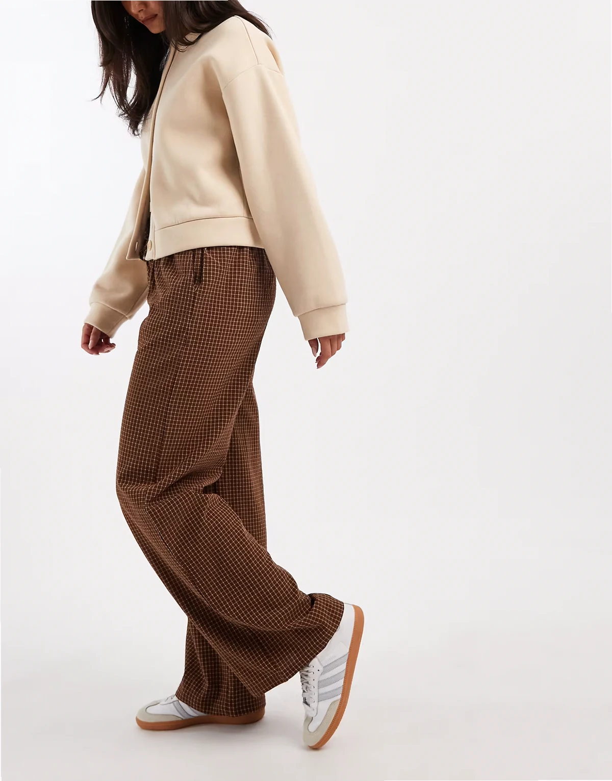 – Rdzawe ściągane na sznurek spodnie wsuwane w kratkę