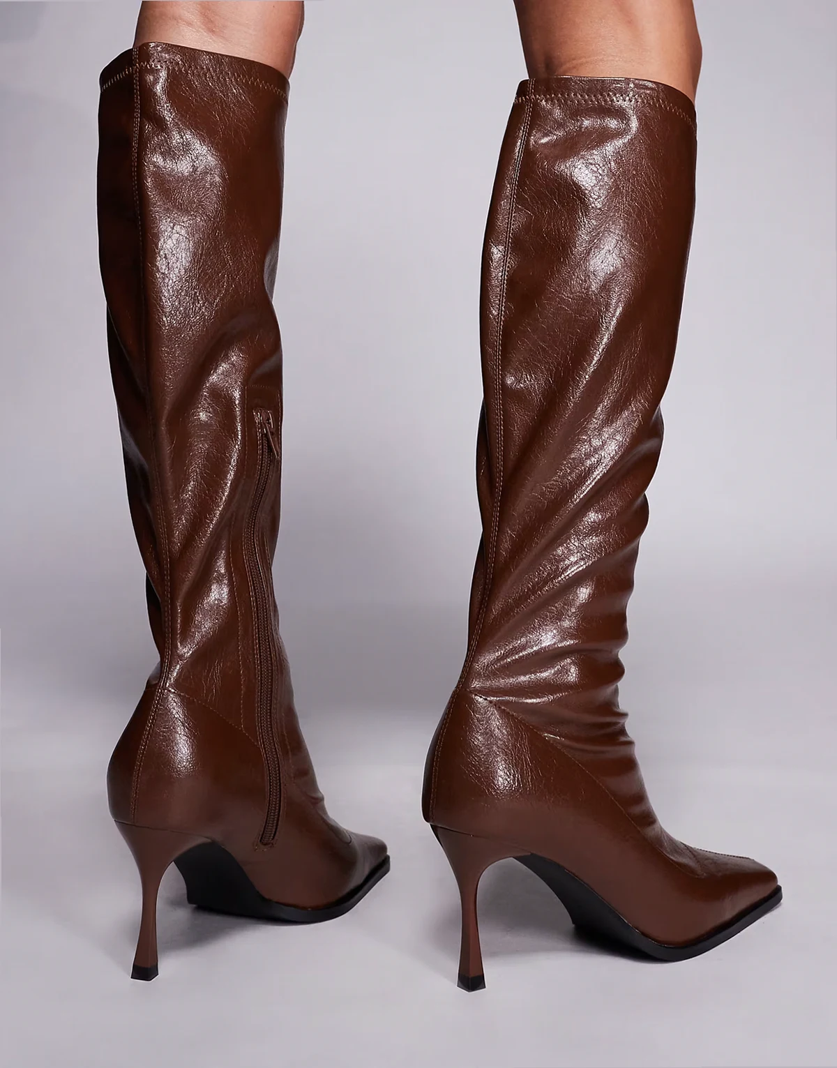 – Scorpion – Brązowe botki do kolan na obcasie z kwadratowymi noskami