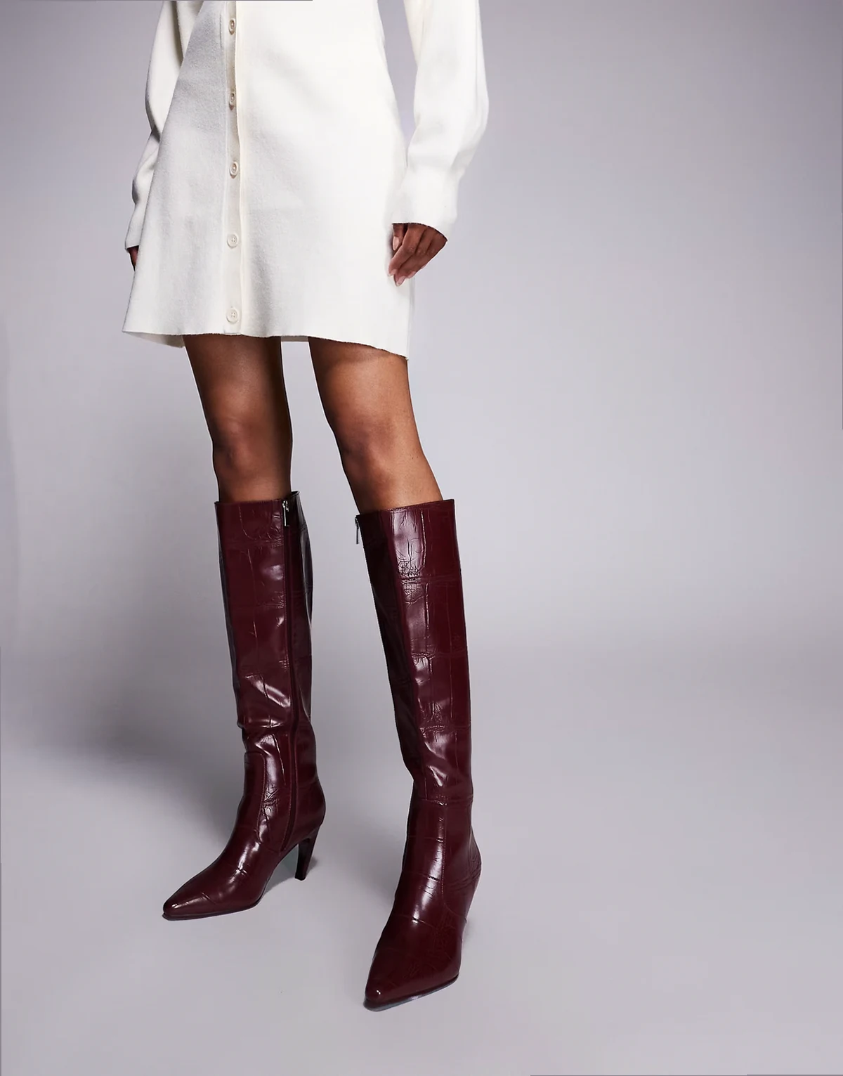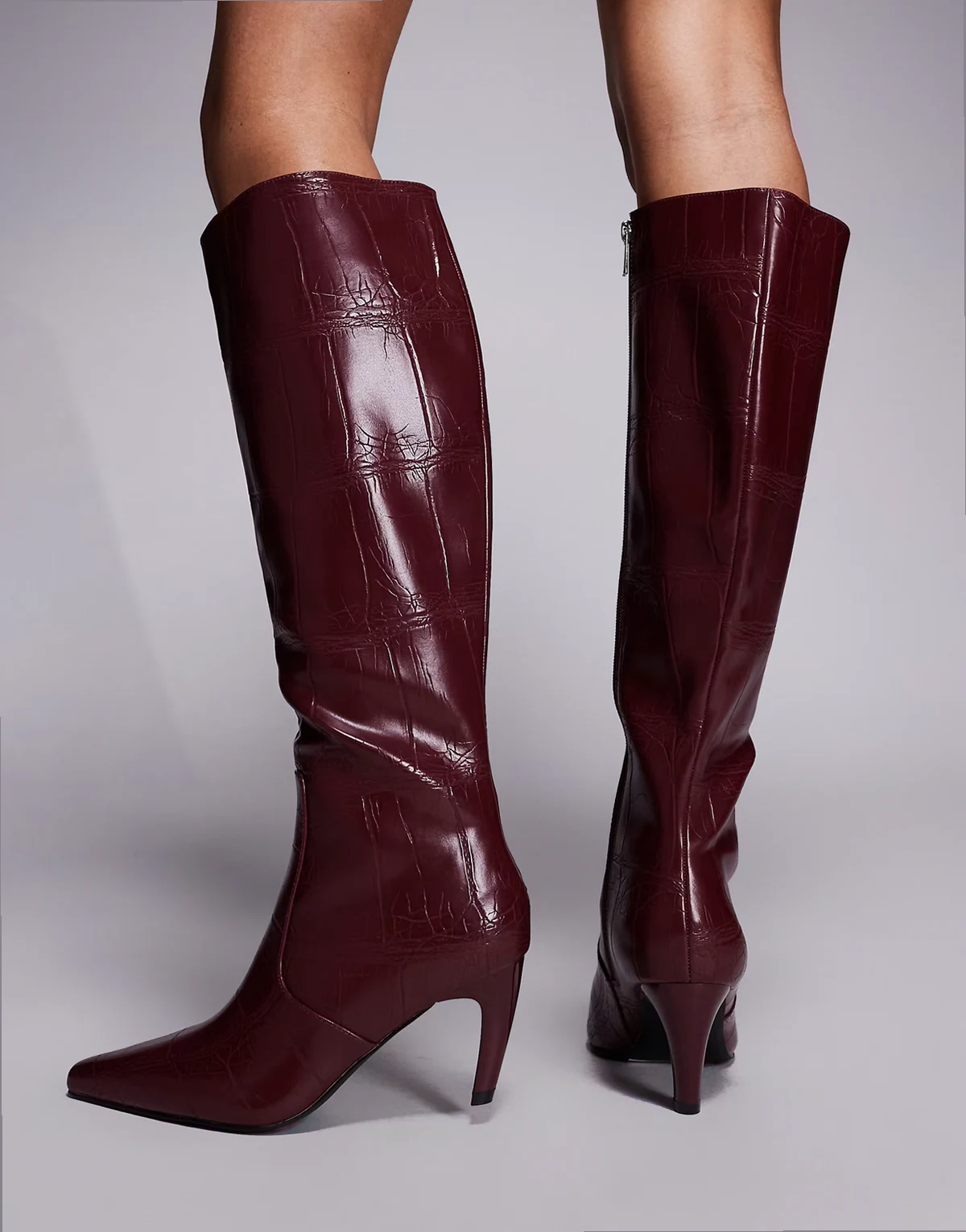 Simmi – Lapis – Bordowe botki na obcasie do kolan z efektem skóry krokodyla