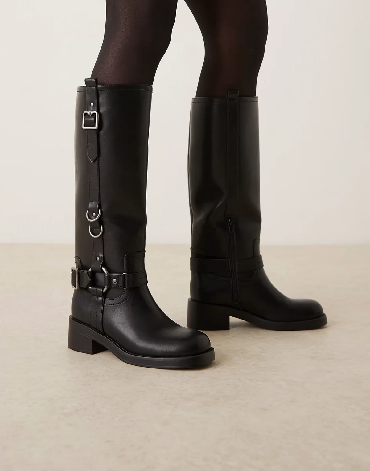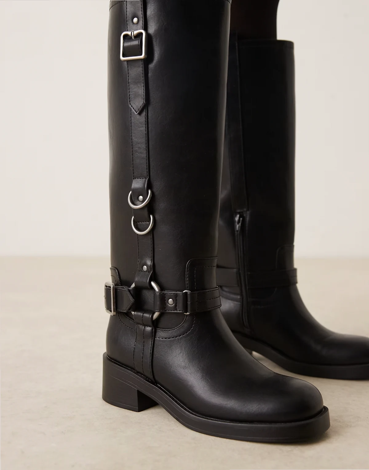 Wide Fit – Cobra – Czarne kozaki do kolan z uprzężą i srebrnymi klamrami