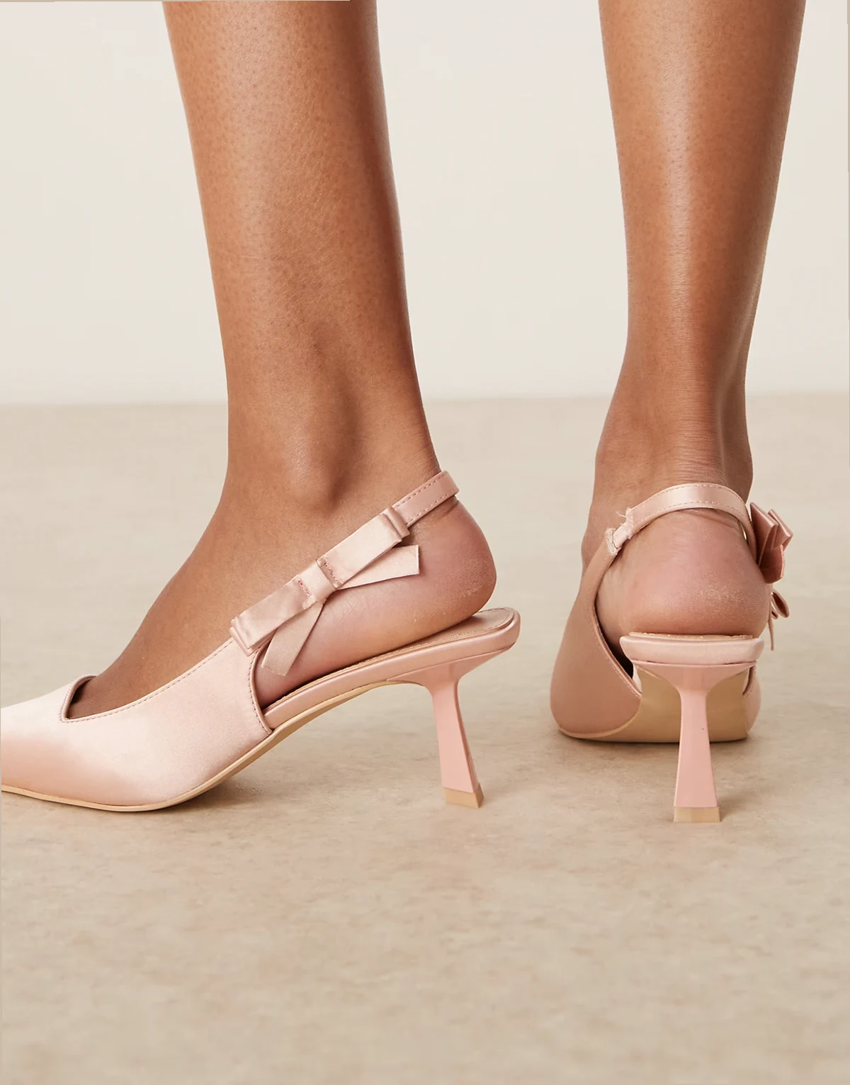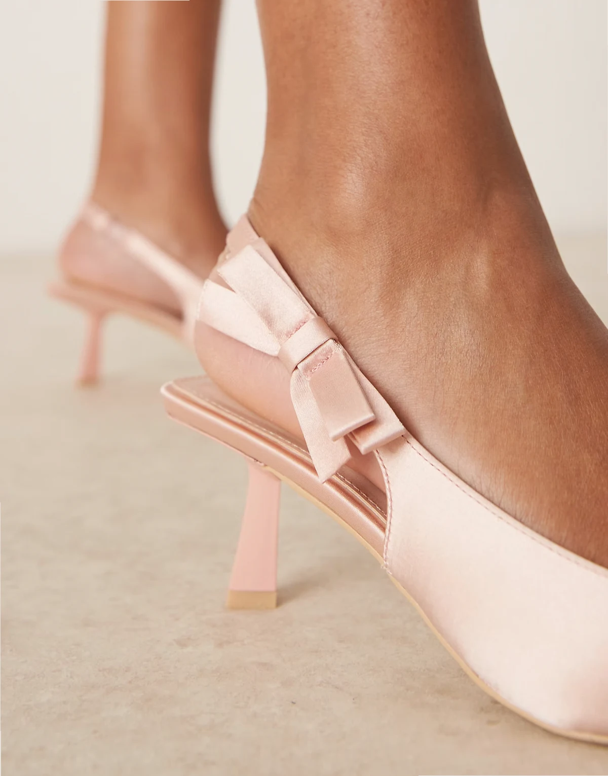 4. Bridal – Almeria – Różowe, satynowe buty na obcasie, z paskiem za piętami i ozdobną kokardką