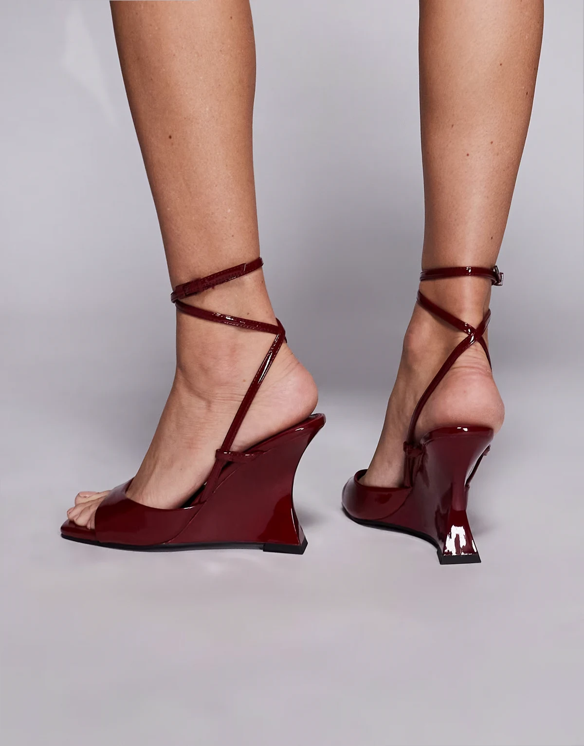 4. – Nightshade – Ciemnoczerwone błyszczące sandały na koturnach