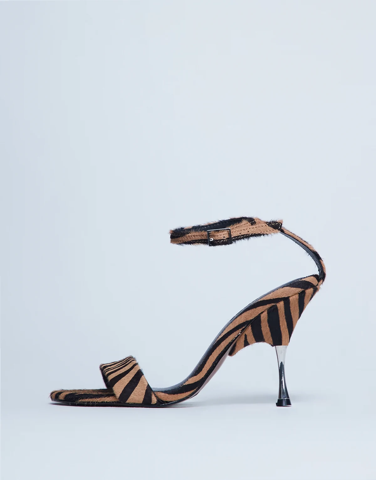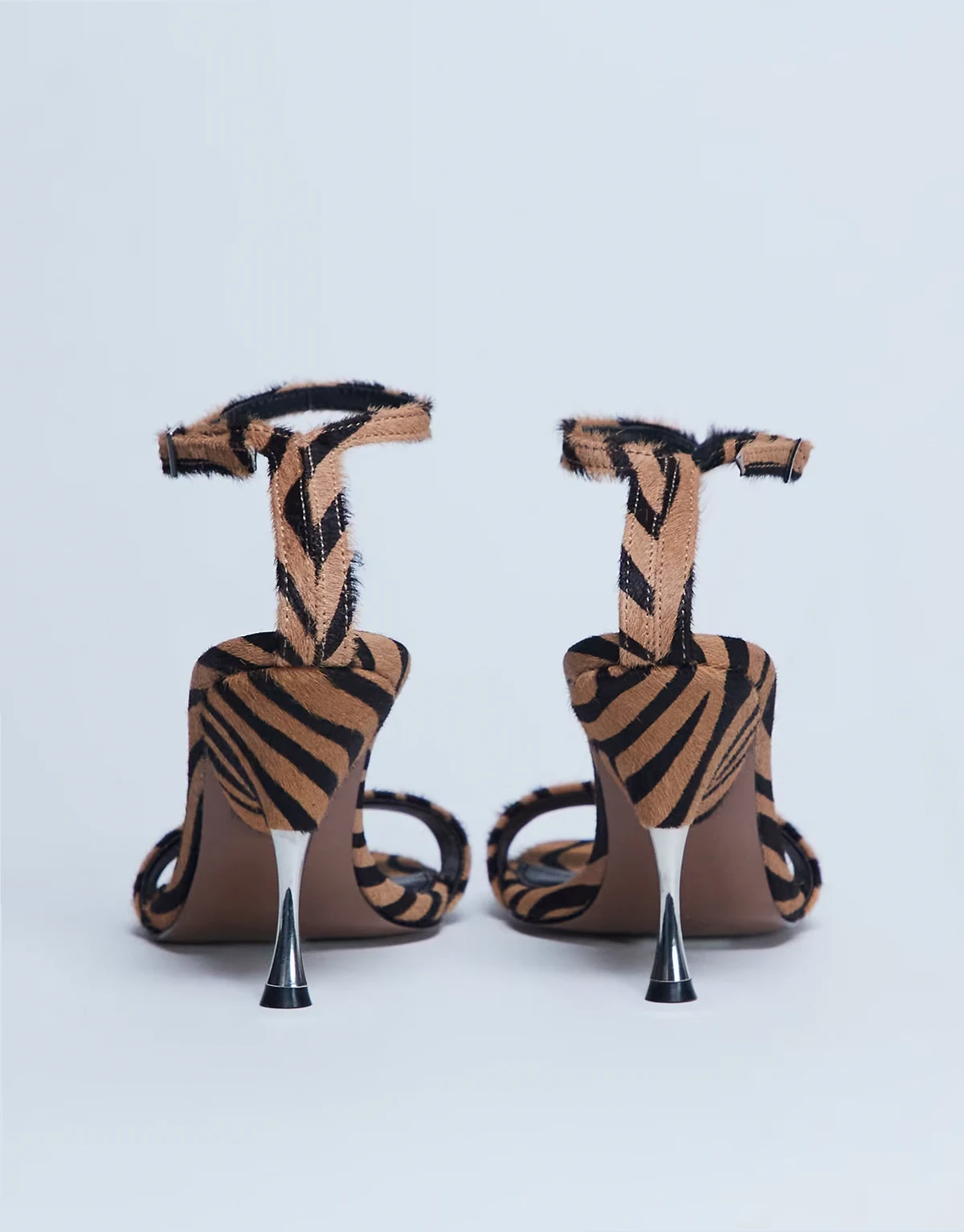 Szpilki Fran są wykonane z fakturowanego materiału w zwierzęcy wzór. Mają regulowany pasek za kostką, odkryte palce i obcas w odcieniu srebra – te sandały o minimalistycznej konstrukcji są idealne na wieczorne wyjścia.
