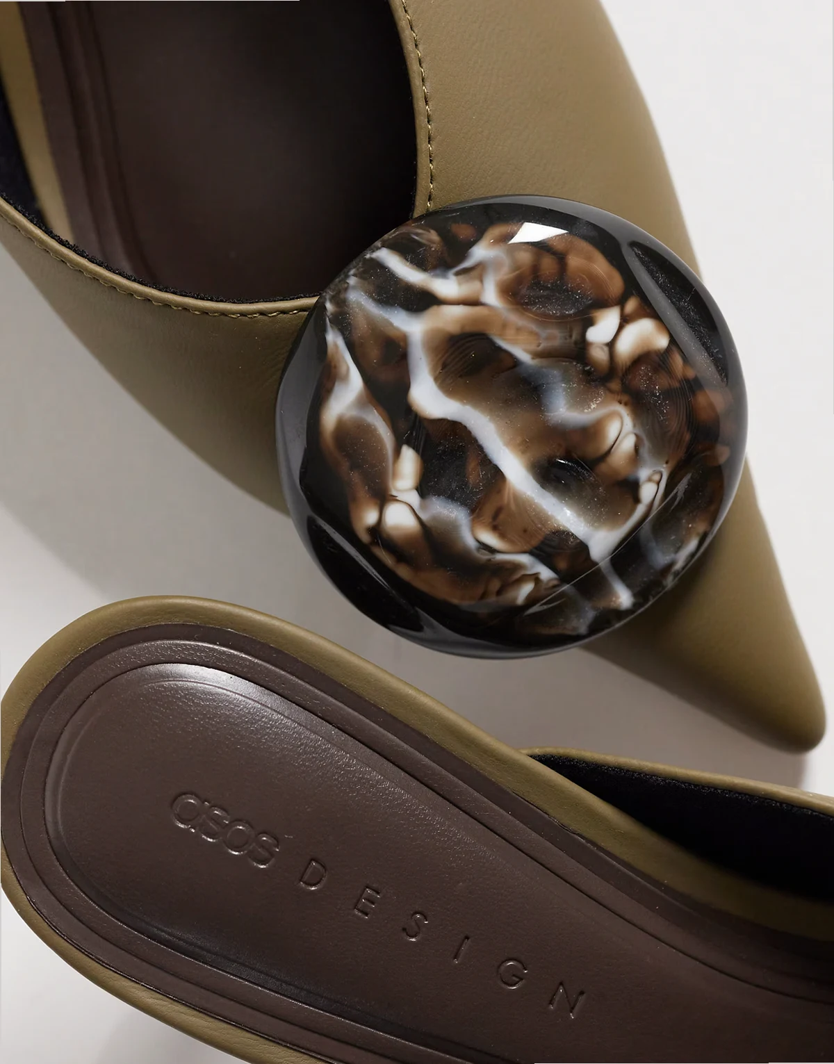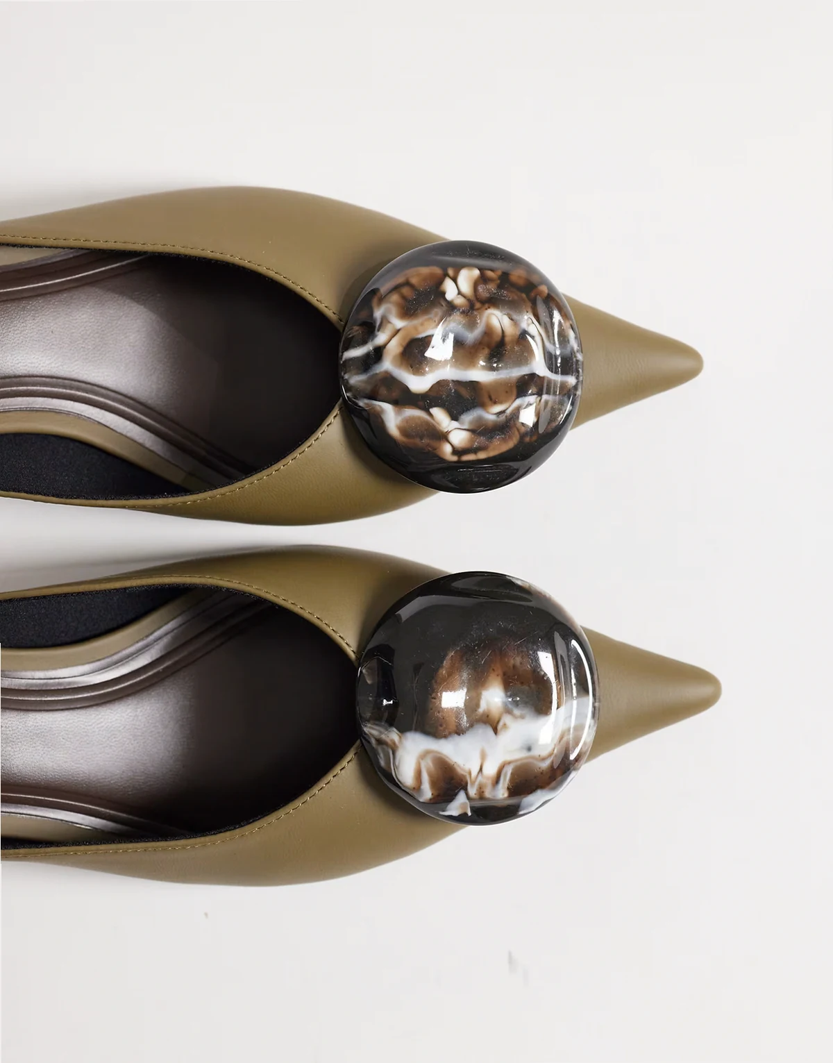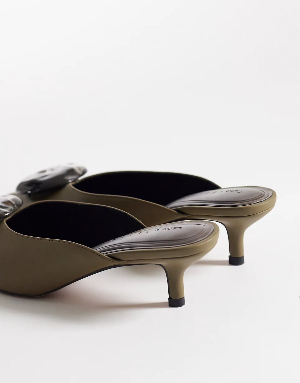 – Oliwkowe klapki na średnim obcasie z ozdobnym wykończeniem
