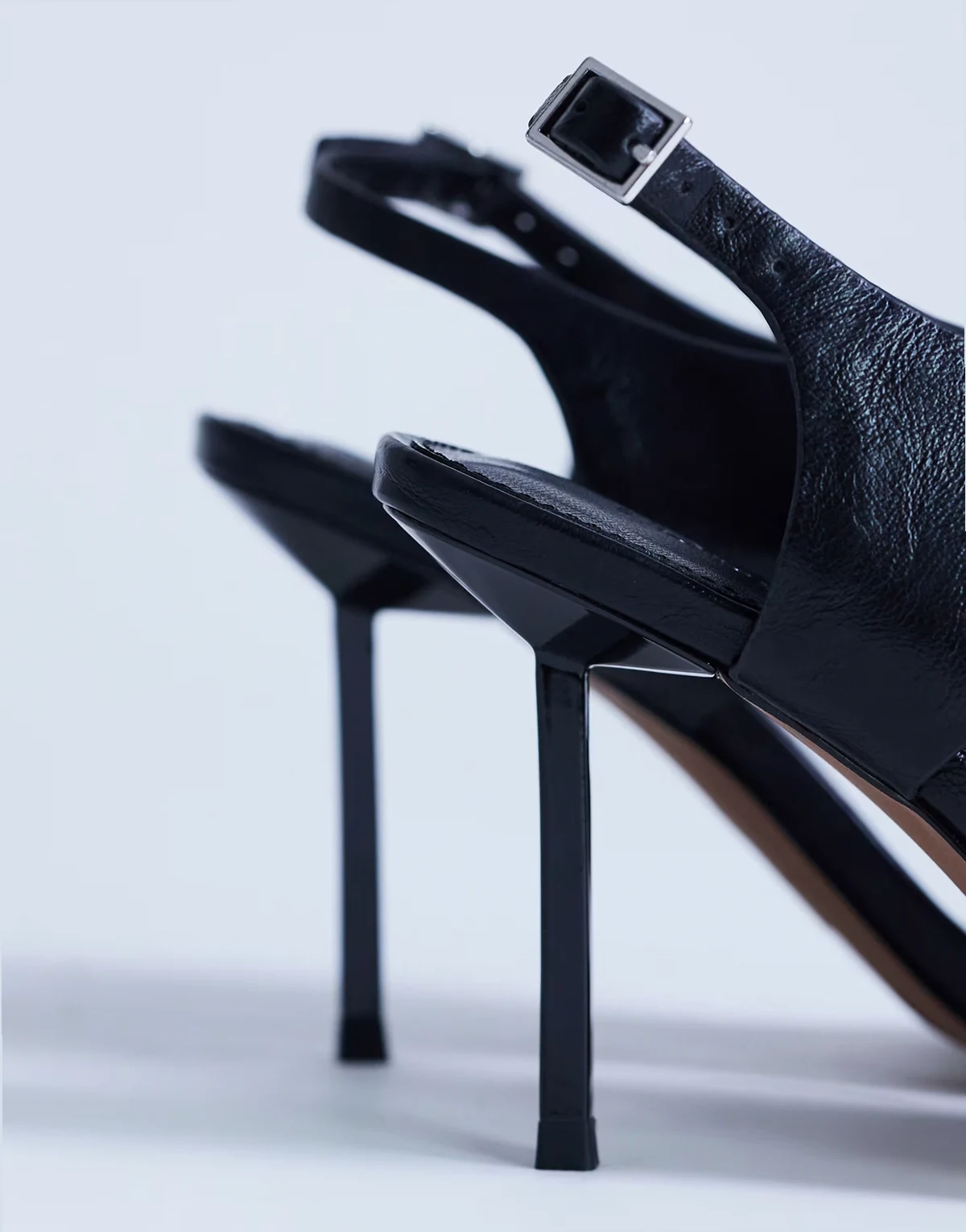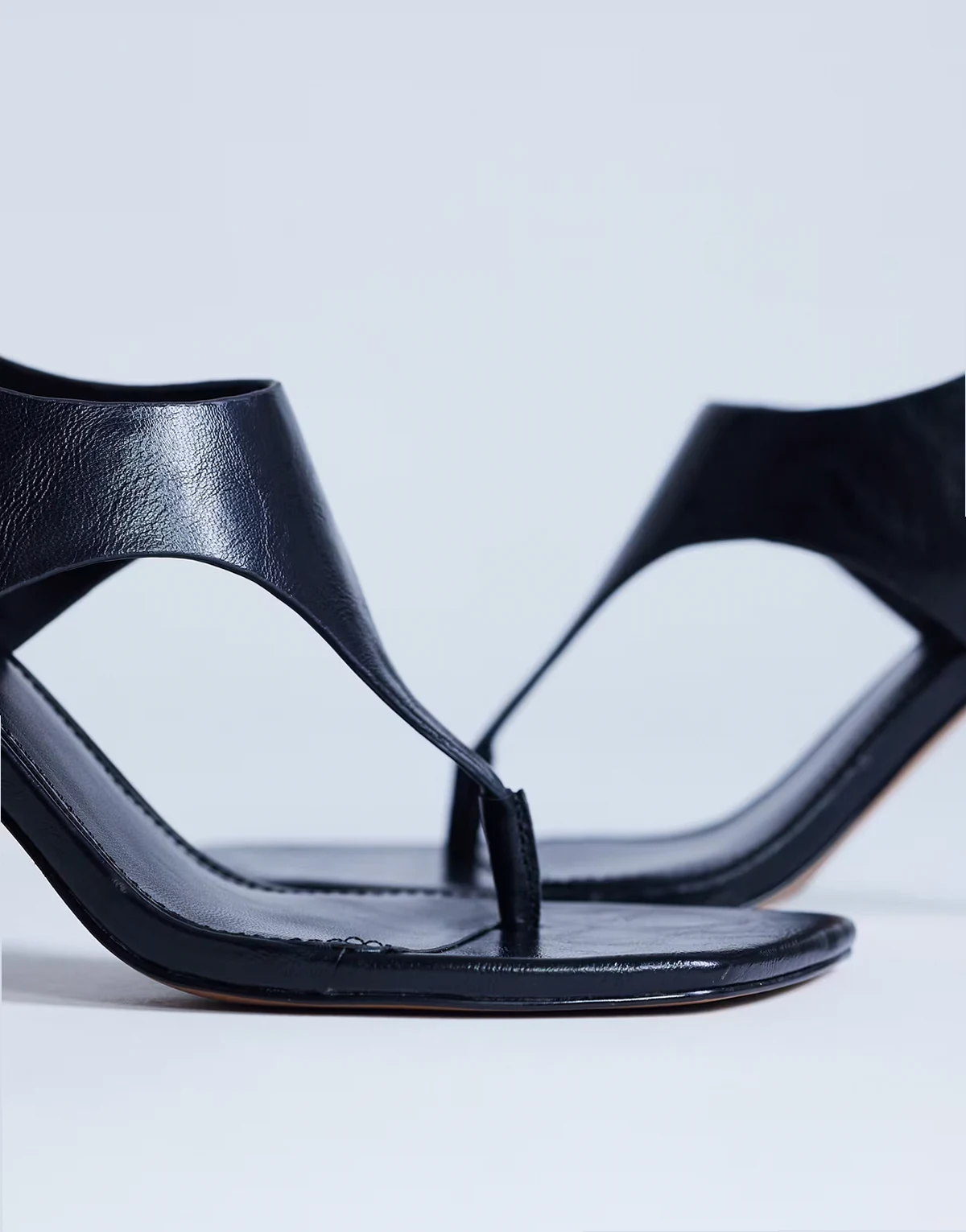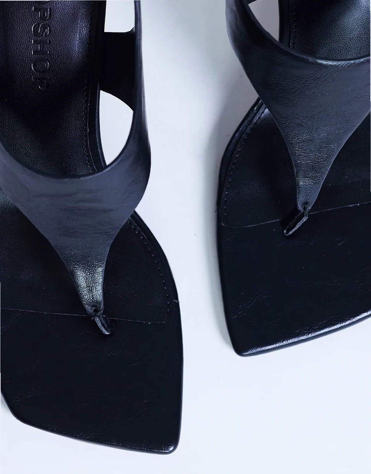 Sandały Sandy mają regulowany pasek wokół pięty z zapięciem na sprzączkę, słupek między palcami i wysoki szpiczasty obcas. Ten model, wykonany z matowego materiału w czarnym odcieniu, idealnie pasuje do minimalistycznych stylizacji.