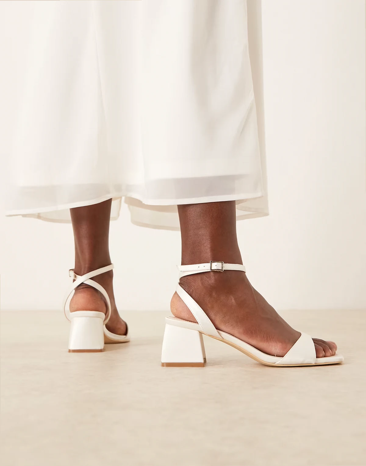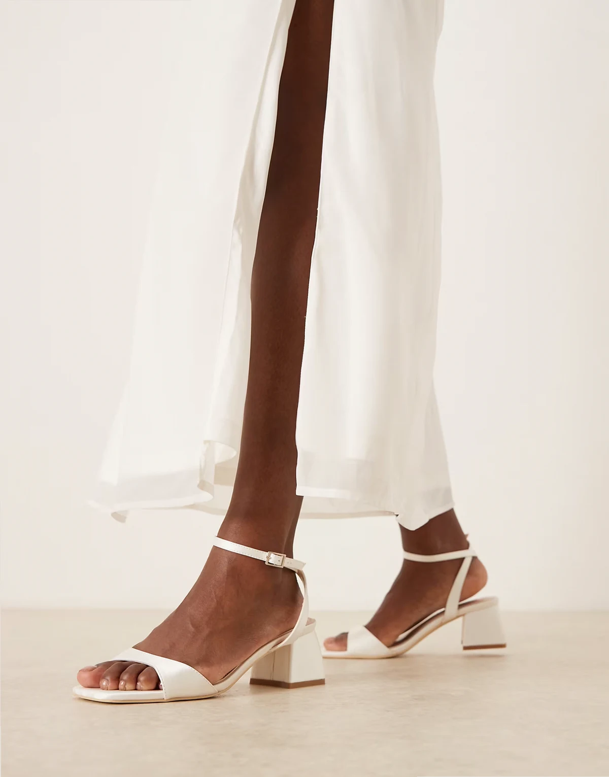 4. Bridal – Ammie – Satynowe sandały ślubne w kolorze kości słoniowej na niskim obcasie klockowym
