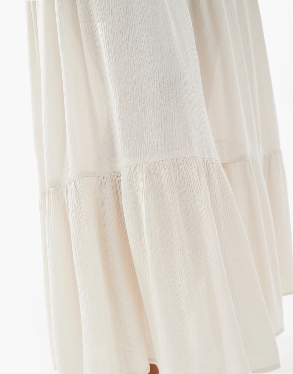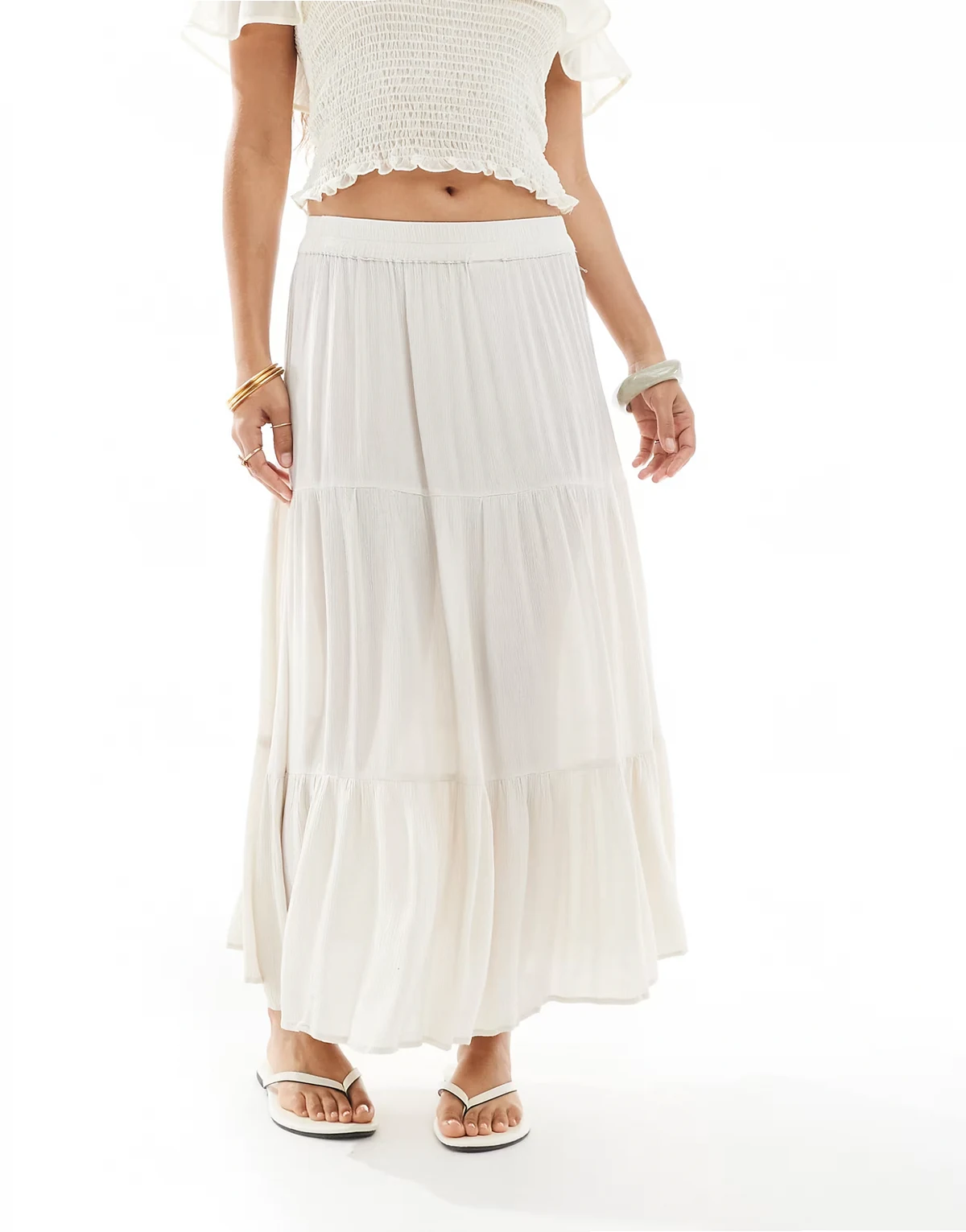 – Jasnobeżowa spódnica maxi marszczona w talii