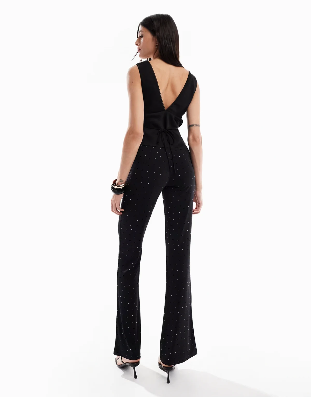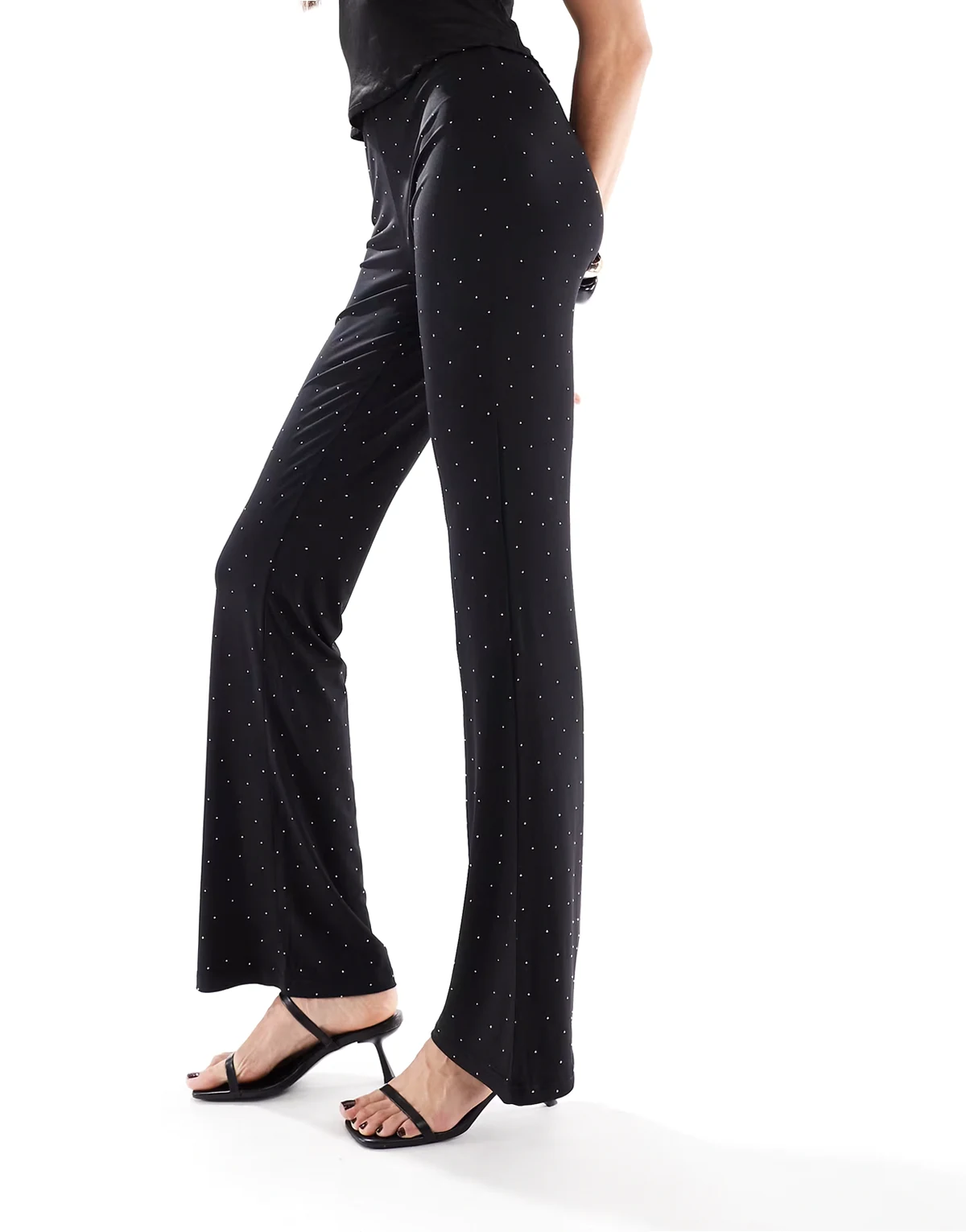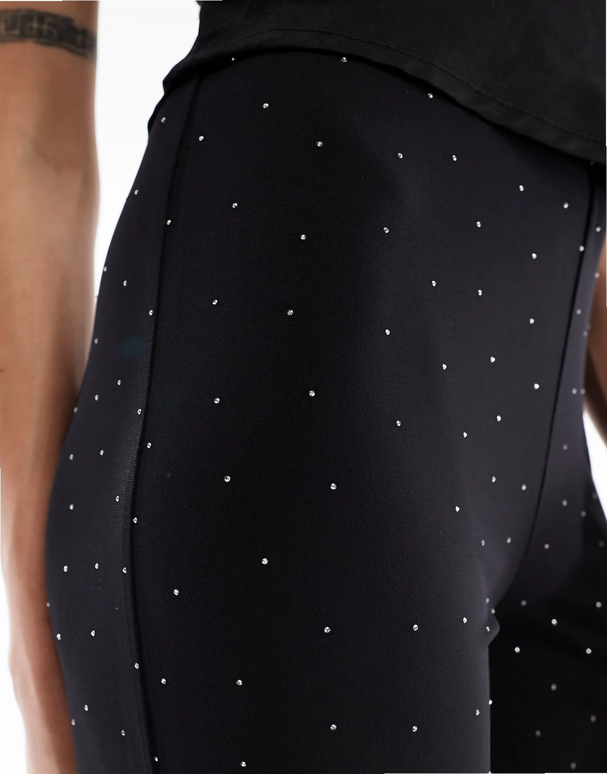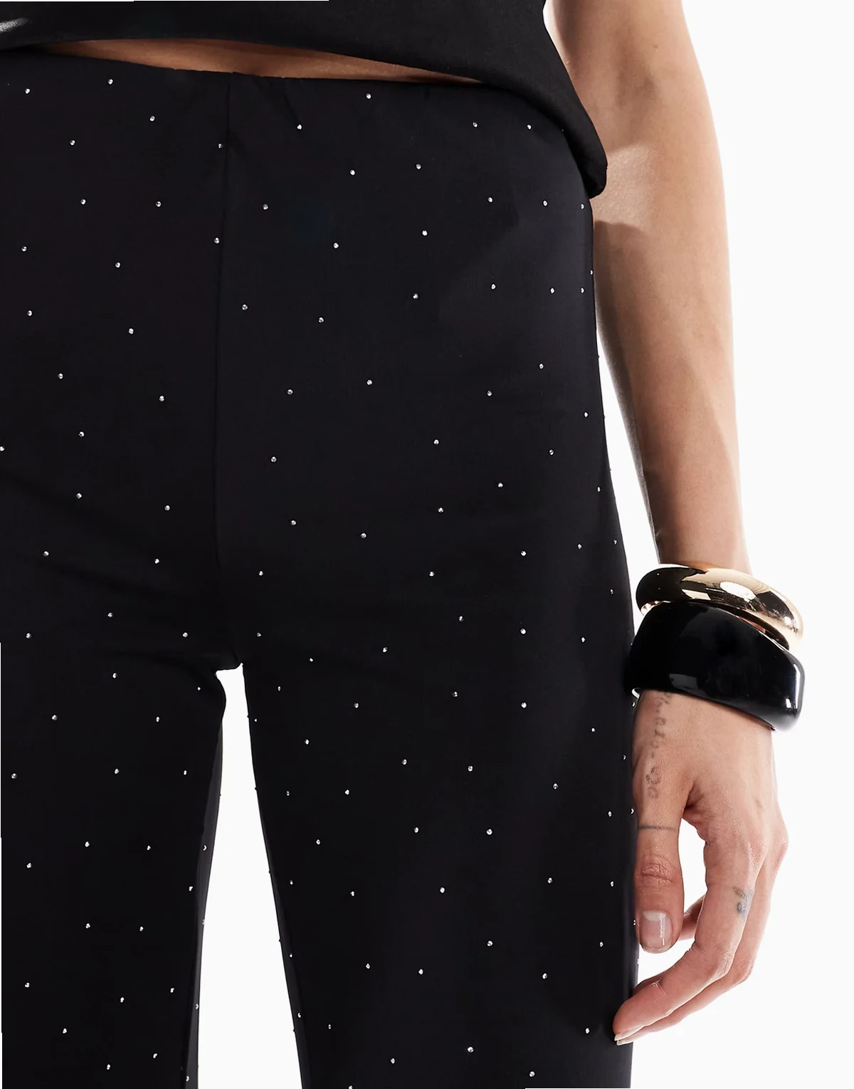 – Czarne spodnie z rozszerzanymi nogawkami ze strasami