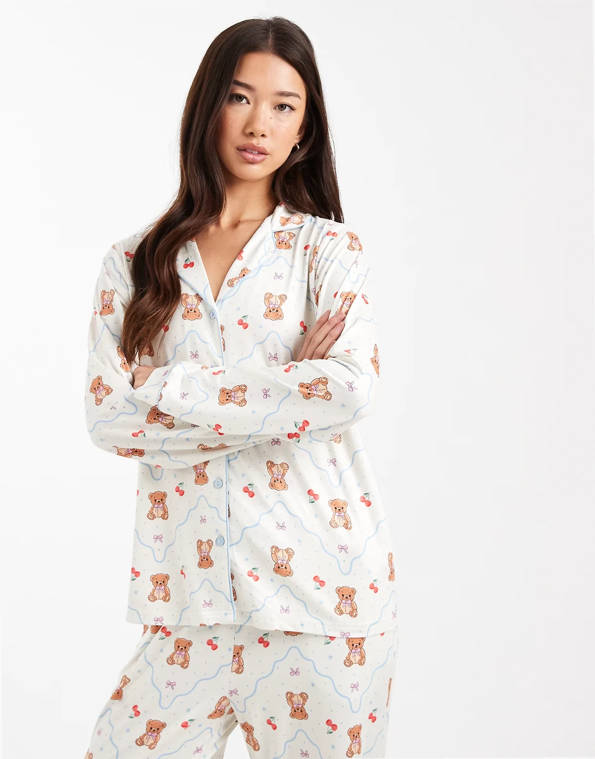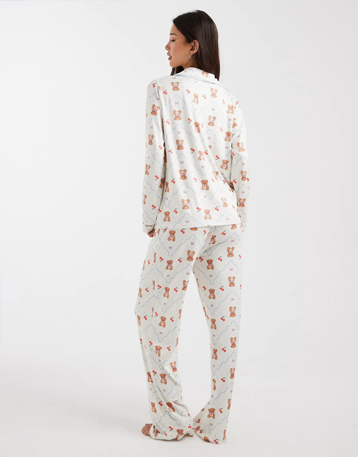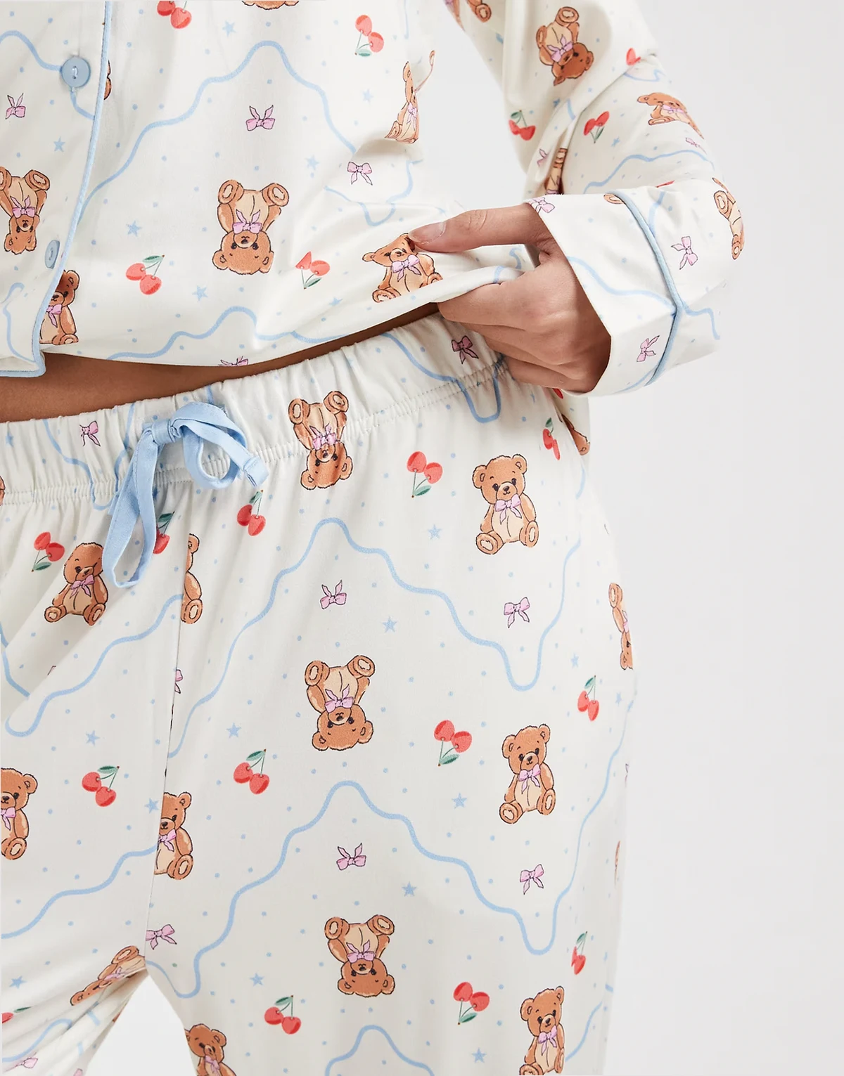 – Zapinana na guziki bardzo miękka piżama we wzór w misie w kolorze ecru i niebieskim
