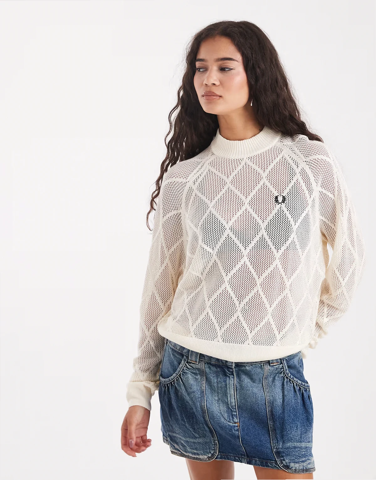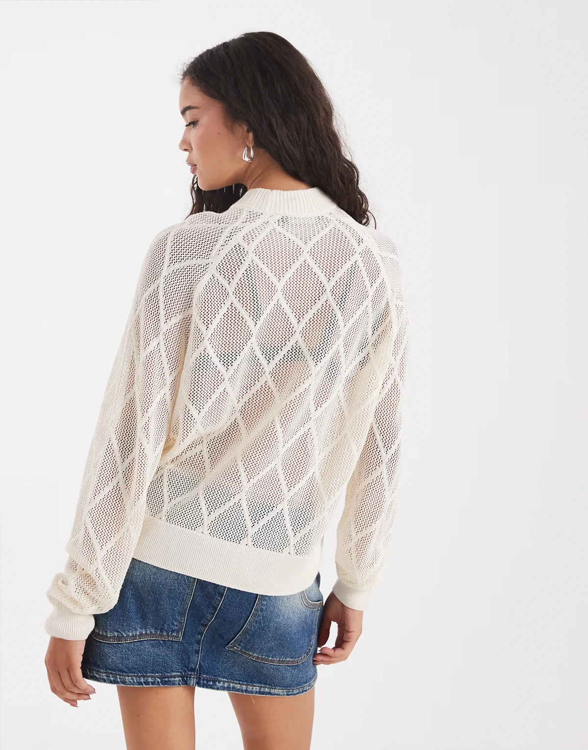 – Biały sweter z siateczkowej dzianiny w romby