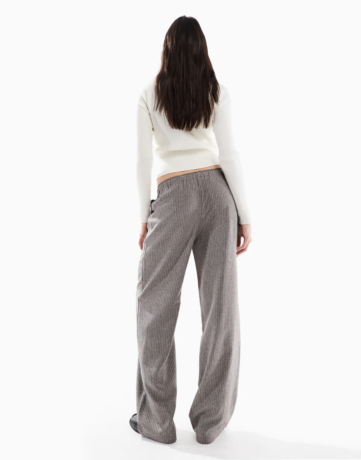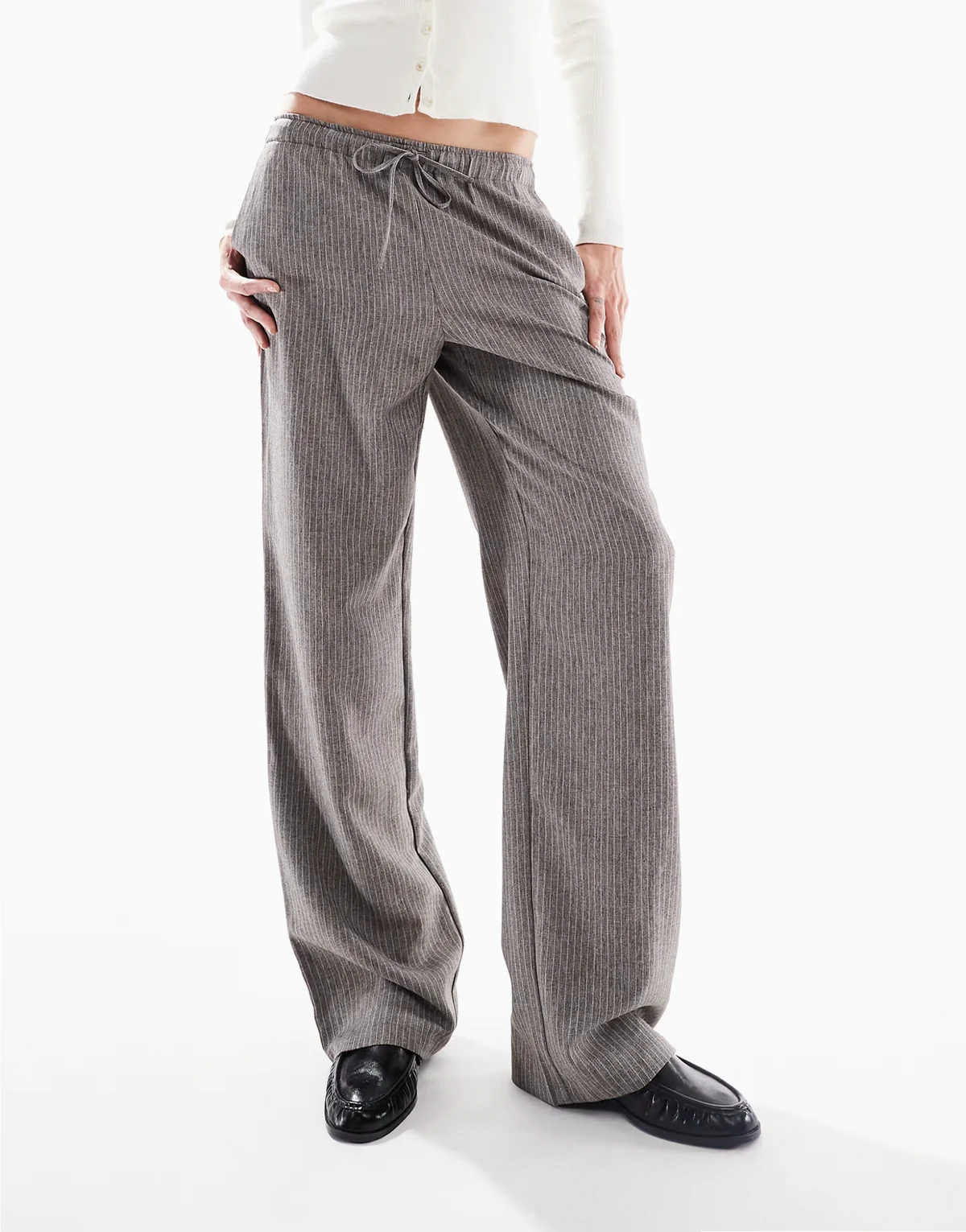 – Szare spodnie w prążki z szerokimi nogawkami