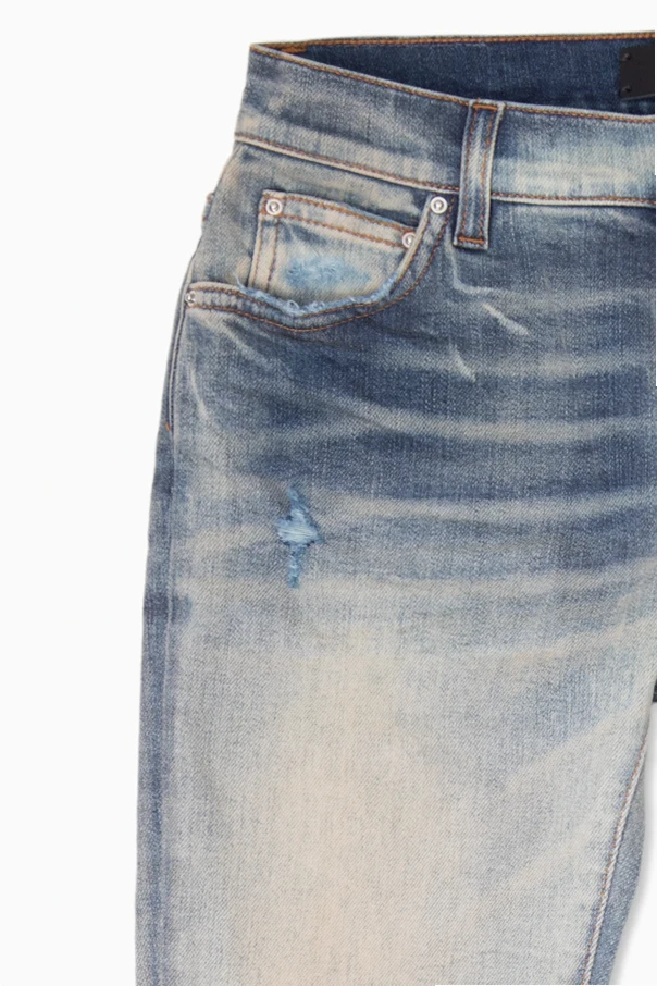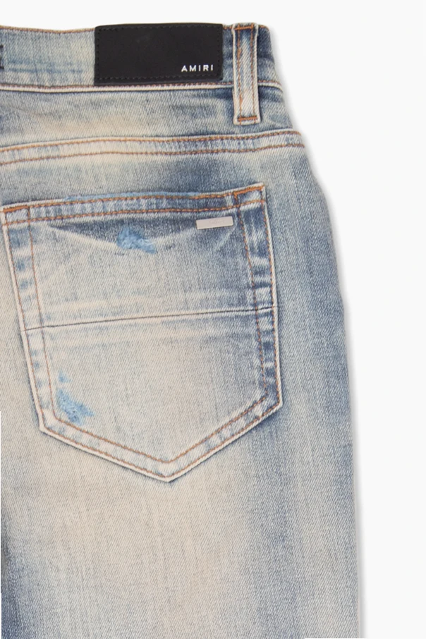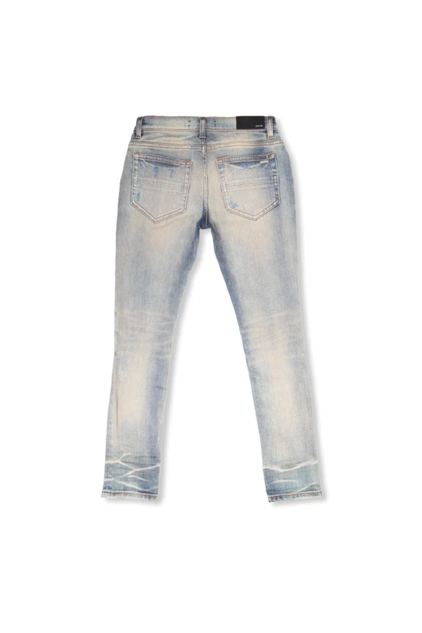 Niebiesko-beżowe jeansy z przetarciami Amiri Kids. Zapinane na zamek i guzik. Pięć kieszeni: trzy z przodu i dwie z tyłu - na jednej aplikacja z logo. Zwężane nogawki.
