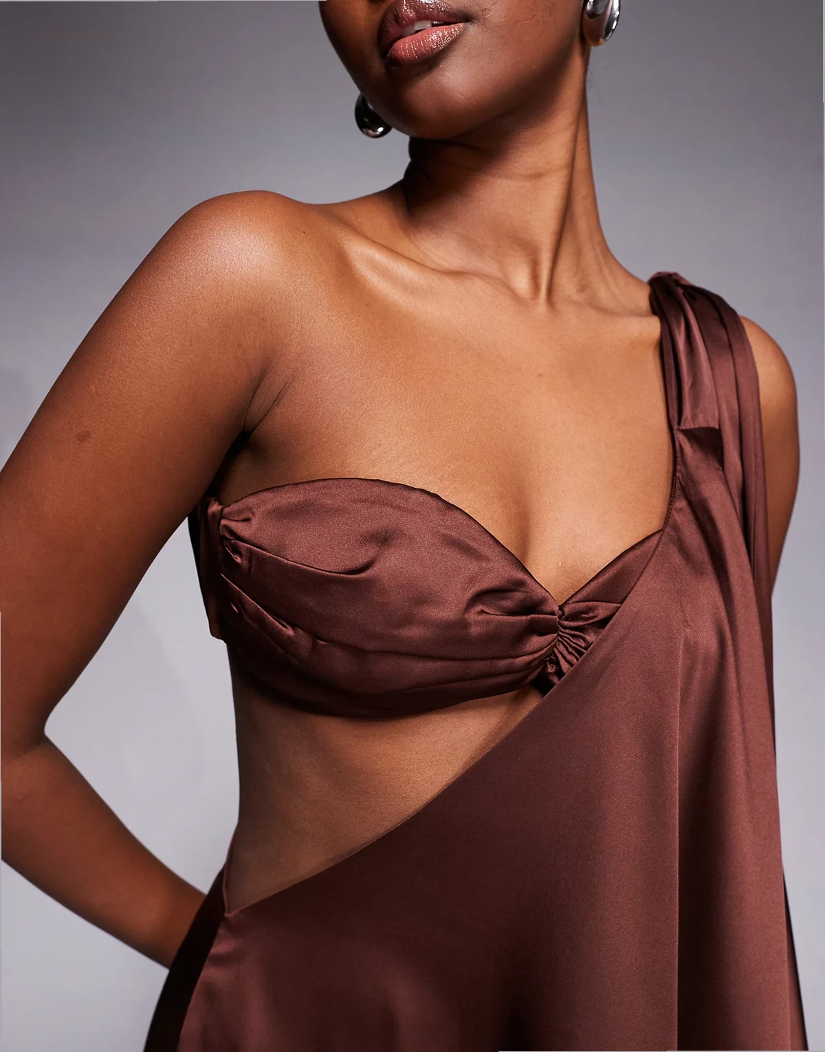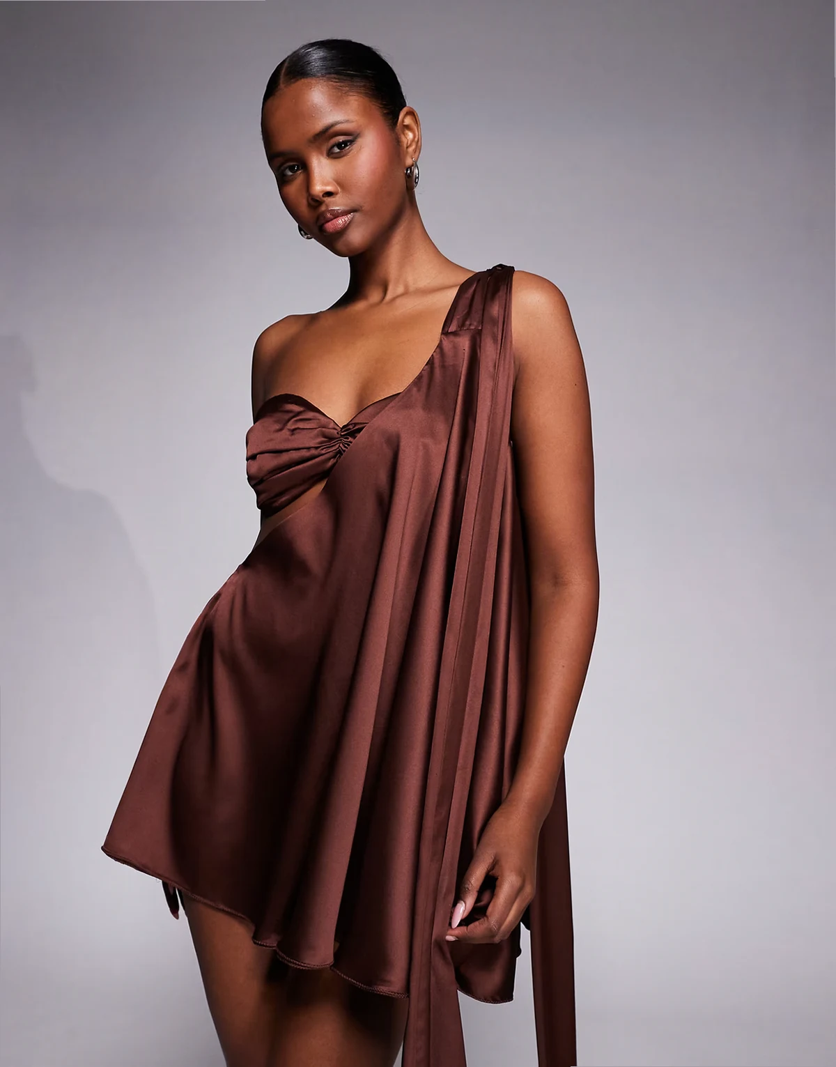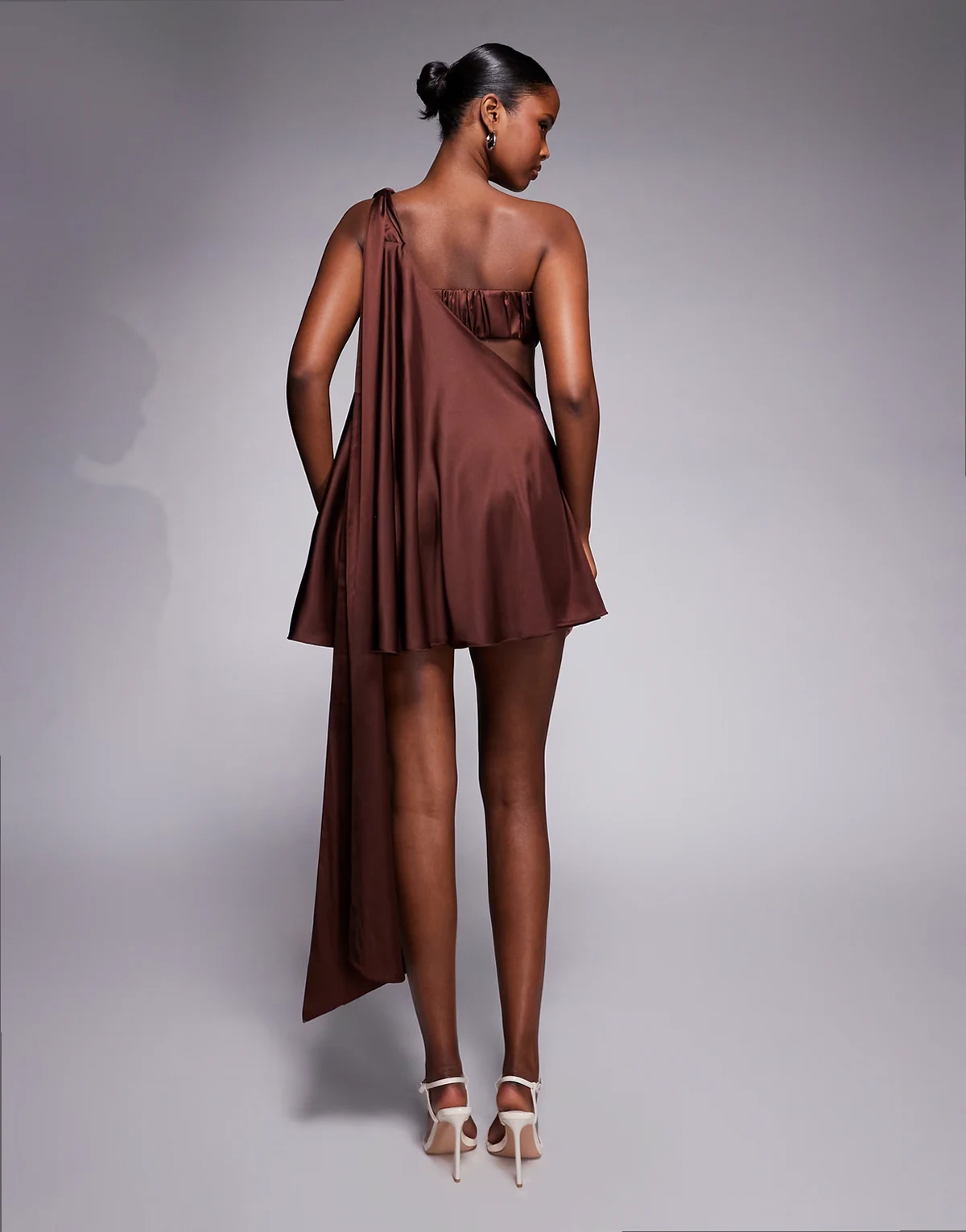 – Anthia – Asymetryczna satynowa sukienka mini w brązowym kolorze