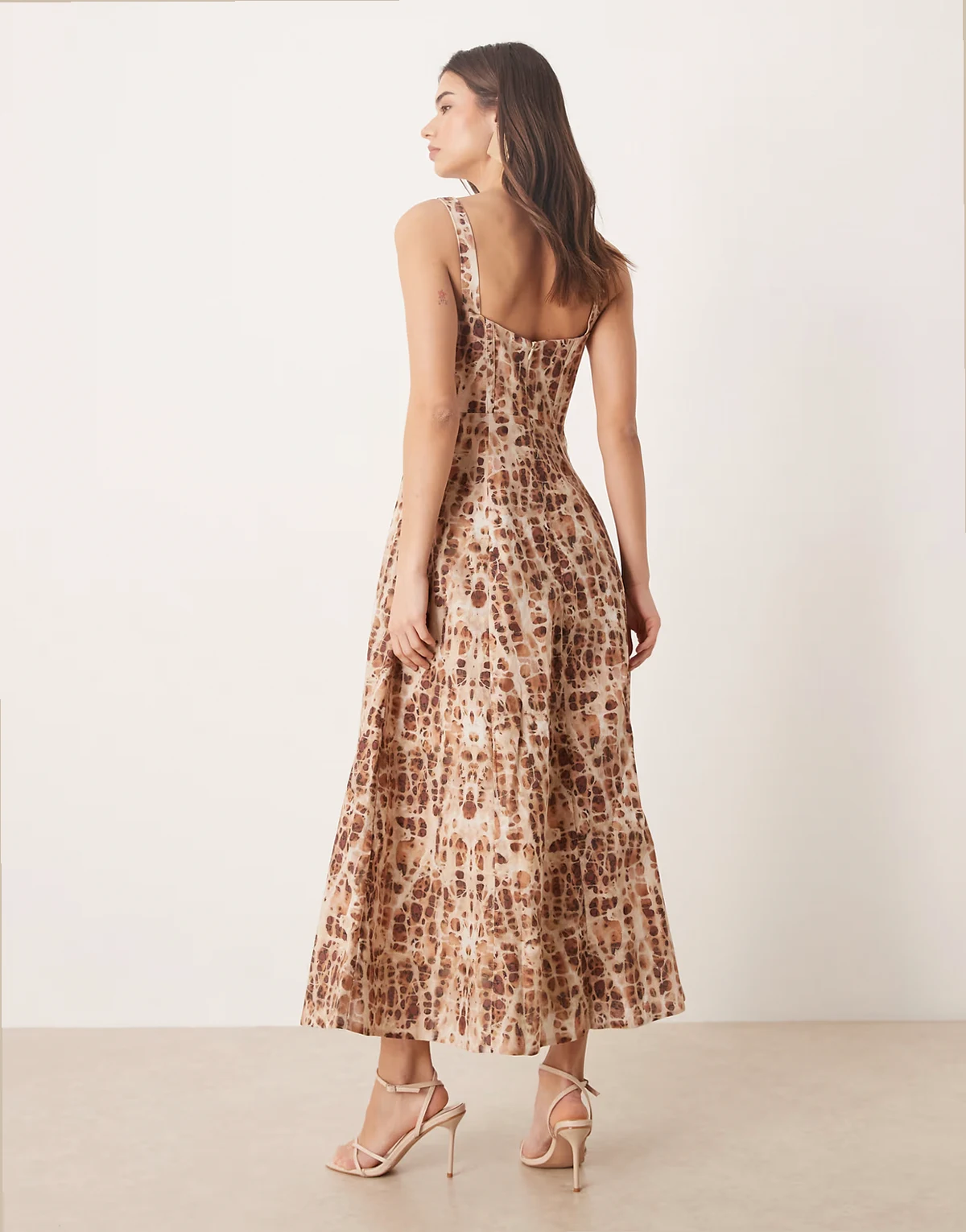 – Brązowa sukienka gorsetowa midi o kroju skater ze zwężaną talią w abstrakcyjny wzór