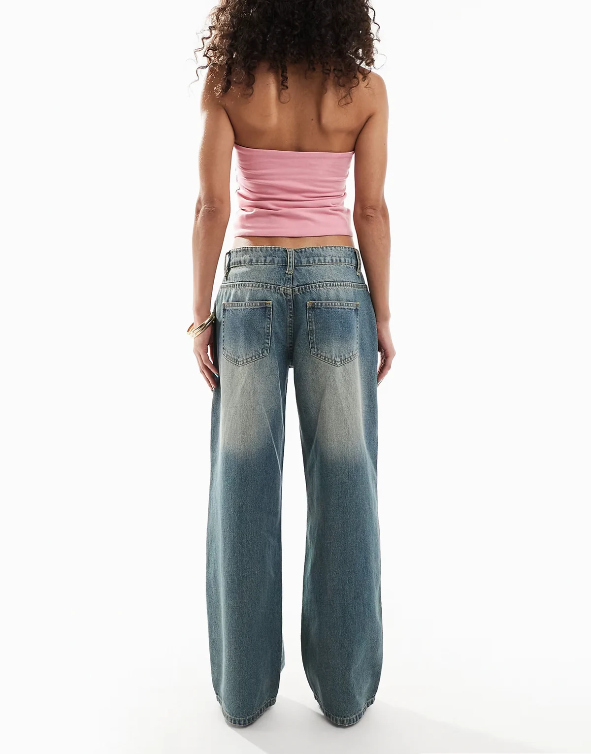 – Niebieskie obszerne jeansy z niskim stanem z efektem sprania