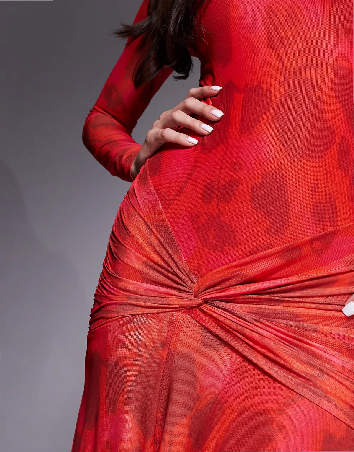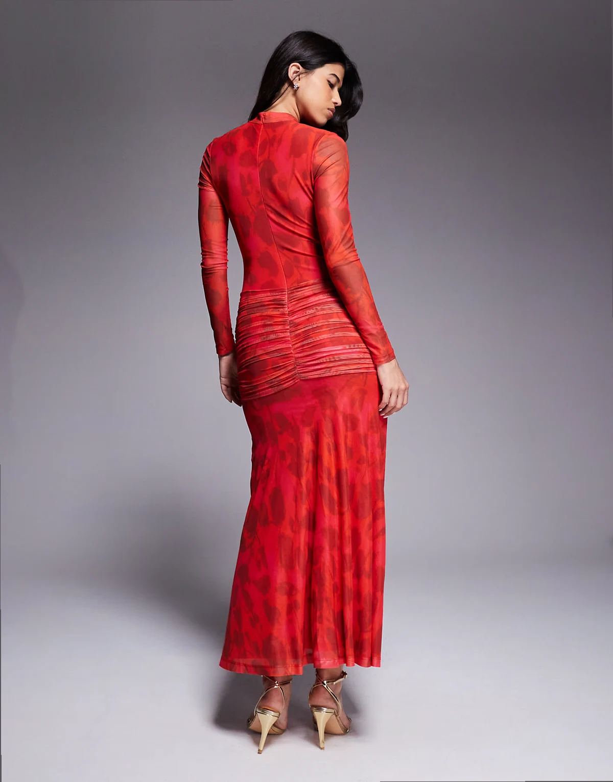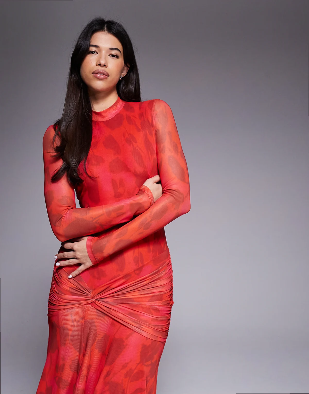 – Lea – Czerwona siateczkowa sukienka maxi z długimi rękawami, marszczeniem w talii i rozcięciem z przodu w kwiatowy wzór