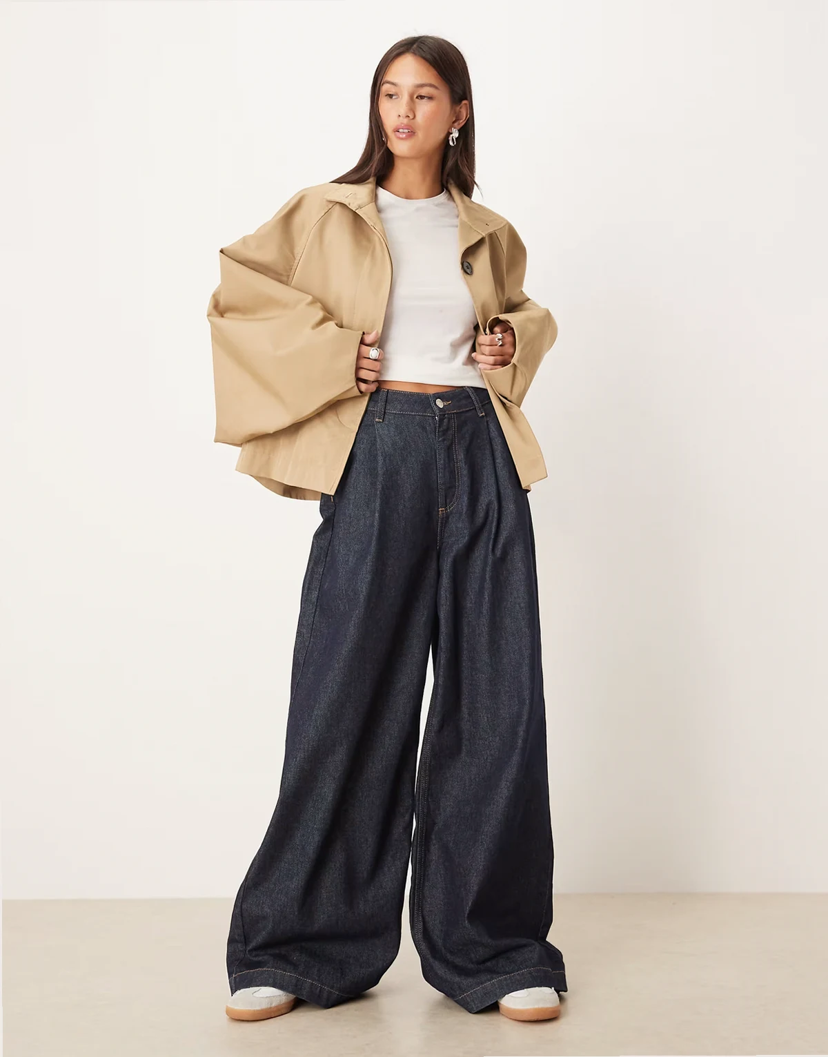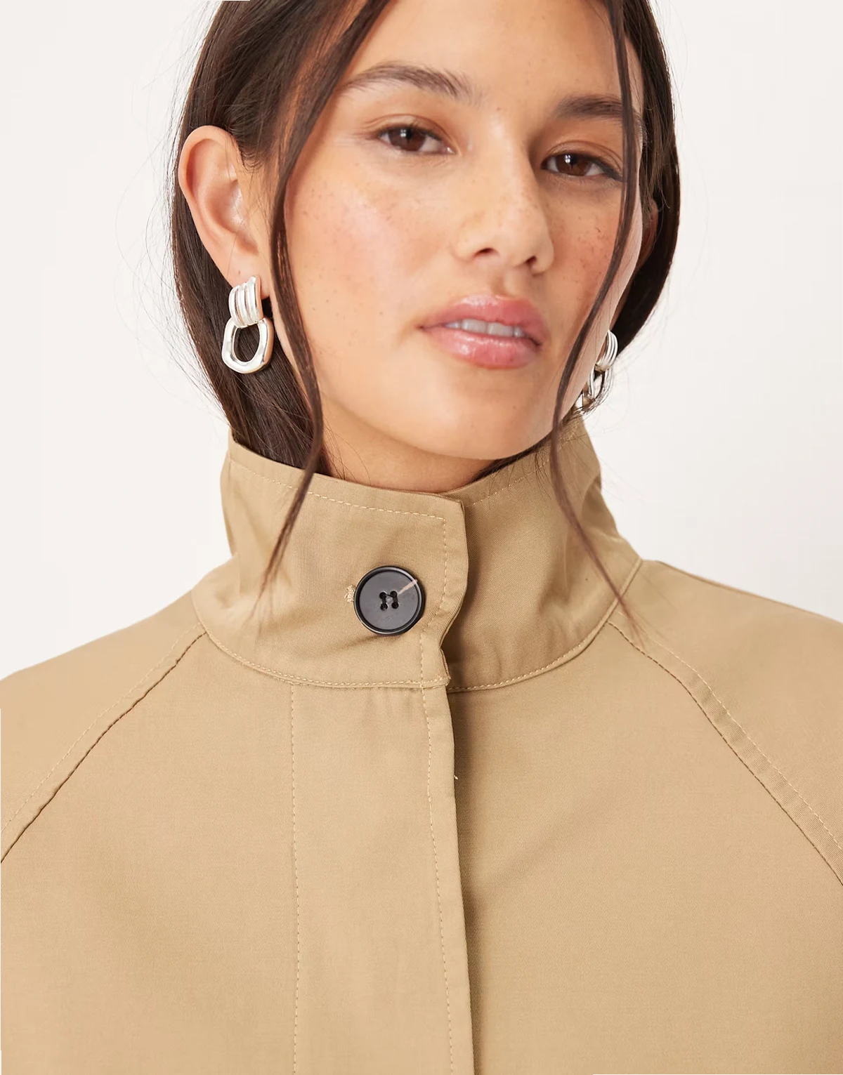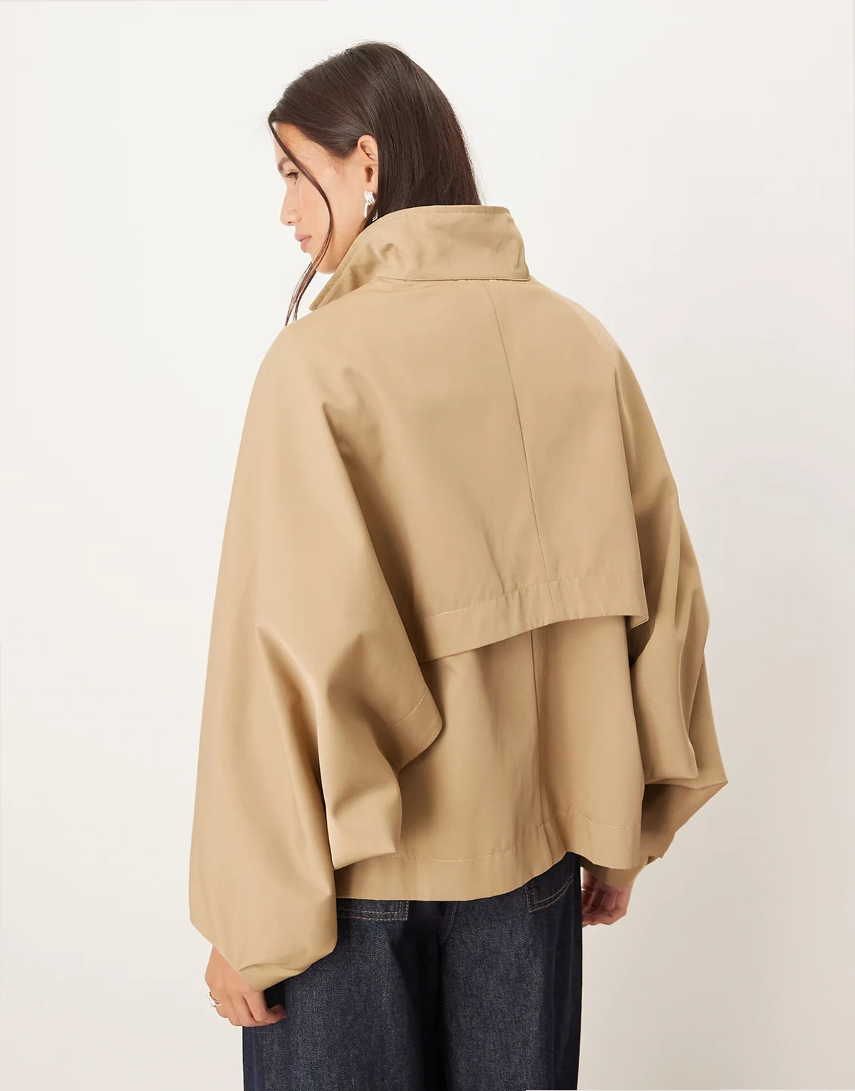 – Krótki beżowy trencz o fasonie pelerynki