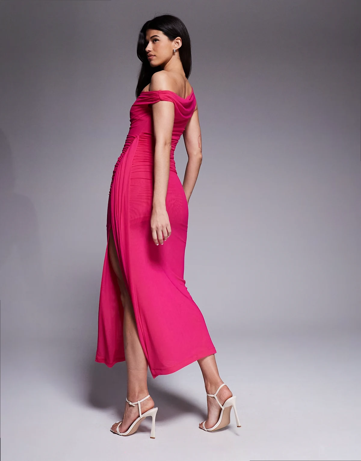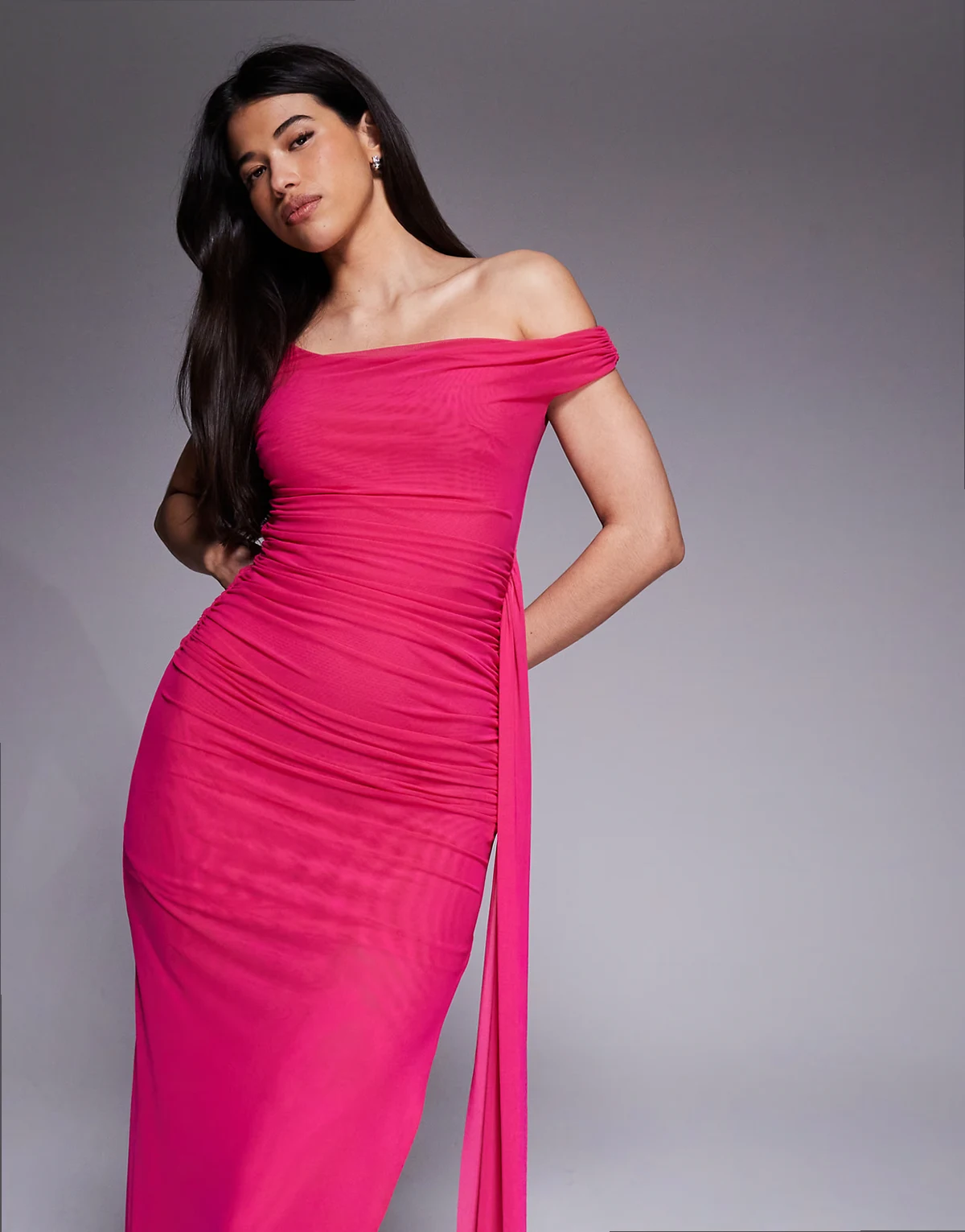 4. – Layana – Jaskraworóżowa marszczona sukienka midaxi na jedno ramię z siateczki ze skręconym detalem