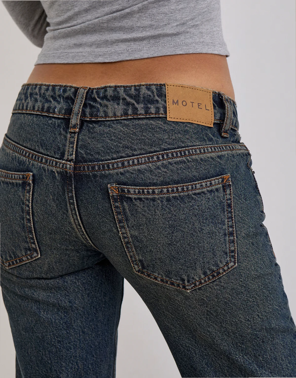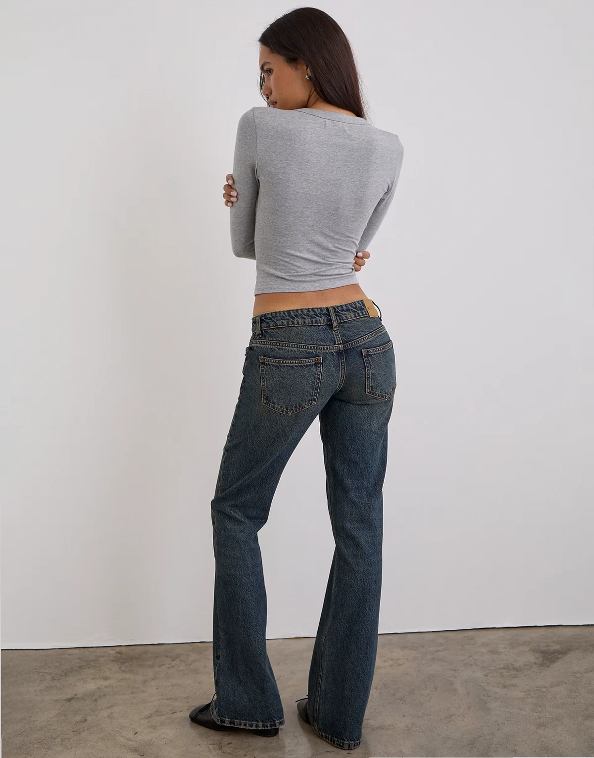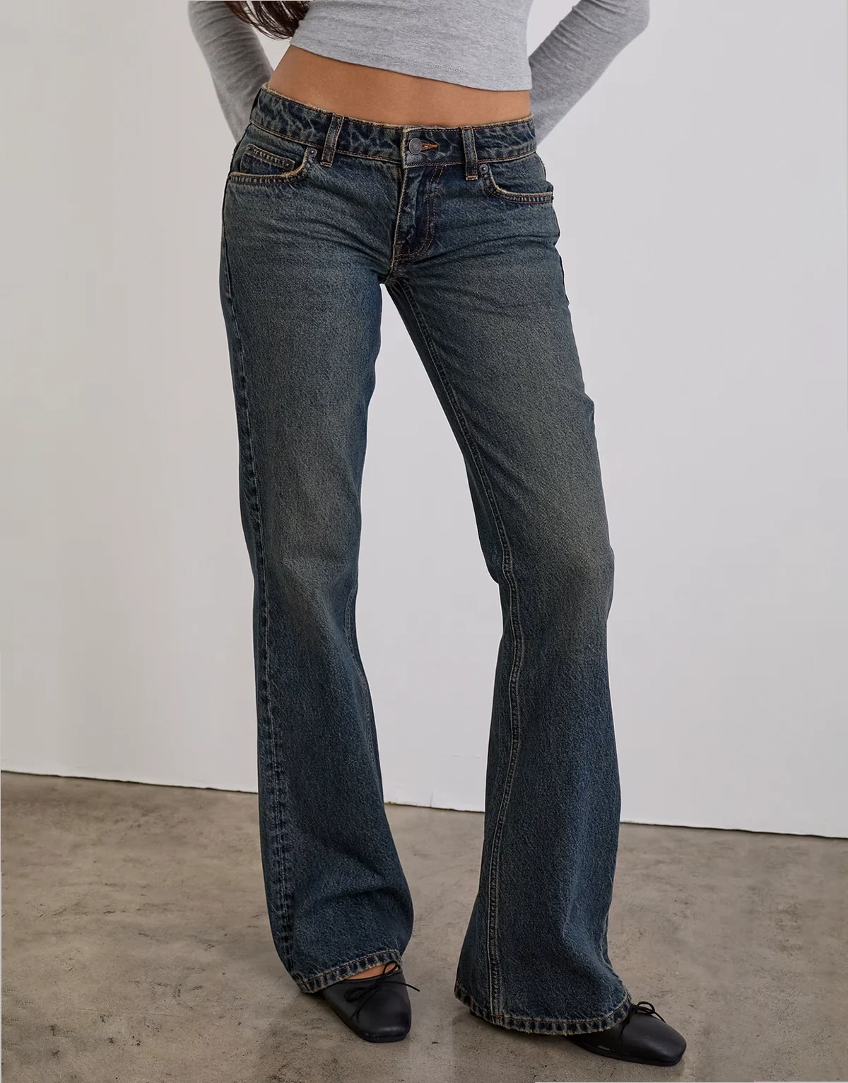 – Zielone jeansy z rozszerzanymi nogawkami i obniżonym stanem
