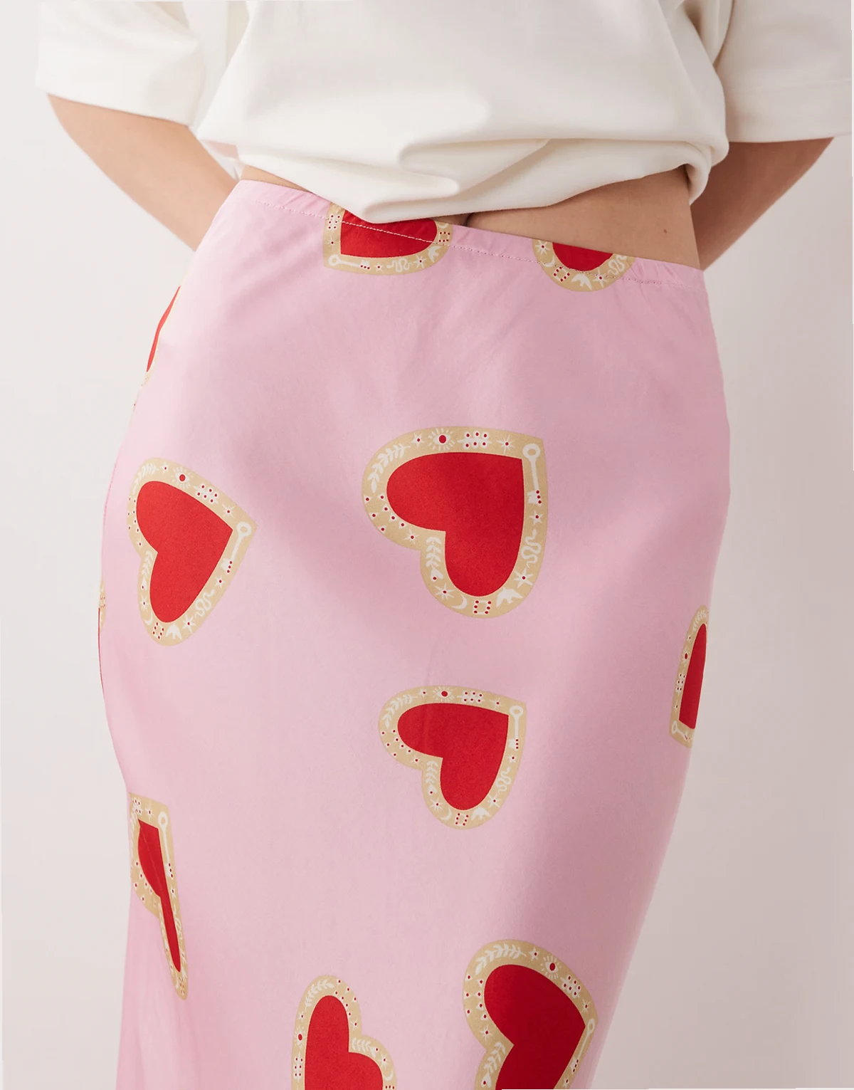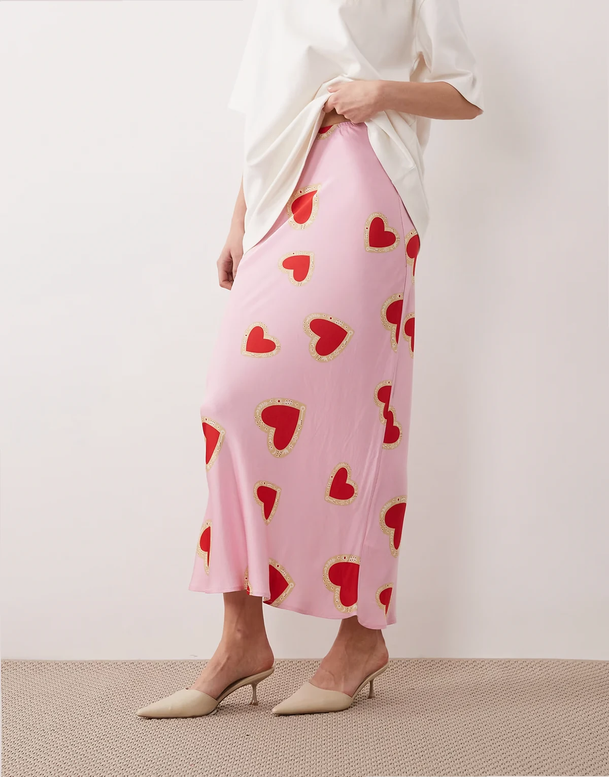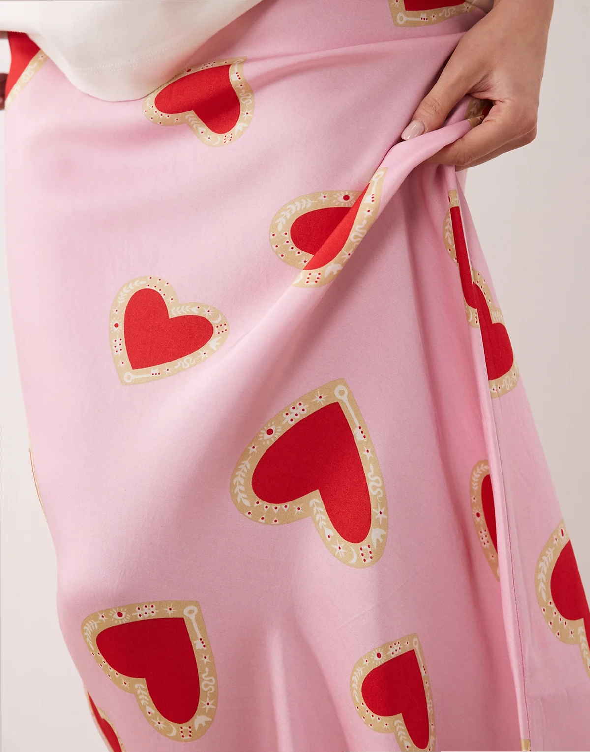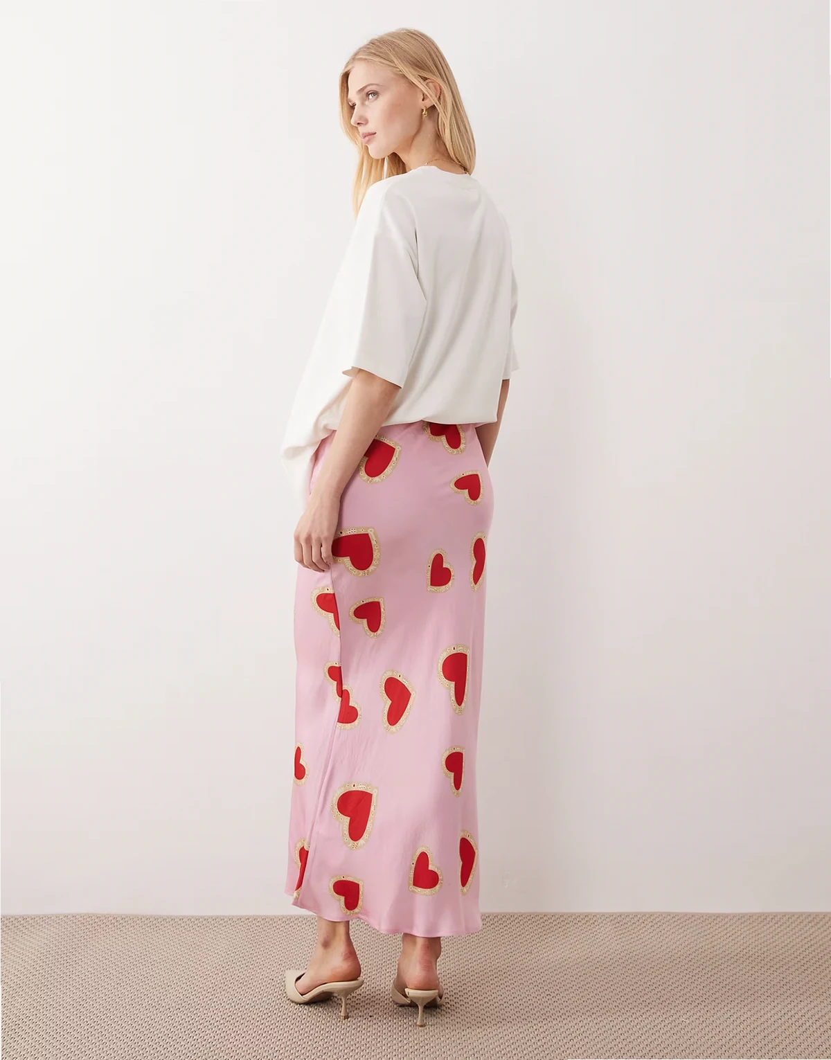 – Dorris – Różowa satynowa spódnica maxi we wzór w serca
