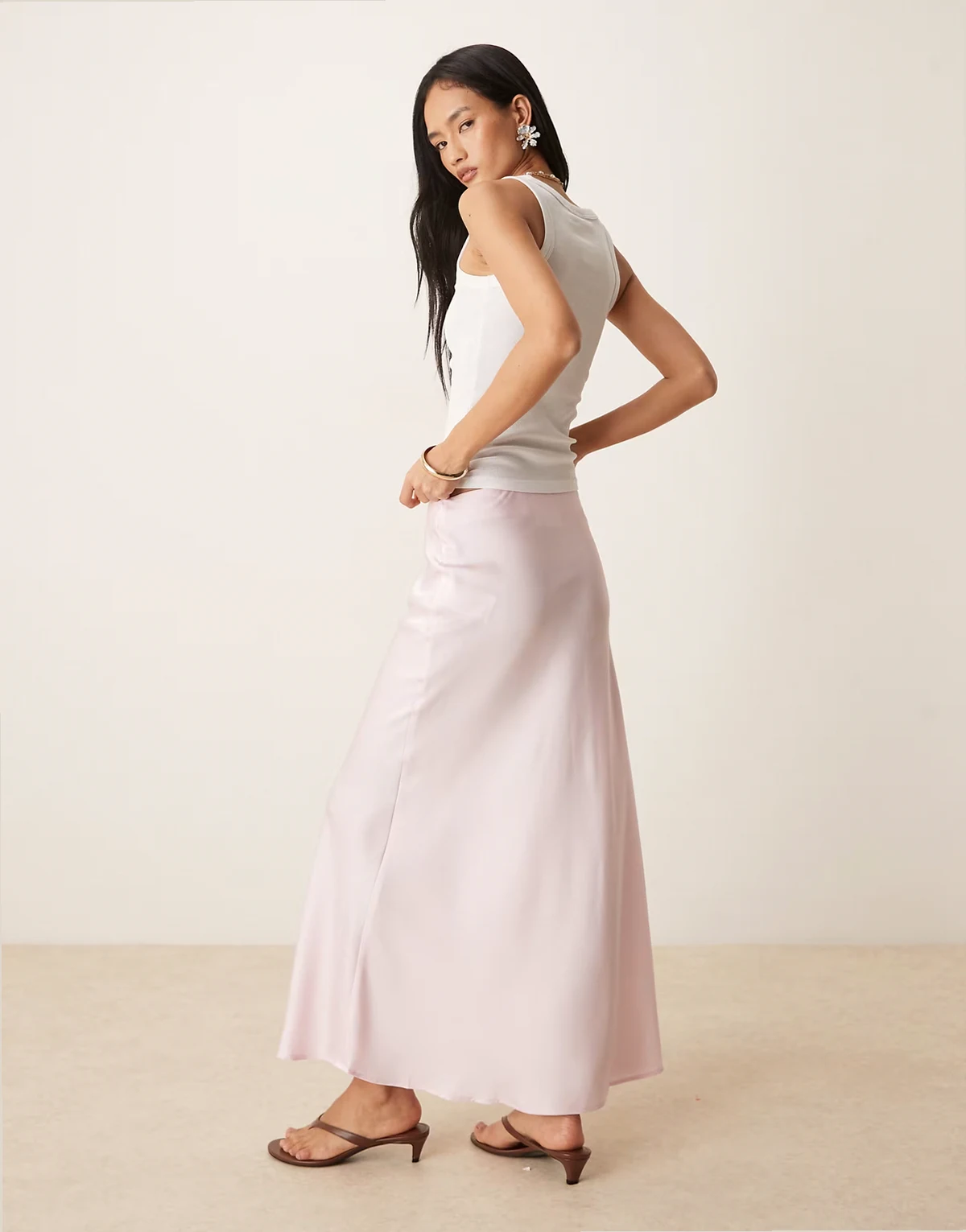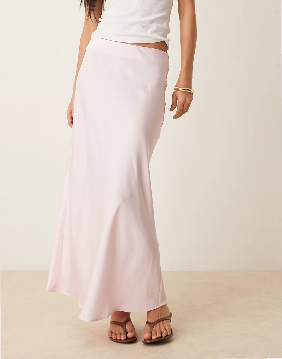 – Jasnoróżowa satynowa spódnica maxi