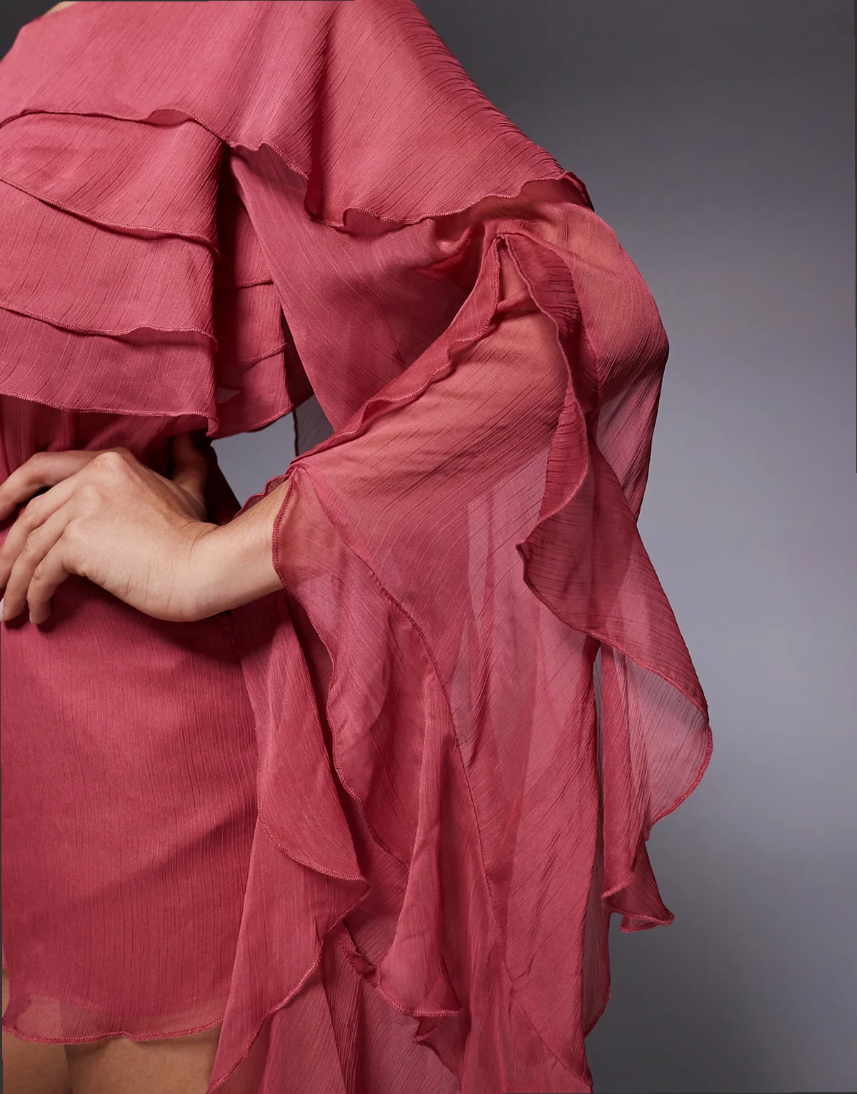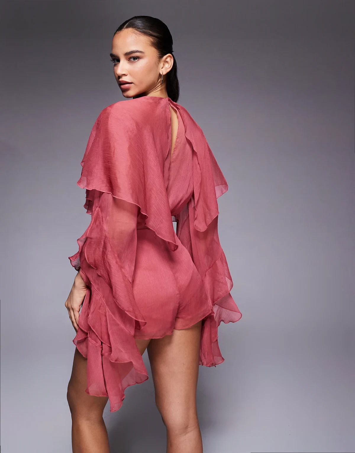 – Carson – Różany krótki kombinezon z prześwitującego szyfonu z falbanką i obszernymi rękawami o kroju peleryny