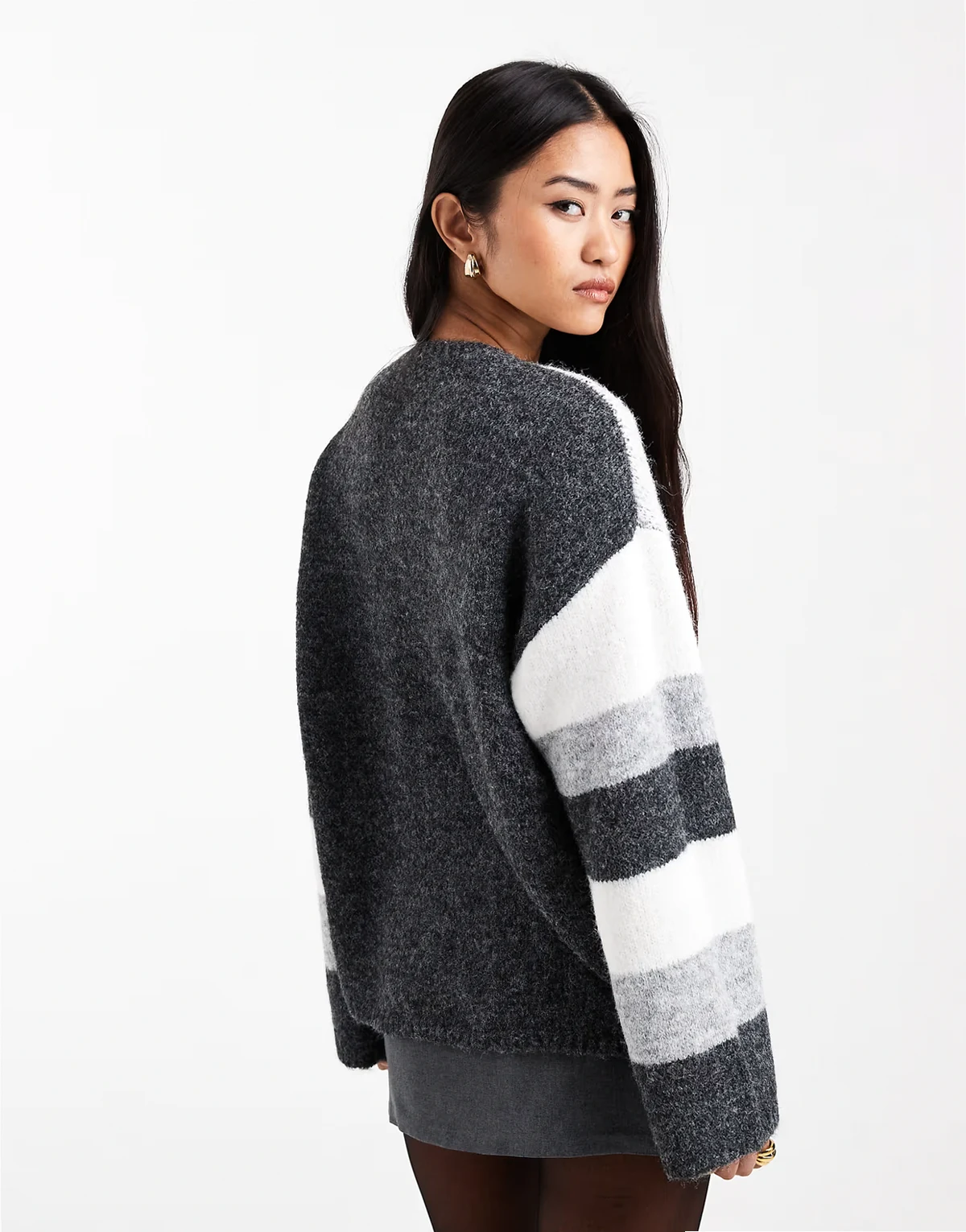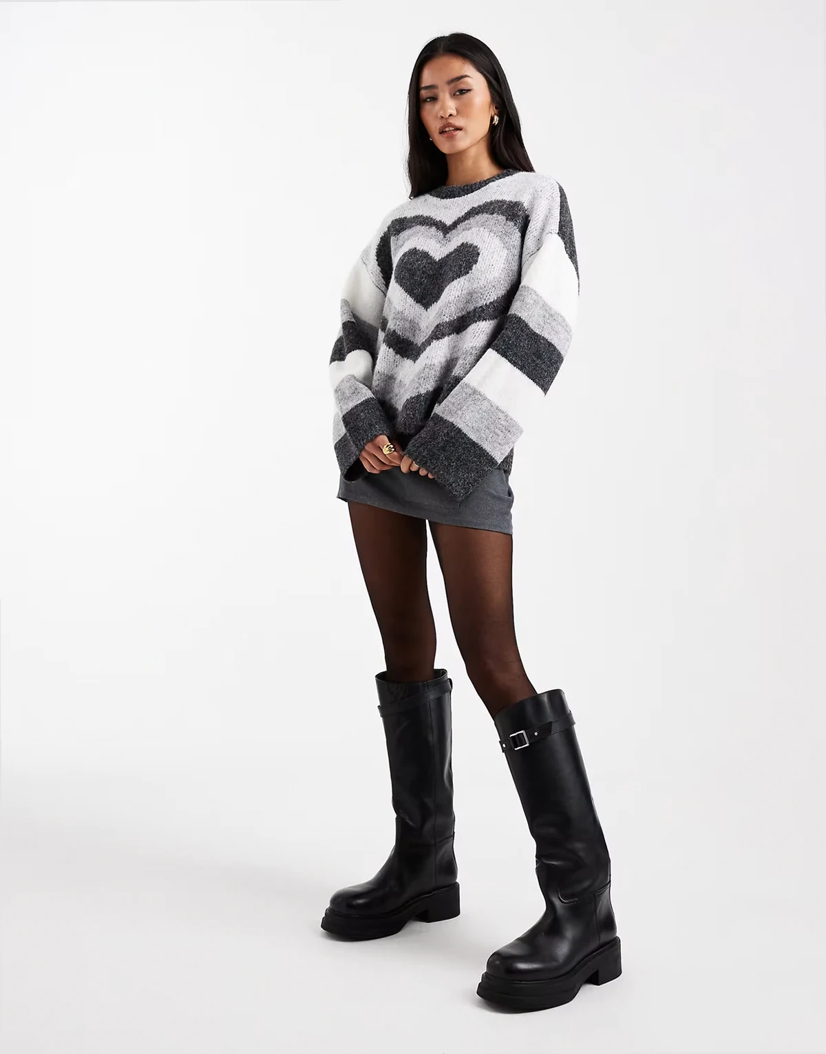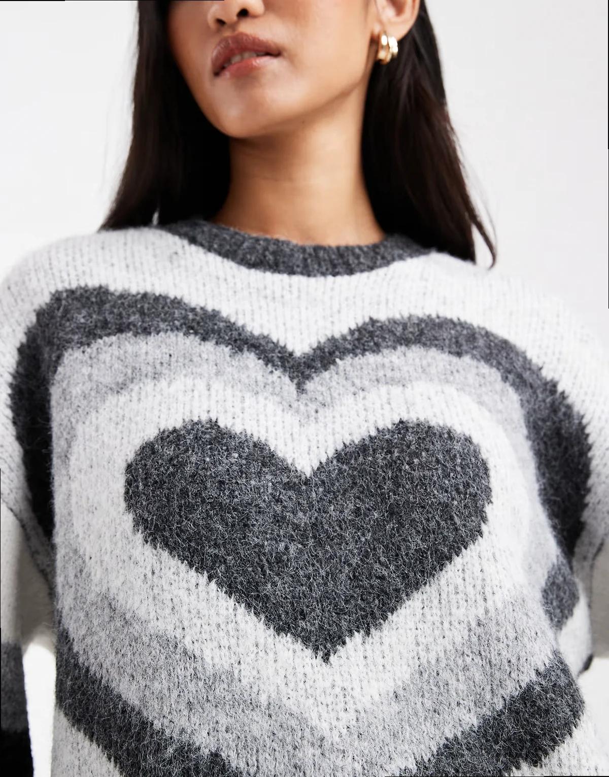 – Szaro-biały sweter oversize ze wzorem w serca
