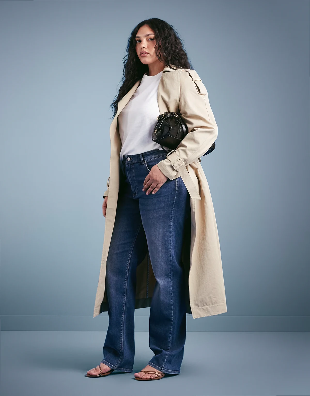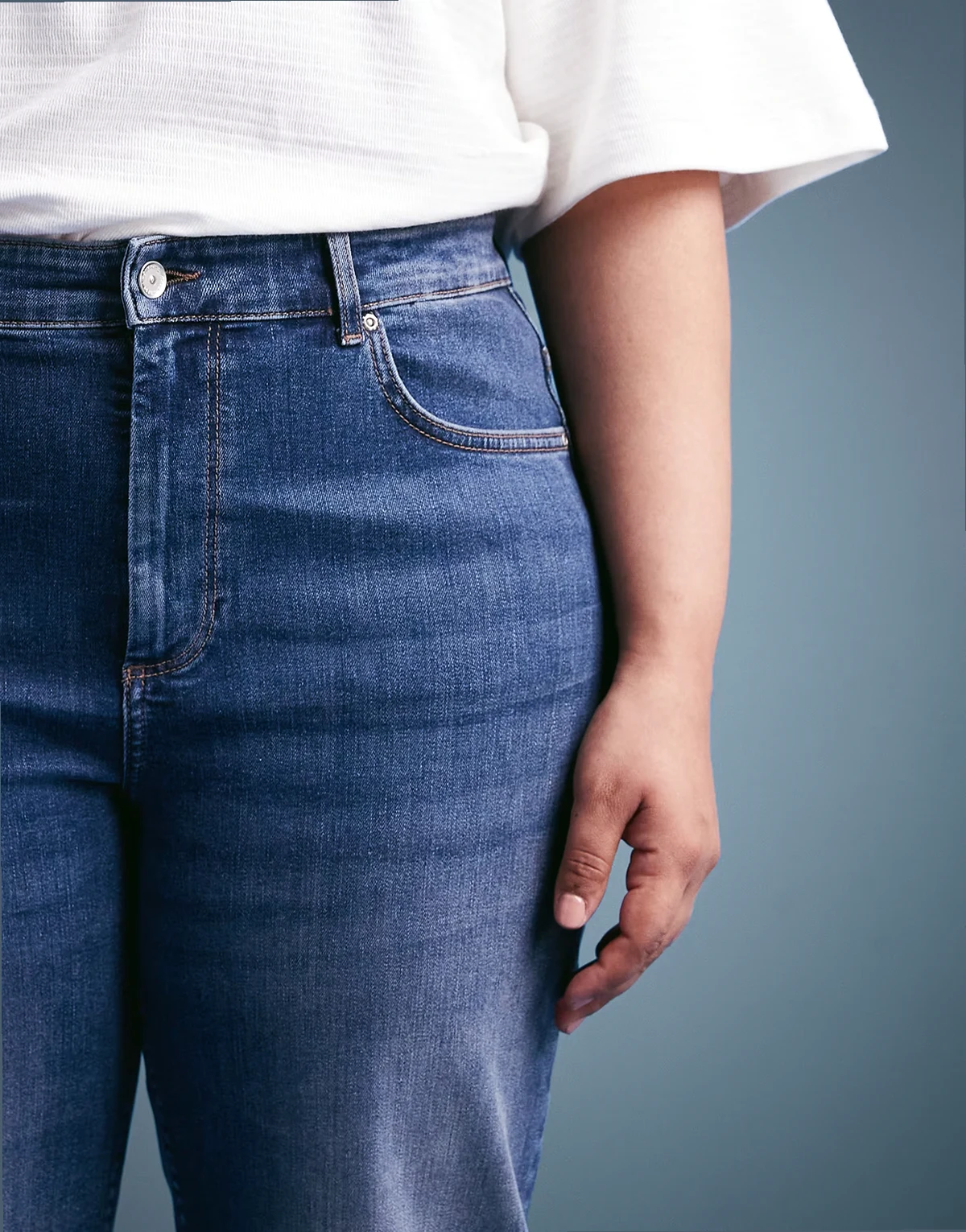 – Ciemnoniebieskie jeansy z prostymi nogawkami