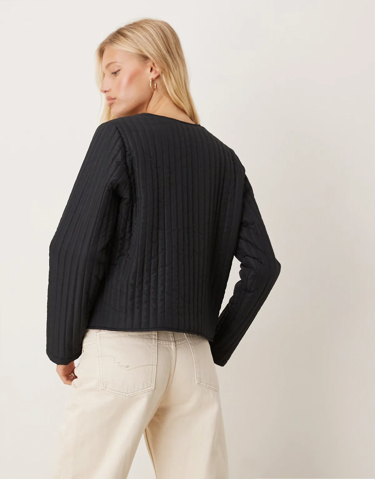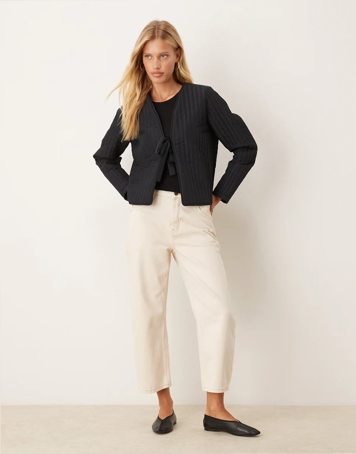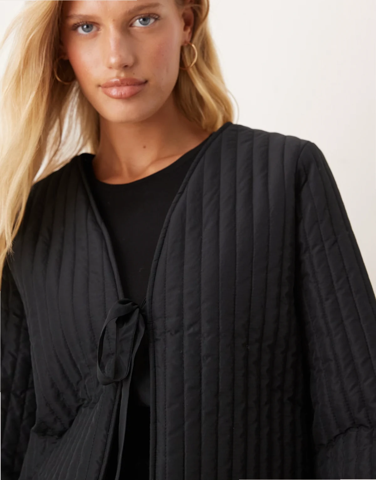 – Czarna pikowana kurtka z wiązaniem z przodu