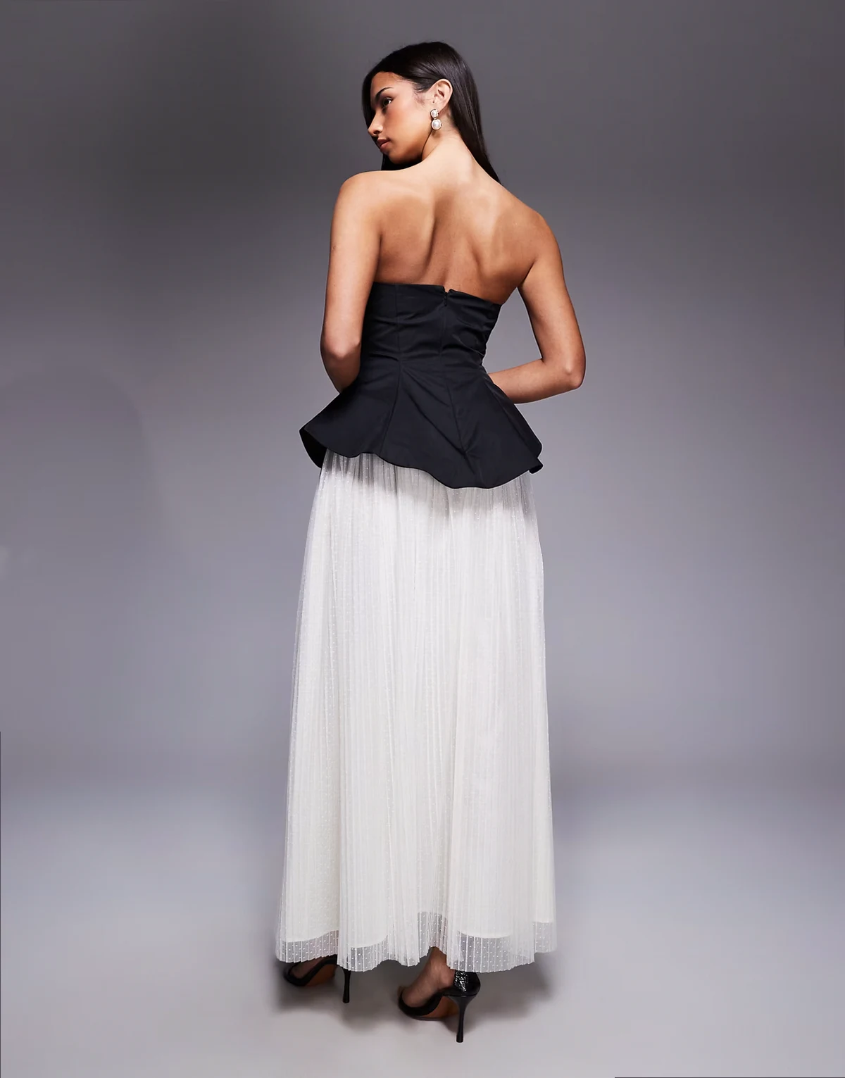 – Czarno-biała sukienka maxi z modelującym topem z dekoltem bandeau i plisowaną siateczkową spódnicą z materiału dobby