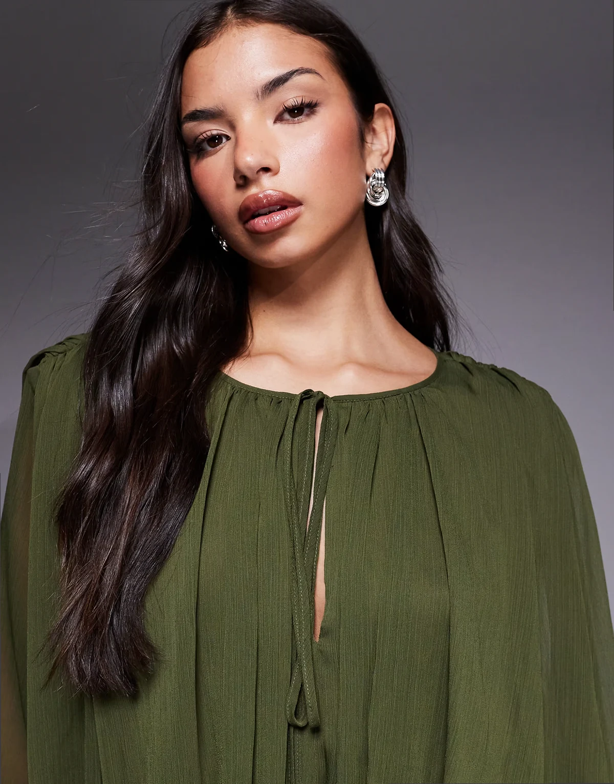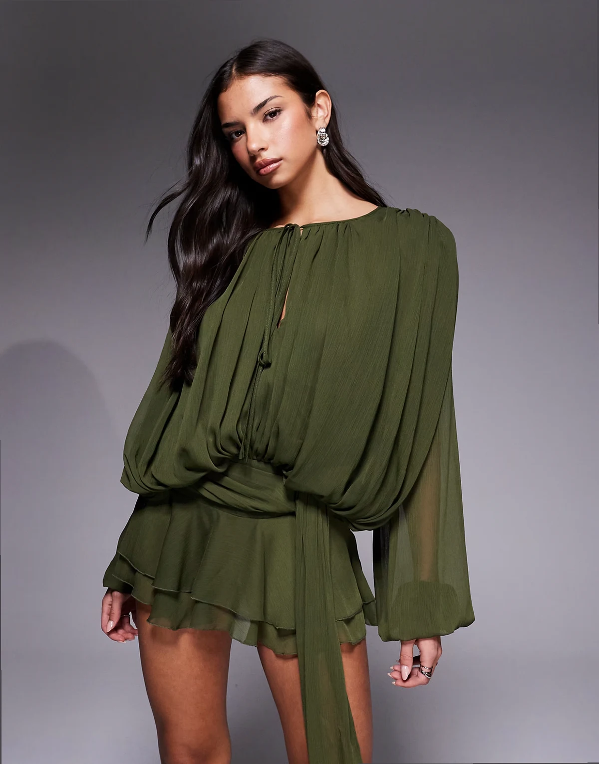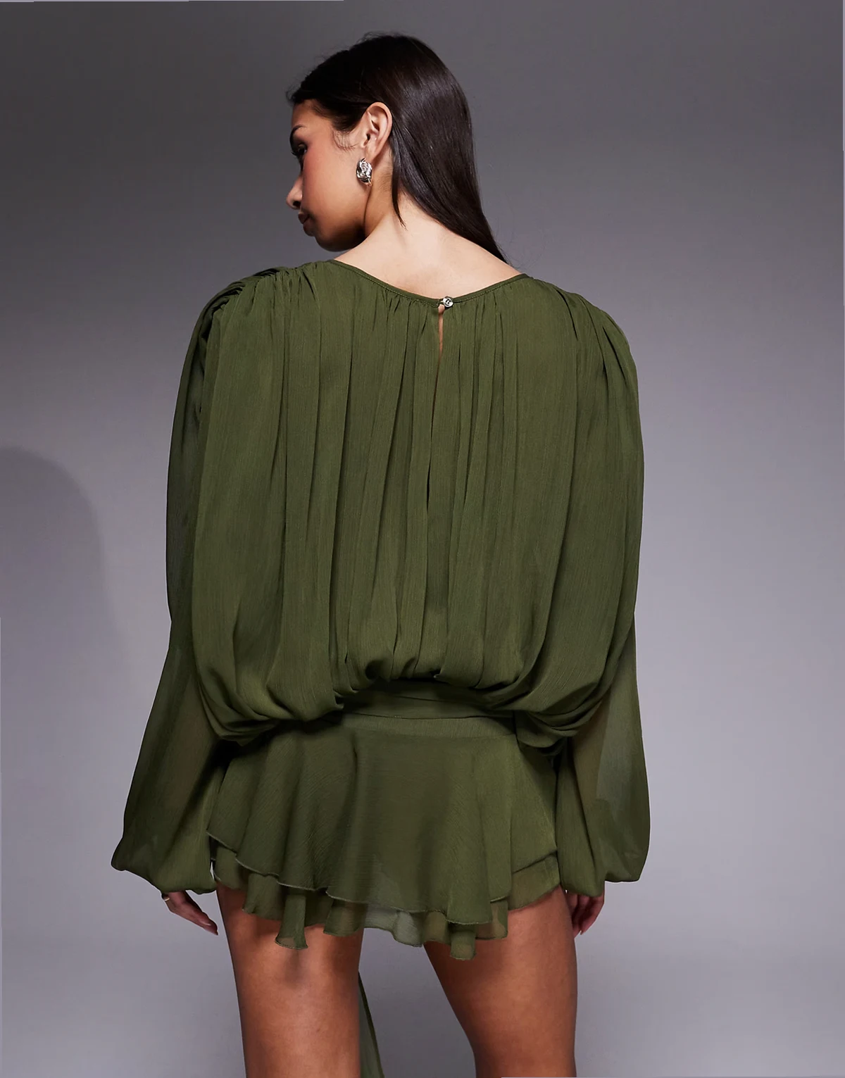 Elements – Szyfonowa drapowana sukienka mini w kolorze khaki z balonowymi rękawami i wiązaniem w talii