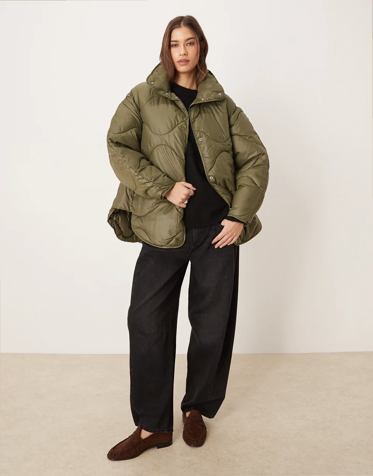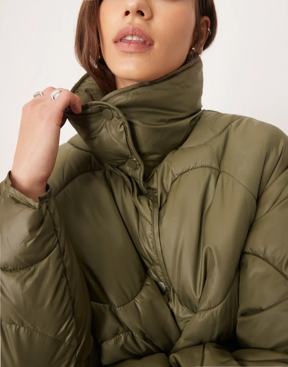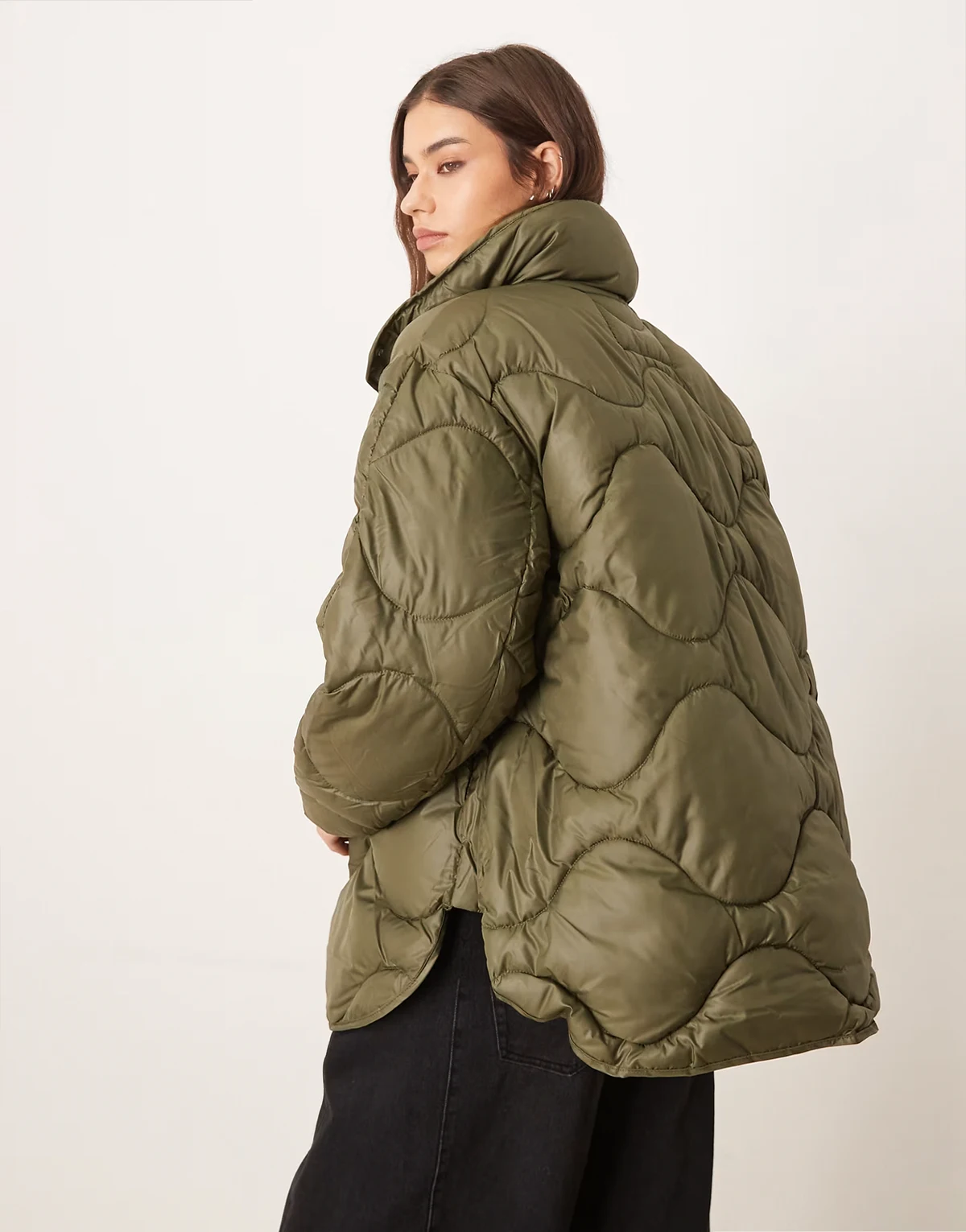 – Zielona kurtka pikowana oversize z wysokim kołnierzem