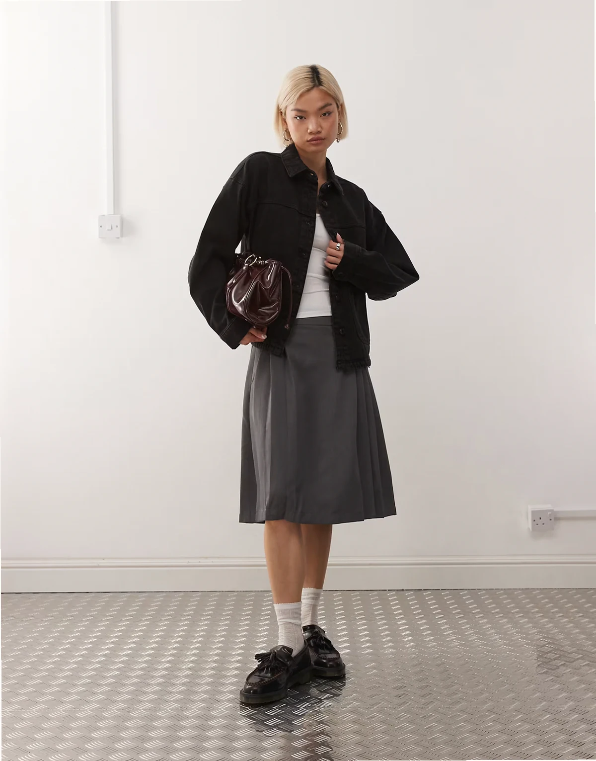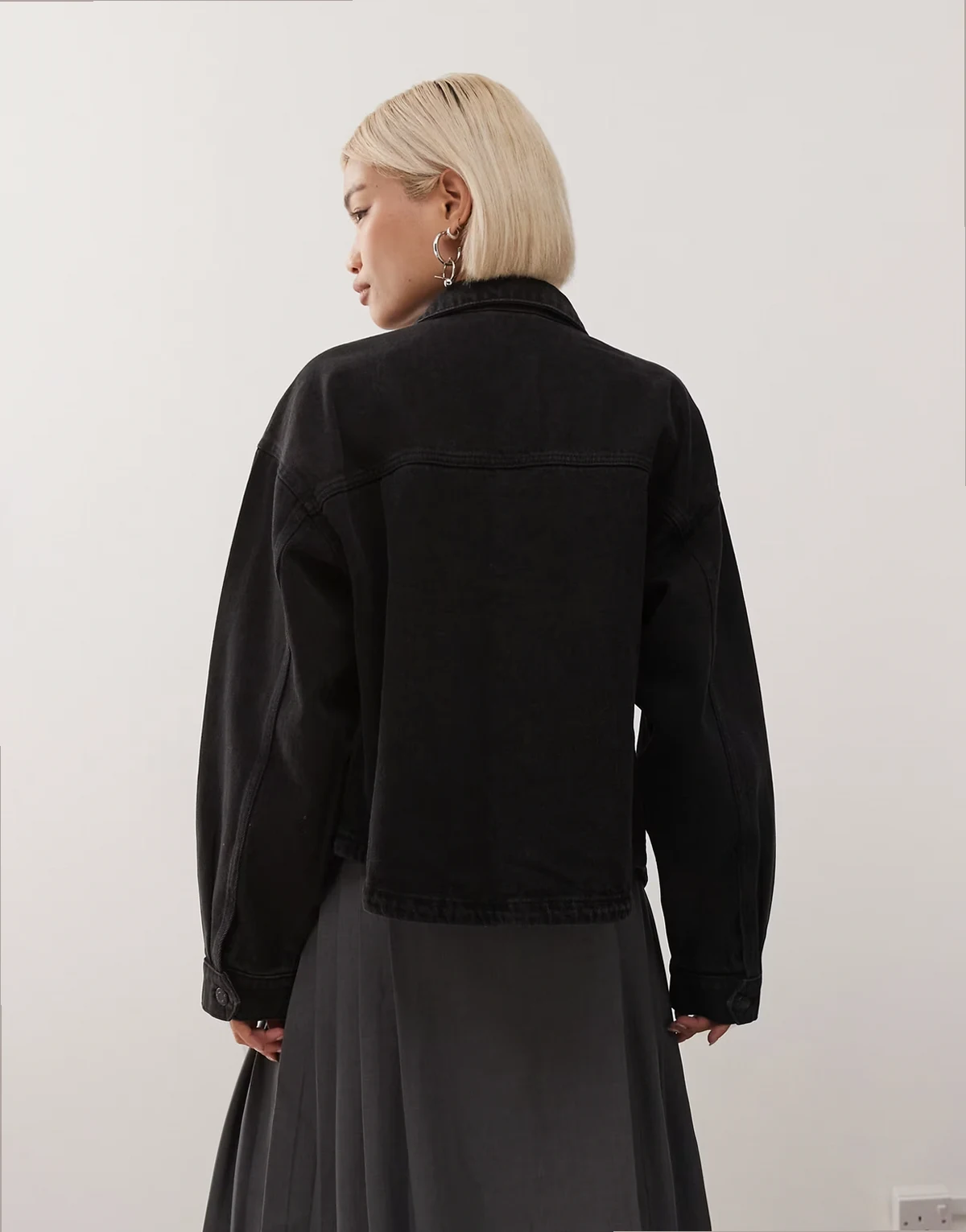 – Czarna kurtka jeansowa o pudełkowym kroju