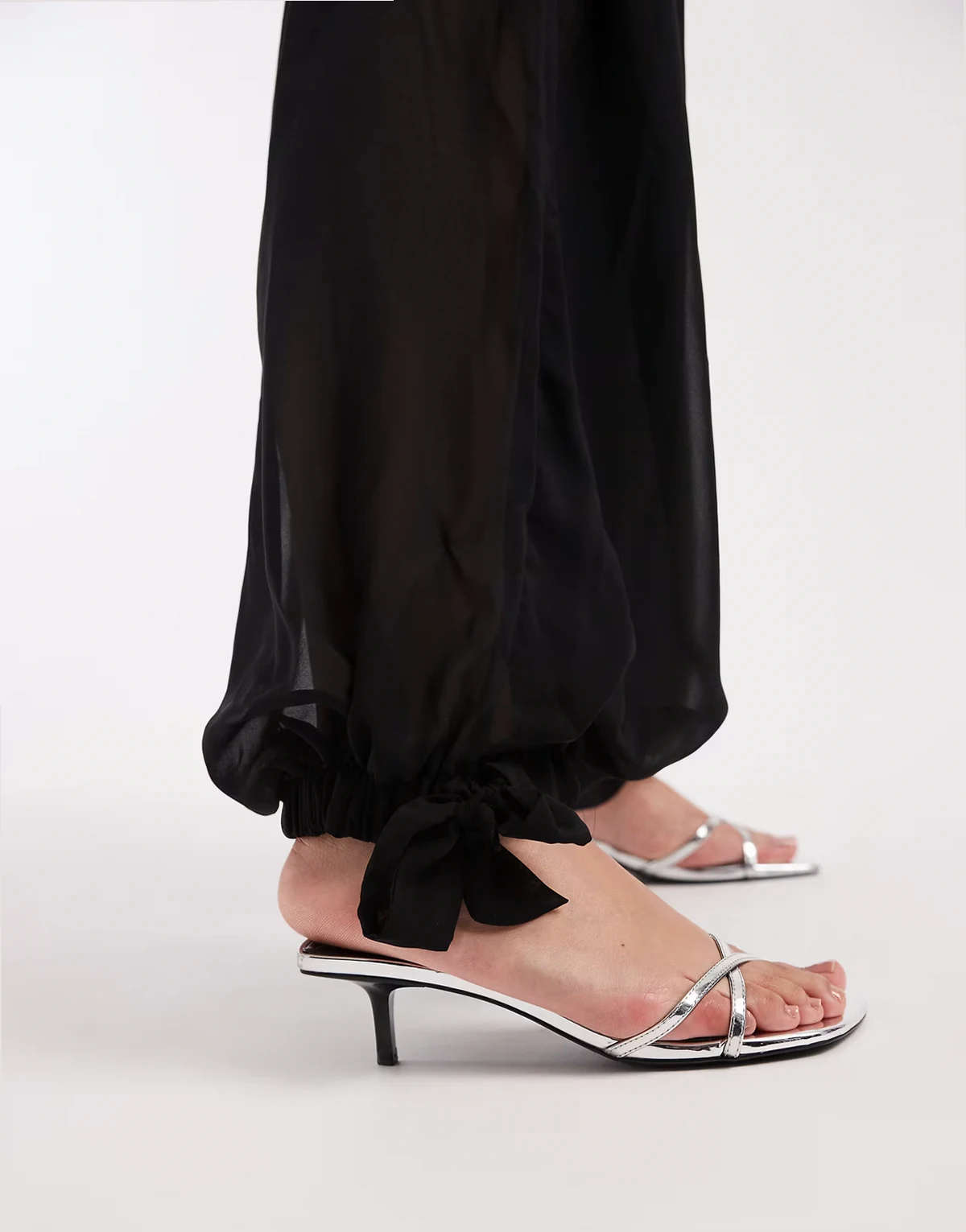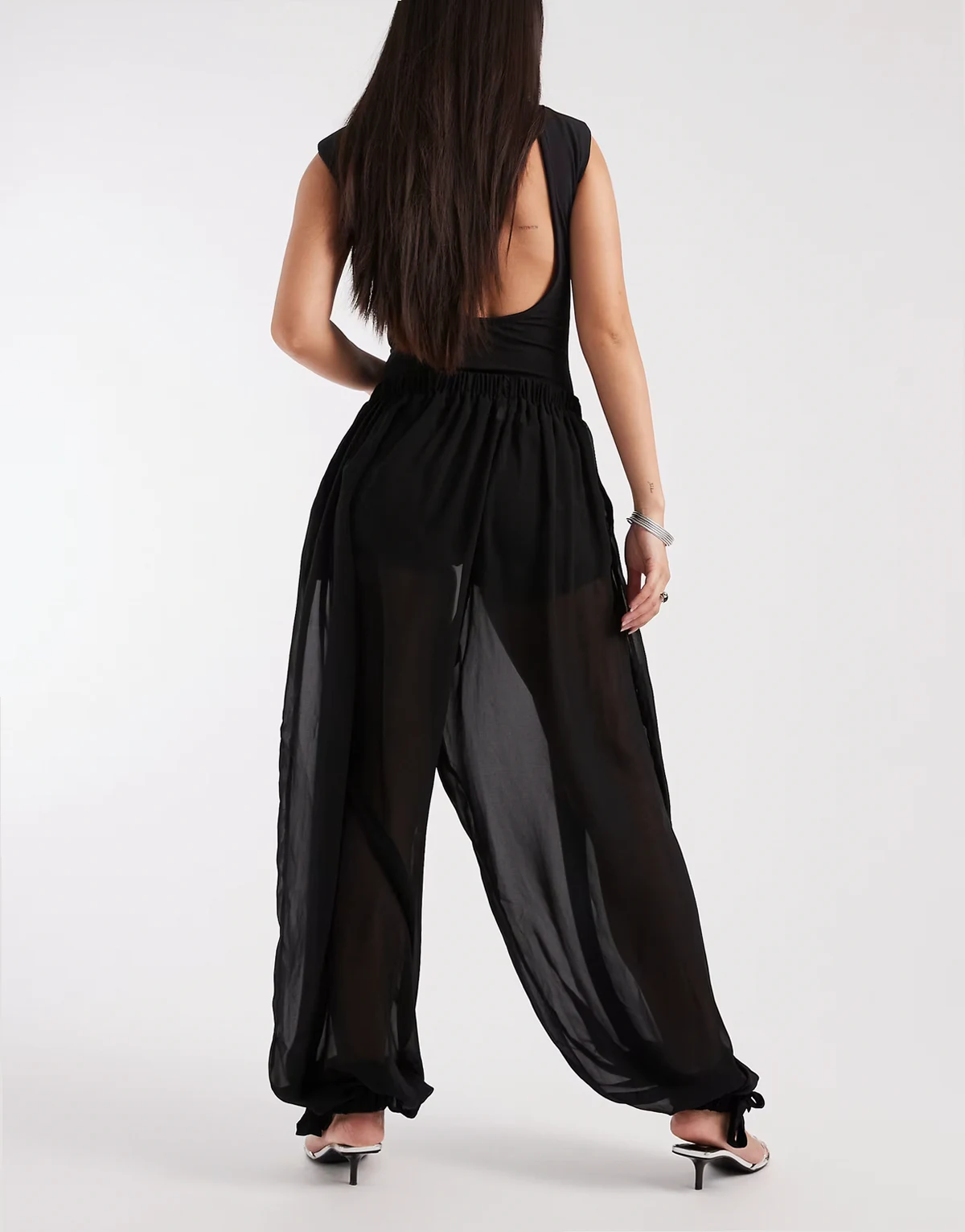 – Czarne prześwitujące szyfonowe spodnie z balonowymi nogawkami