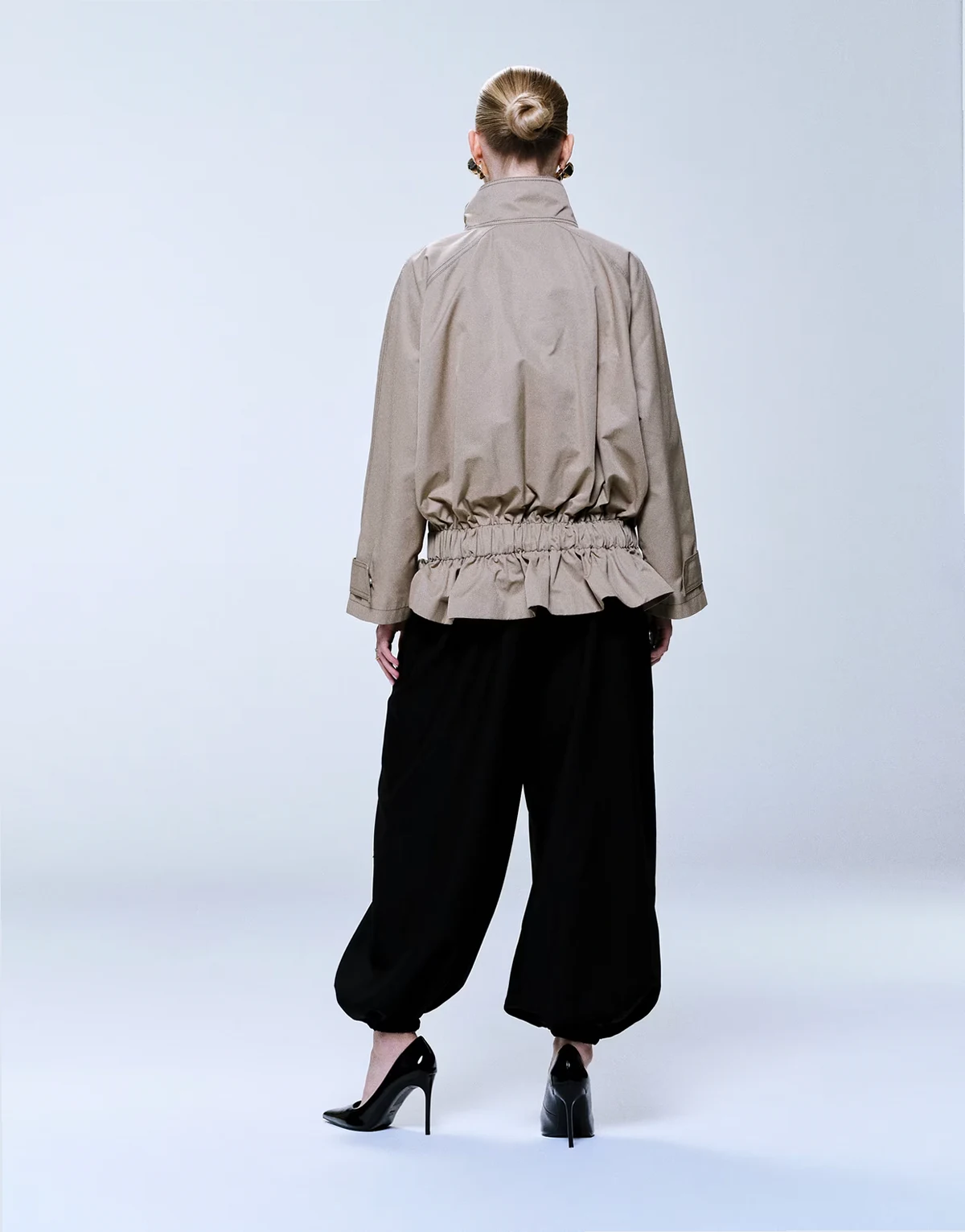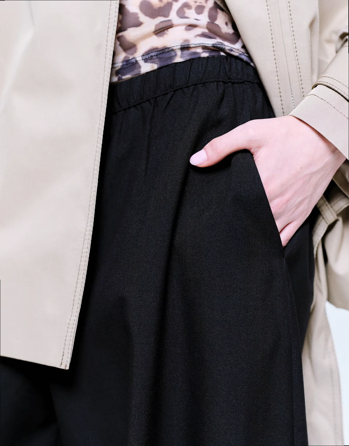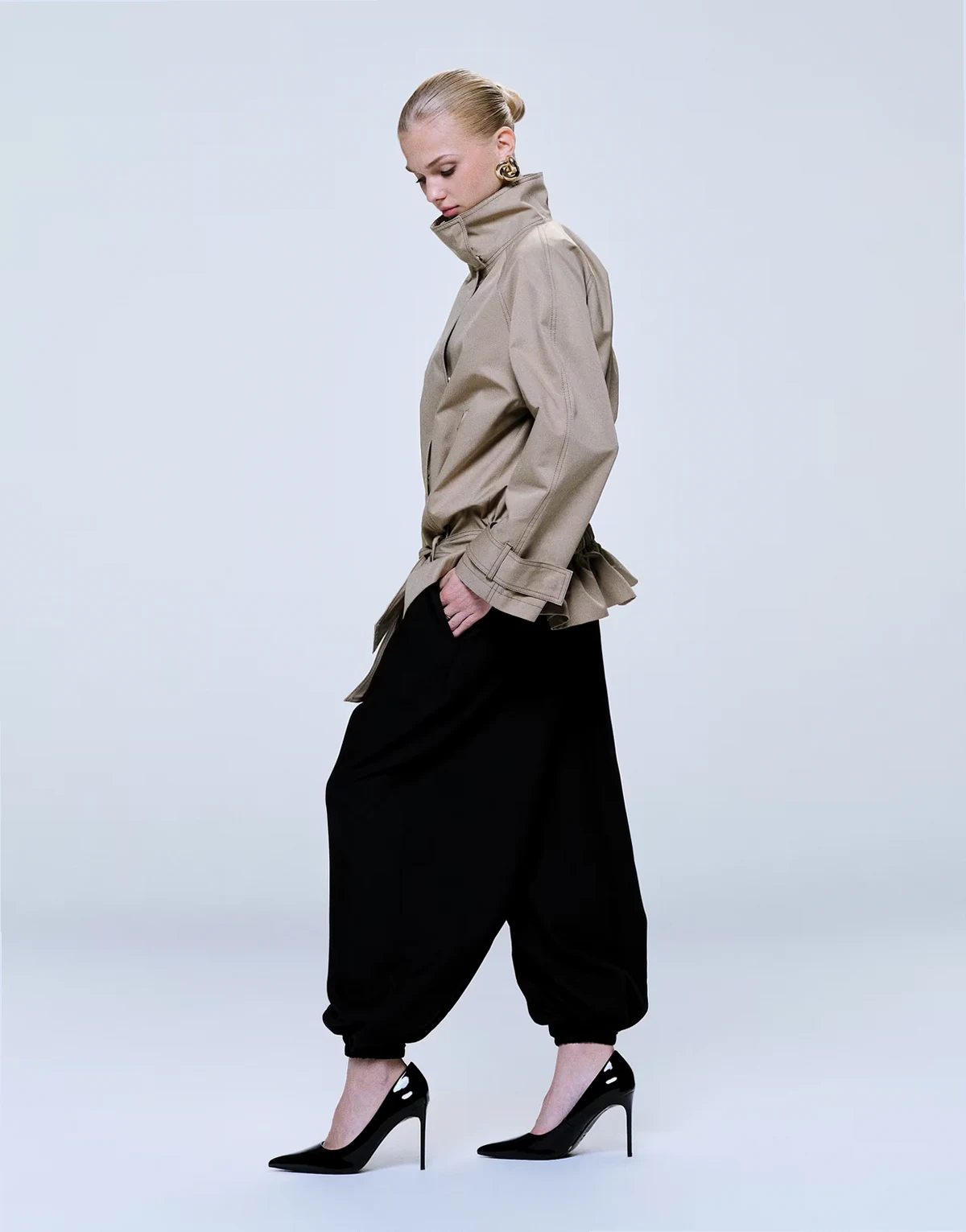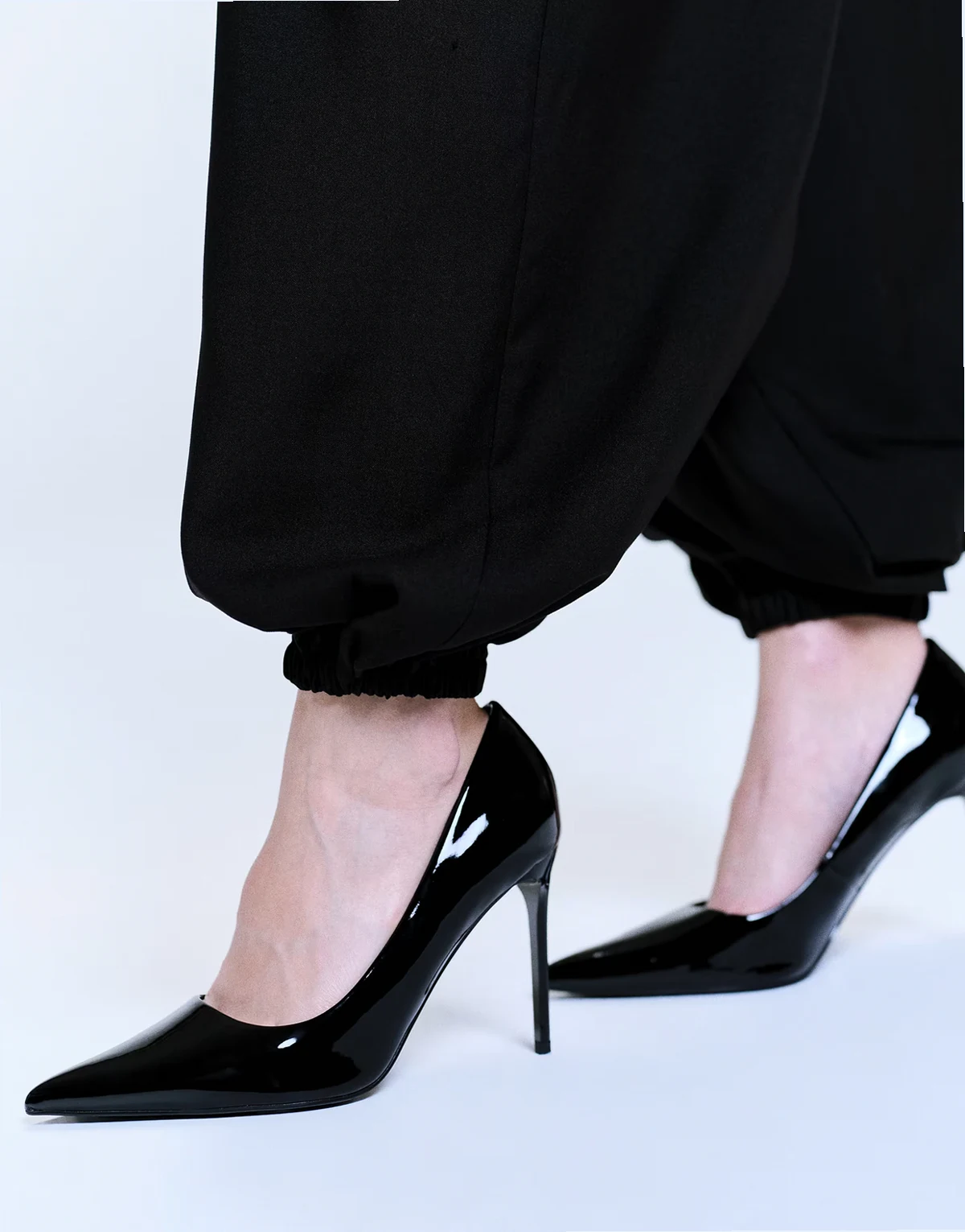 – Czarne spodnie z balonowymi nogawkami i średnim stanem