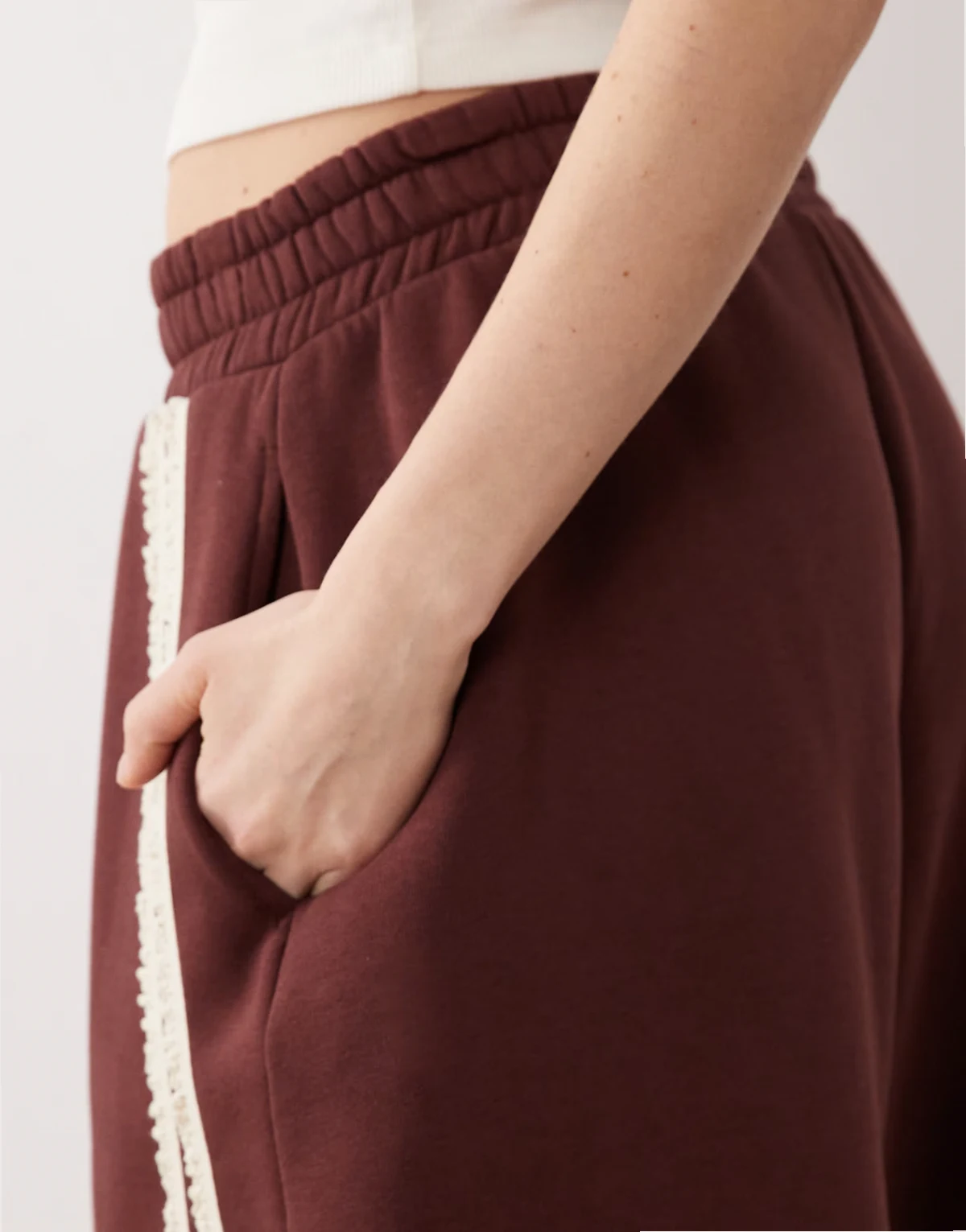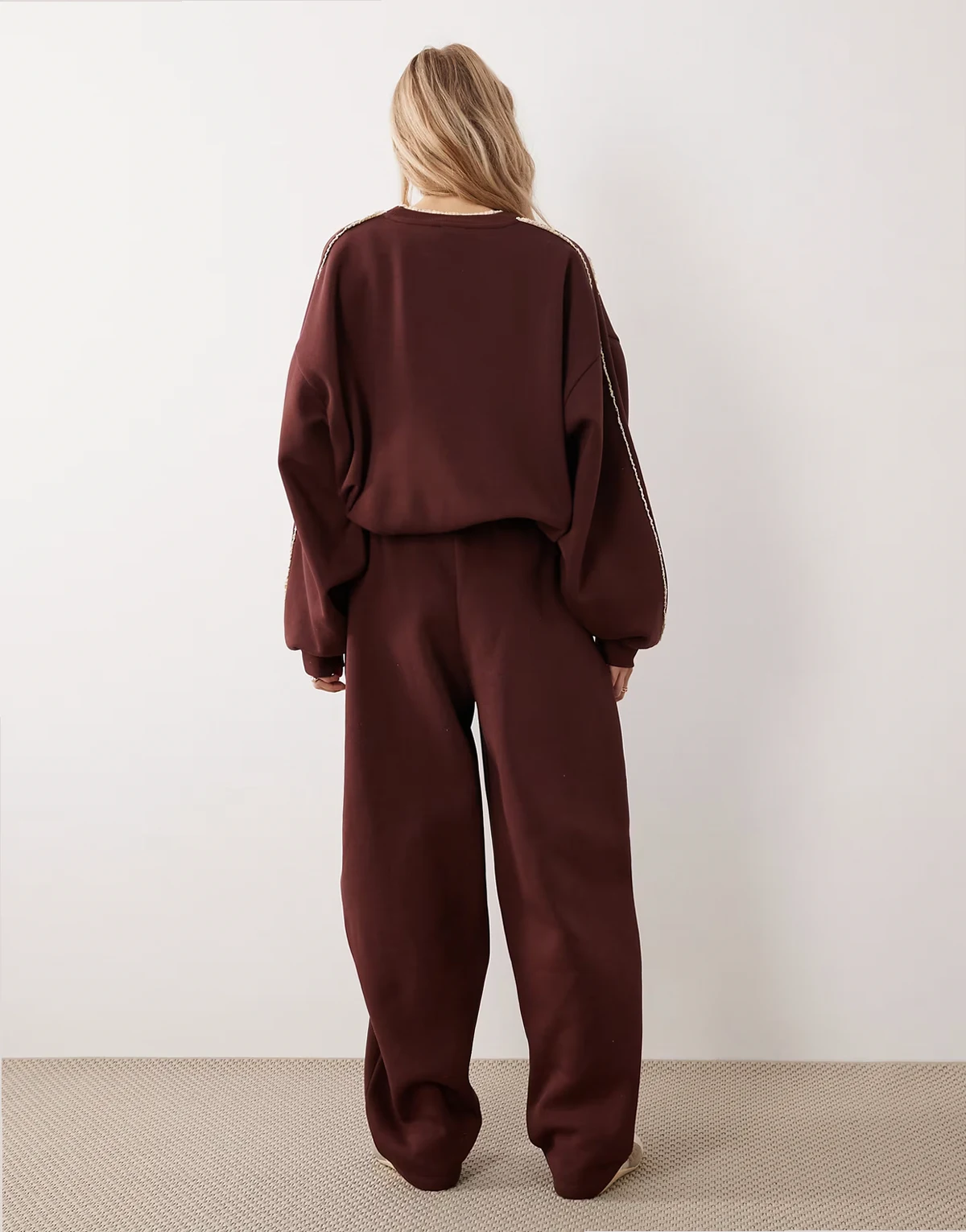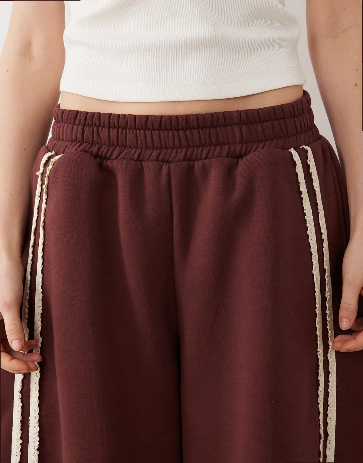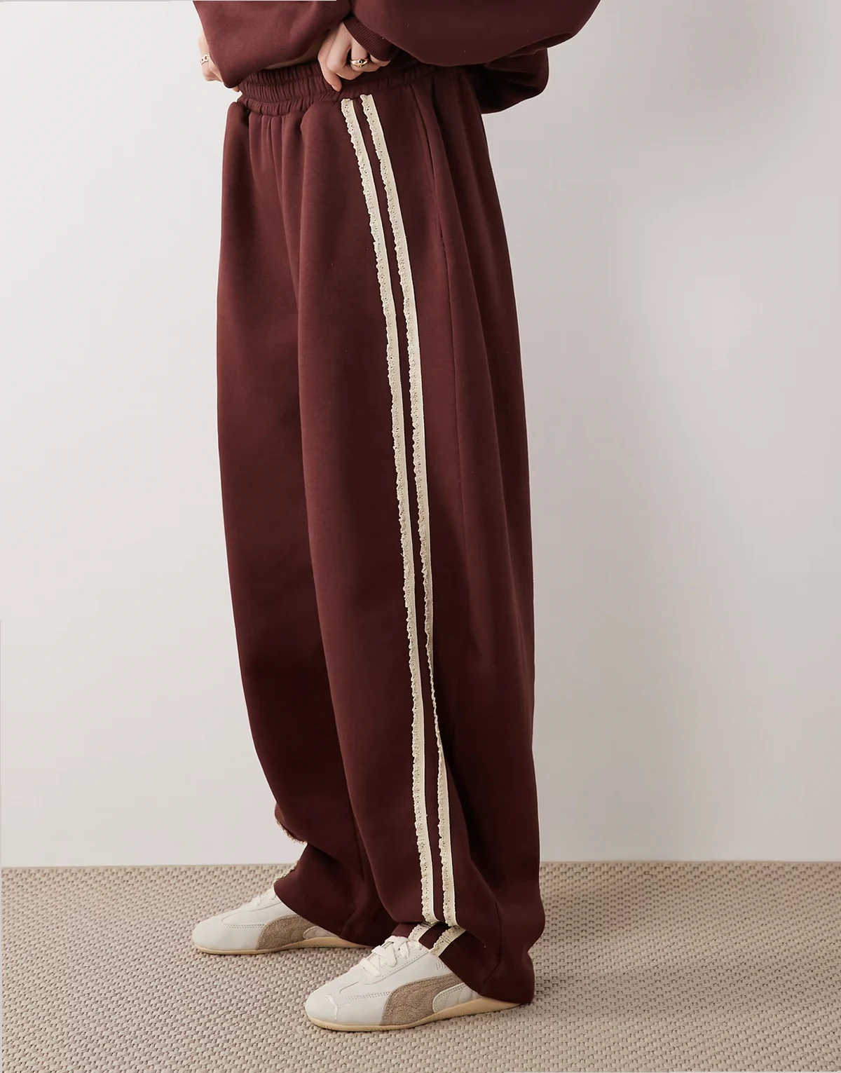 – Czekoladowe joggersy z szerokimi nogawkami i szydełkowaną koronką, część zestawu