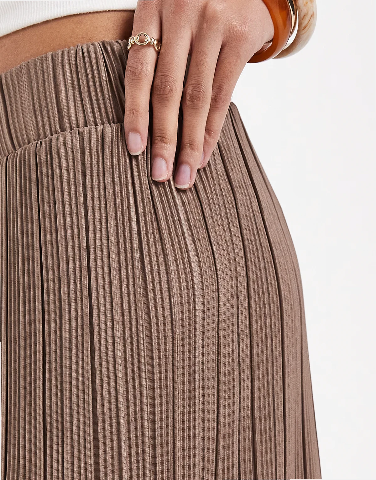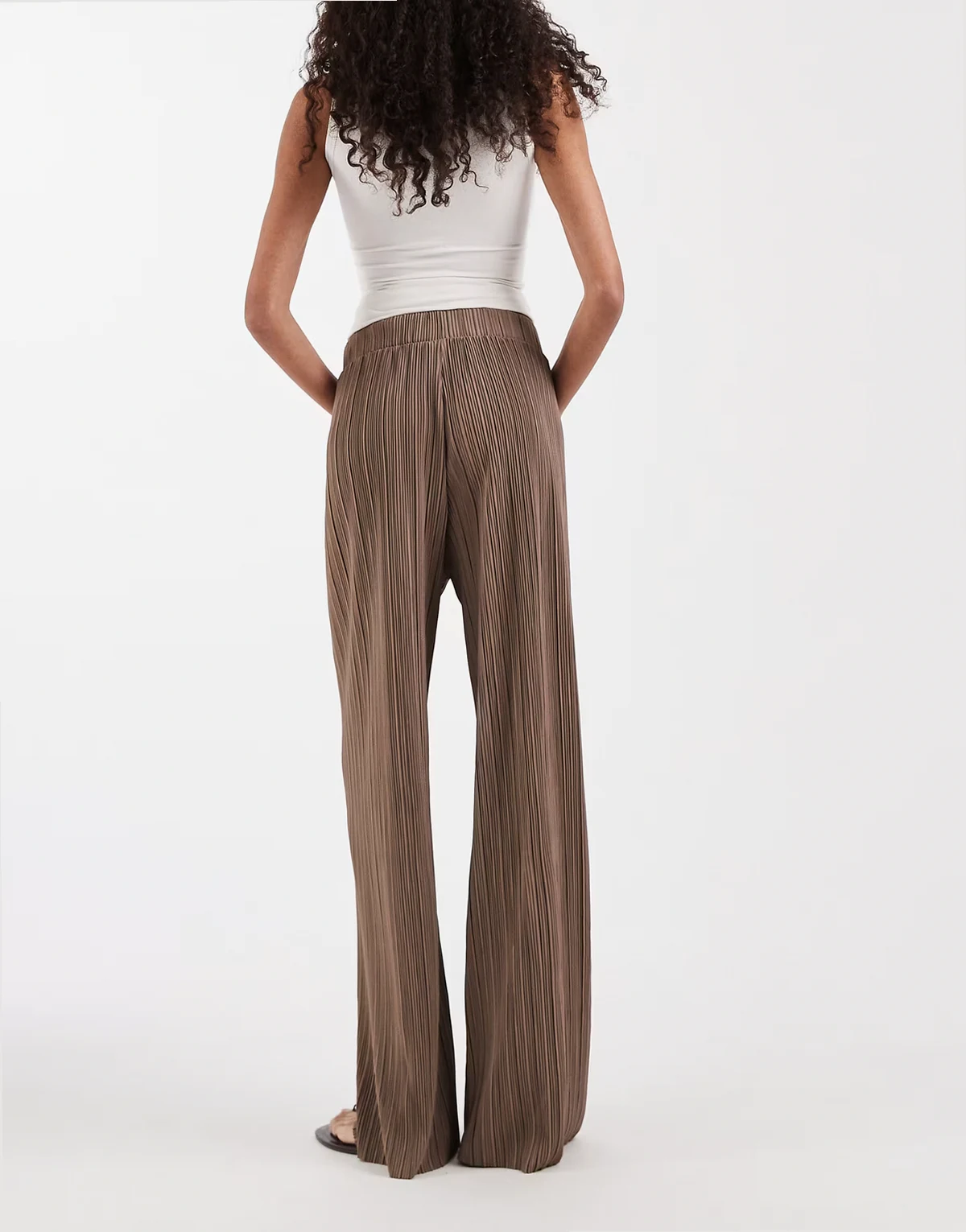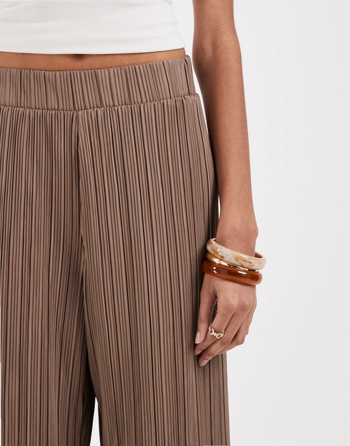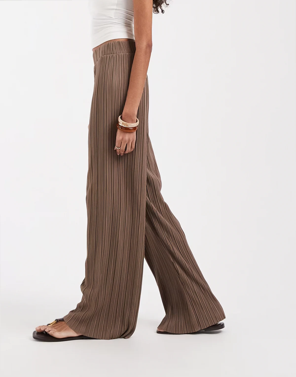 – Jasnobrązowe plisowane spodnie z szerokimi nogawkami