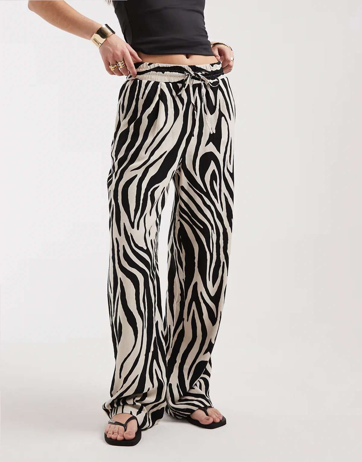 – Wiązane w talii spodnie z mieszanki lnu we wzór w paski zebry