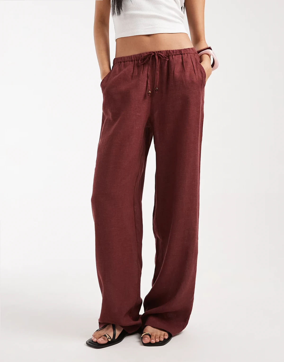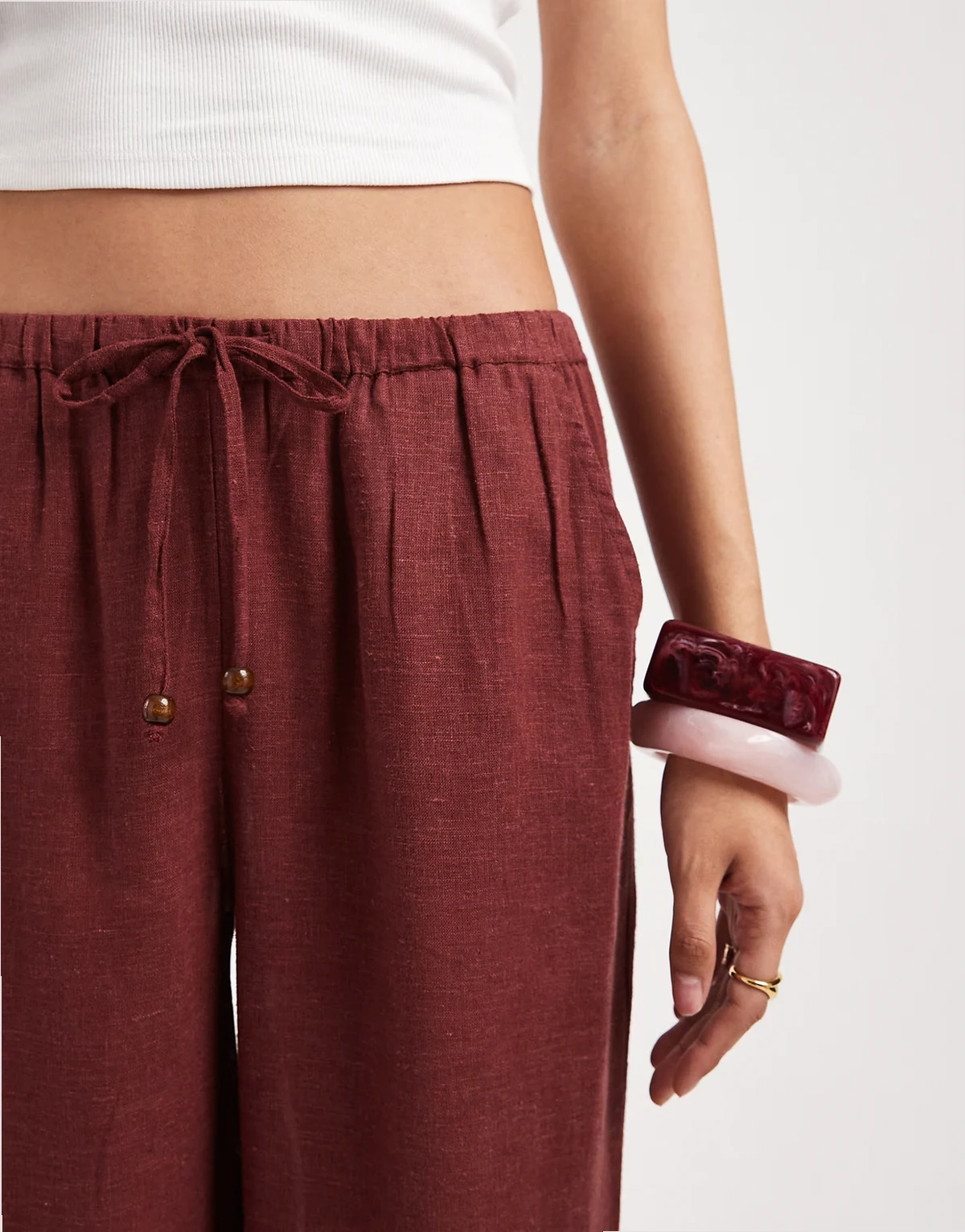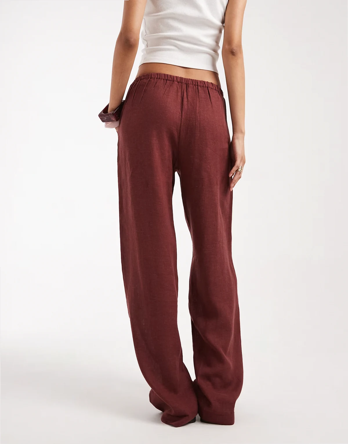 – Spodnie z szerokimi nogawkami z mieszanki lnu w rdzawym kolorze