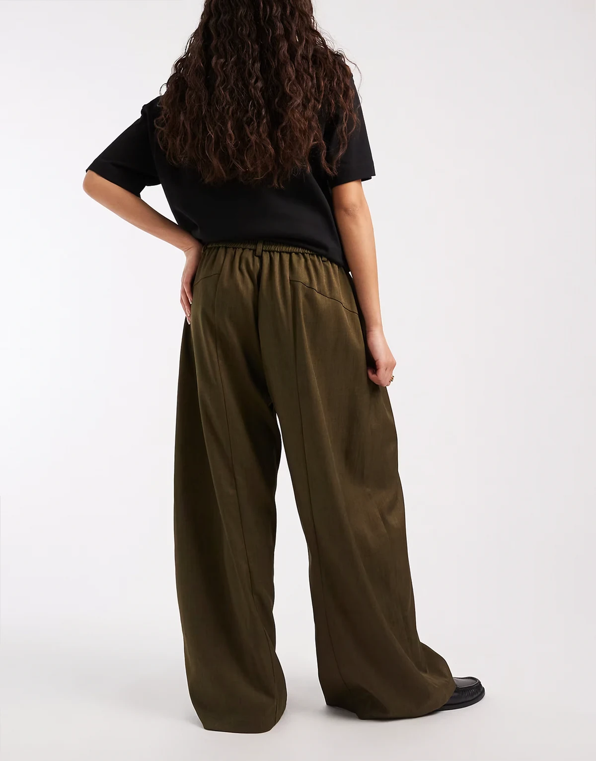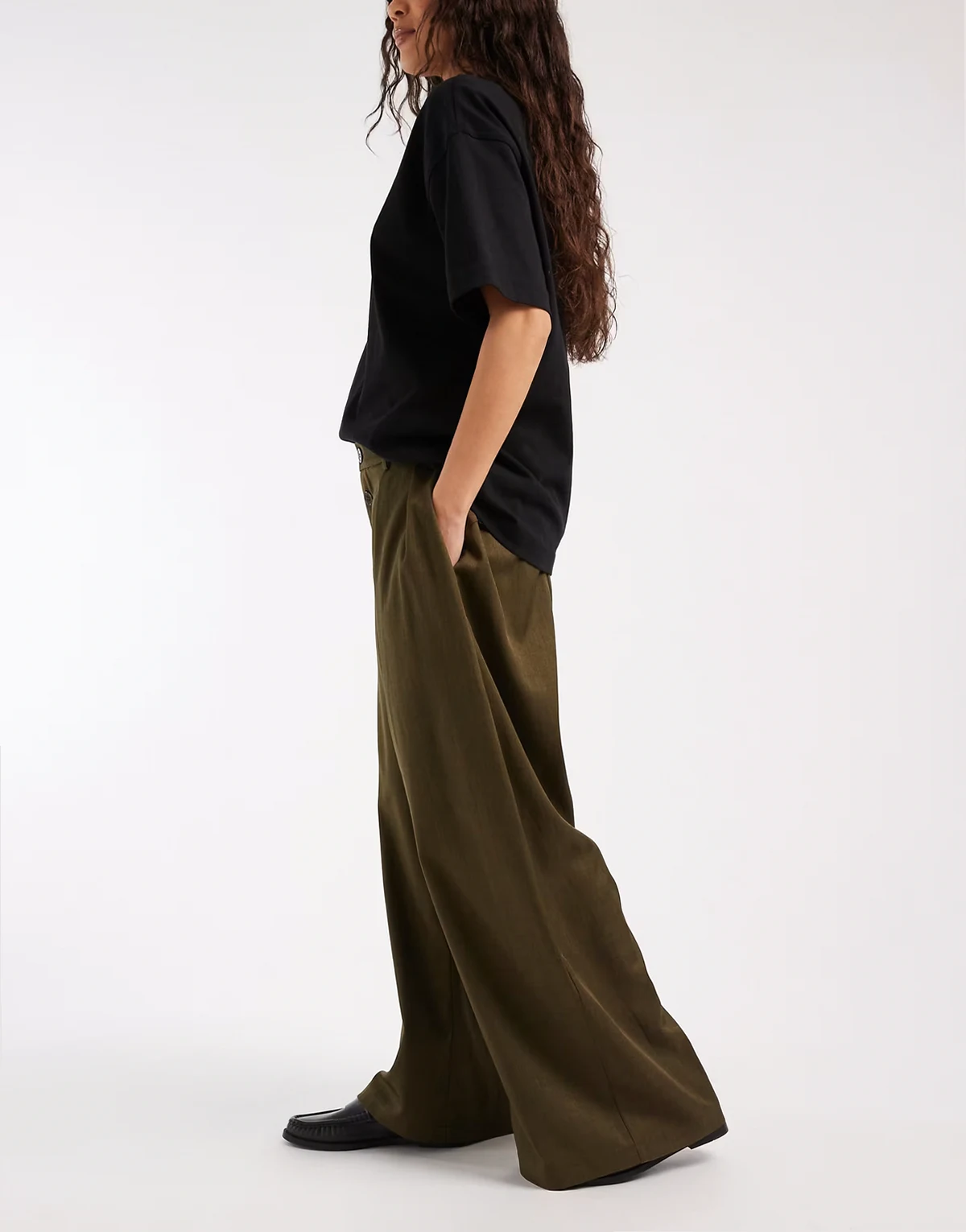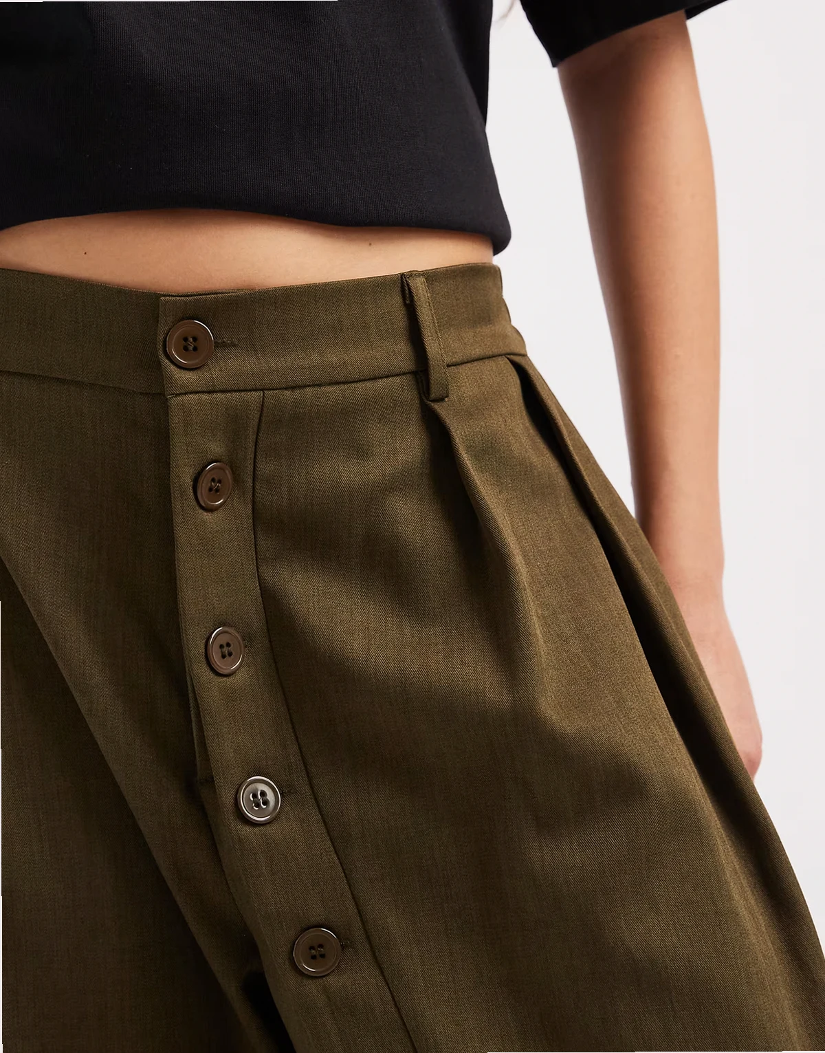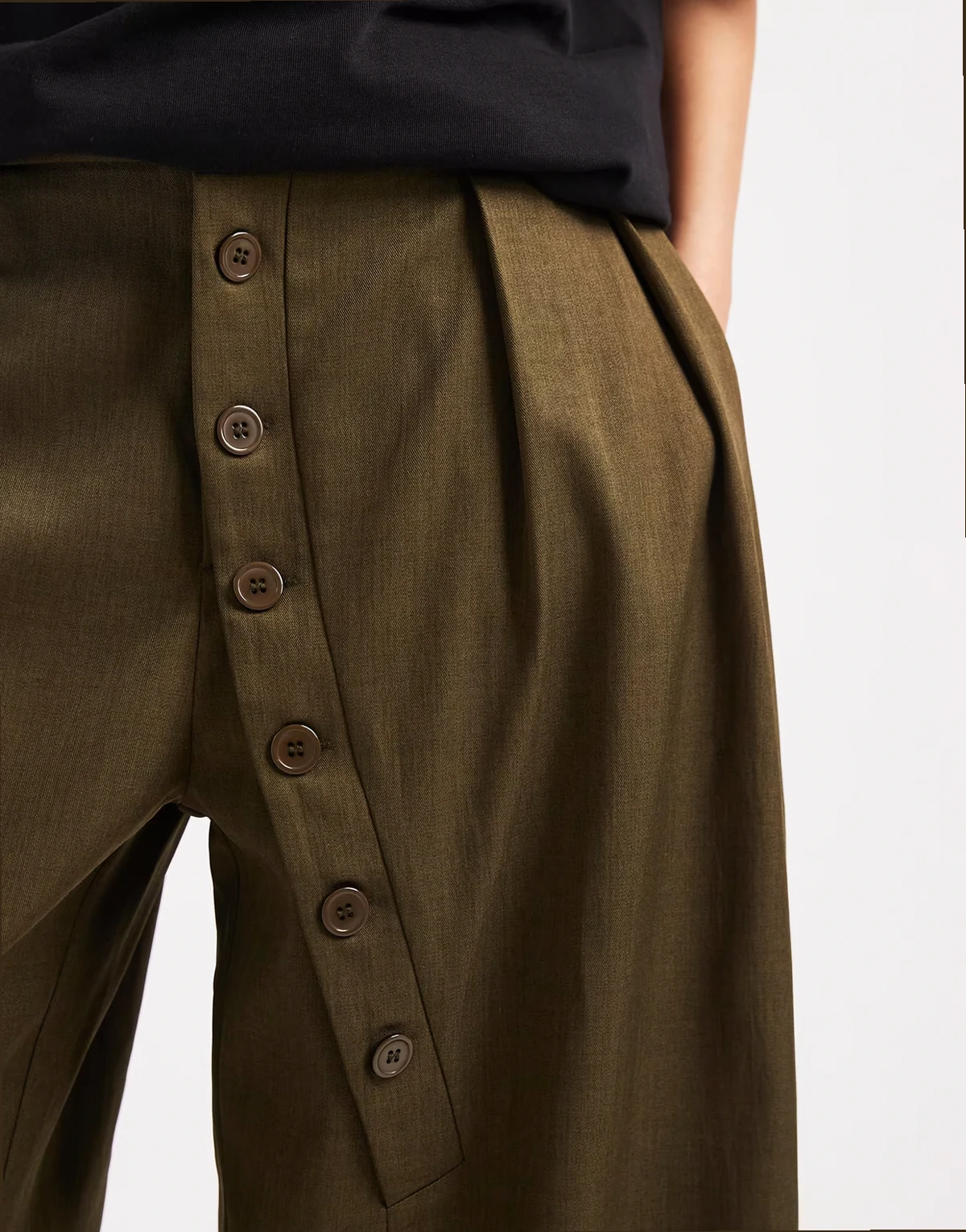– Spodnie z szerokimi nogawkami, średnim stanem i asymetrycznymi guzikami w oliwkowym odcieniu khaki